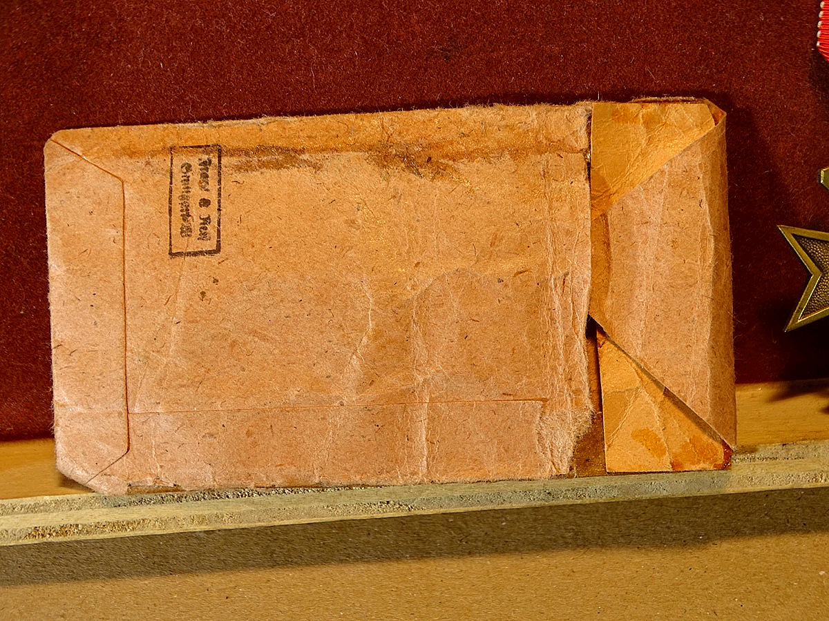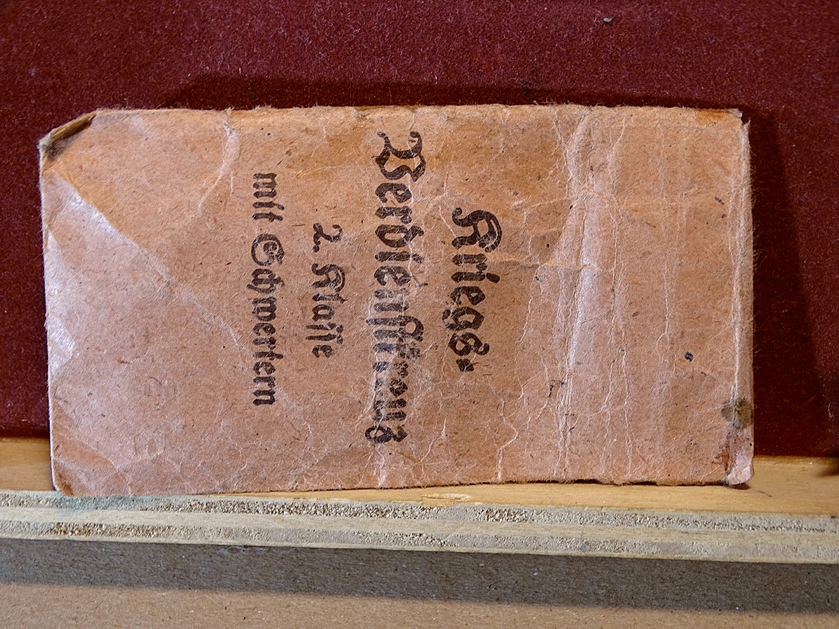 Kriegsverdienstkreuz in sehr schönem Zustand, Buntmetall. Ohne Marke aber wahrscheinlich zugehörig, da es bei Ankauf aus einem privaten Nachlass bereits darin war. Tüte mit Herstellermarke von Frank & Reif Stuttgart. Tüte mit deutlichen Nutzungsspuren, beide Seiten Innen an den Außenecken vom Vorbesitzer mit farblich passendem Papier hinterklebt. Wahrscheinlich waren die Kanten aufgescheuert. An Schließbereich ein Stück farblich passendes Papier eingeklebt. Zustand siehe Fotos.