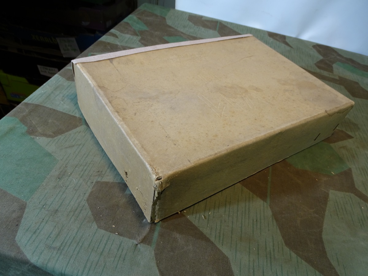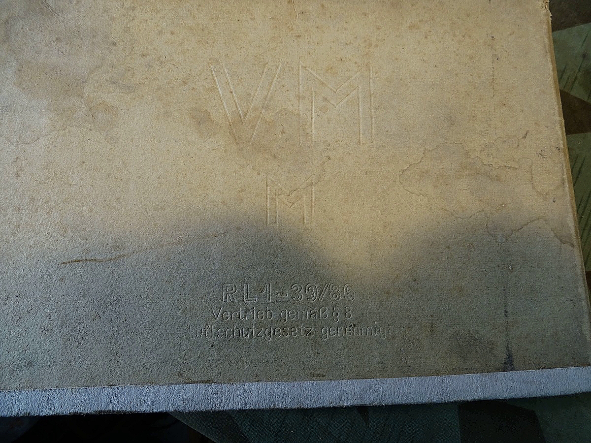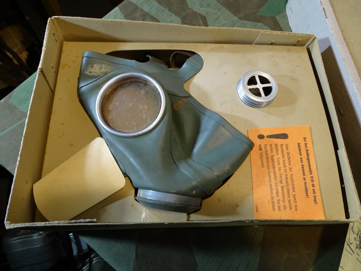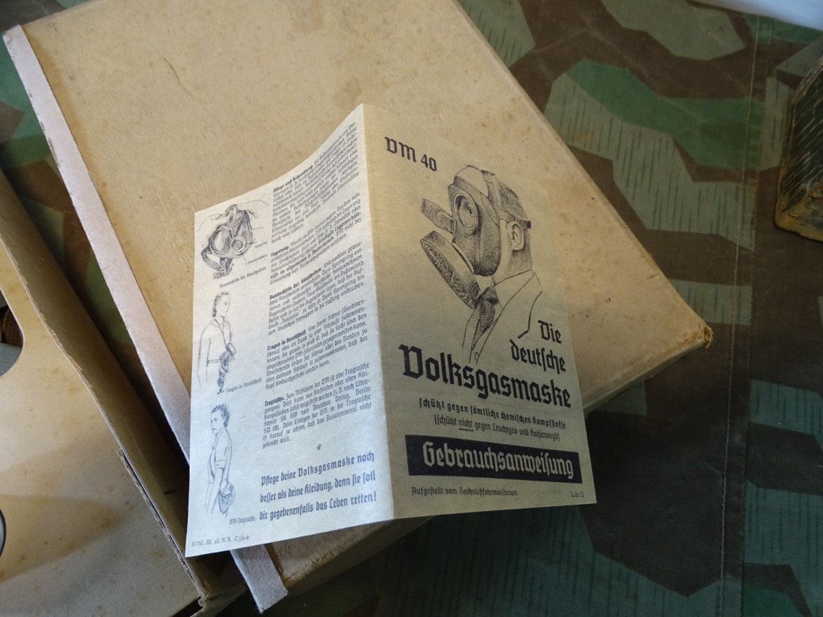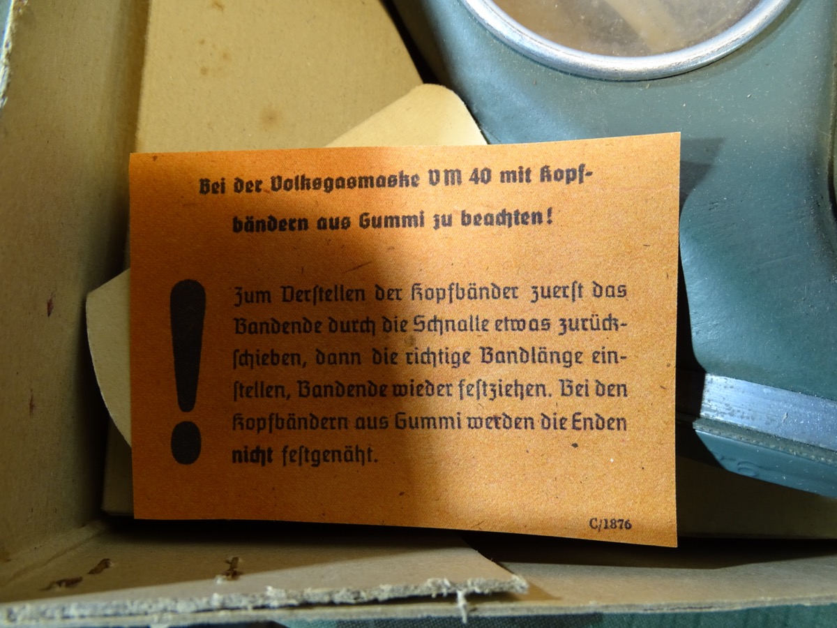 Luftschutz Deutsches Reich, Volksgasmaske in Pappkarton, mit Gebrauchsanweisung. orangem Hinweiszettel zum aufsetzen und Filter. Spätes Modell DM 40 "M" ( Für Männer) in grün mit Gummiberiemung. Maske und Filter sind schön mit Waa Adler und HK und anderen Markierungen gestempelt. Sehr schön erhaltener Filter. Karton mit Deckelprägung VM M und Reichsluftschutz Stempel. Seitlich eine Schadstelle im Karton, diese Zeitgenössich mit Pappe aus der Kriegszeit repariert worden. Sie erhalten genau das Stück vom Foto.