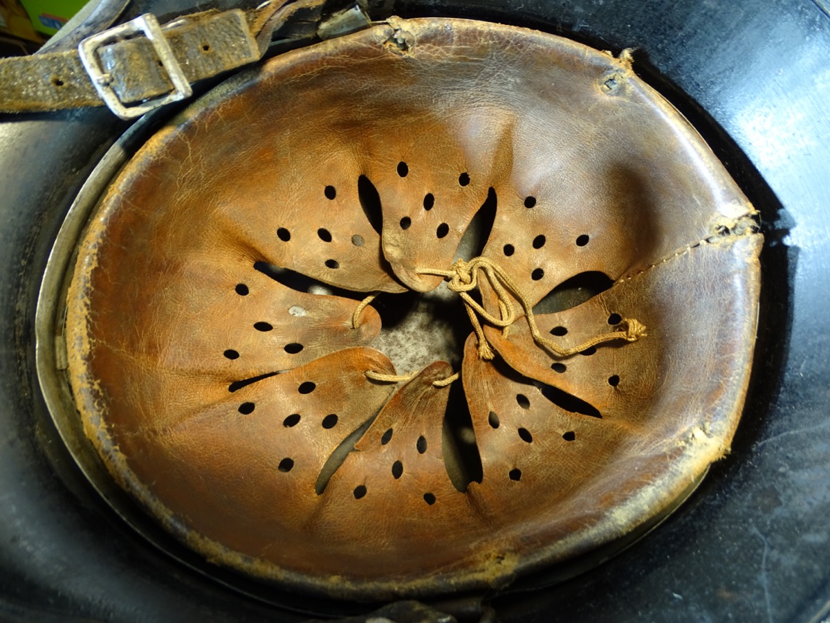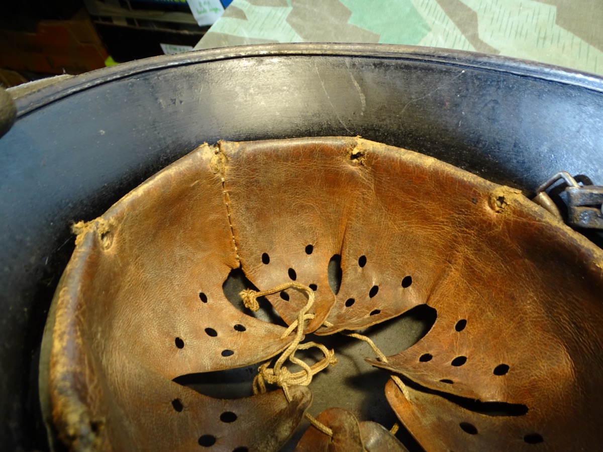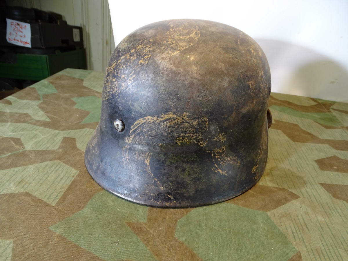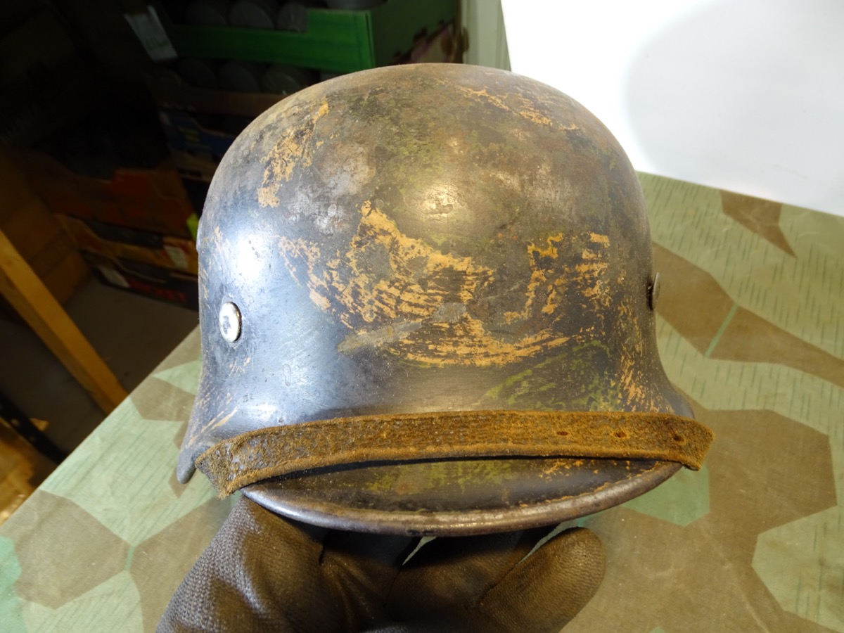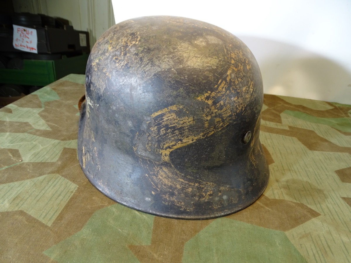 Für Nachkriegsnutzung in Feuerwehr schwarz überstrichen worden. Ein Teil der schwarzen Farbe wurde wieder vom Vorbesitzer entfernt. Darunter kam eine seltene, gesuchte, frontmässige Sommer Südfront Tarnung hervor. Sandgelbe, handgemalte Streifen auf grünem Grund und ein original Luftwaffen Emblem. Ein geschickter Restaurator kann ggf. noch weitere Teile der sandgelben/ grünen Tarnung und blaugrauen Grundfarbe freilegen. Innenleben und Kinnriemen sind original zugehörig. Im Leder ein paar Löcher vom anbringen eines Feuerwehr Nackenleders. Herstellermarke ET 64 für Eisenwerke Thale und Glockengröße 64. Im Nacken mit Seriennummer. Innenrand schwarz, mittig feldgrau oder blaugrau, nicht klar zu sagen.