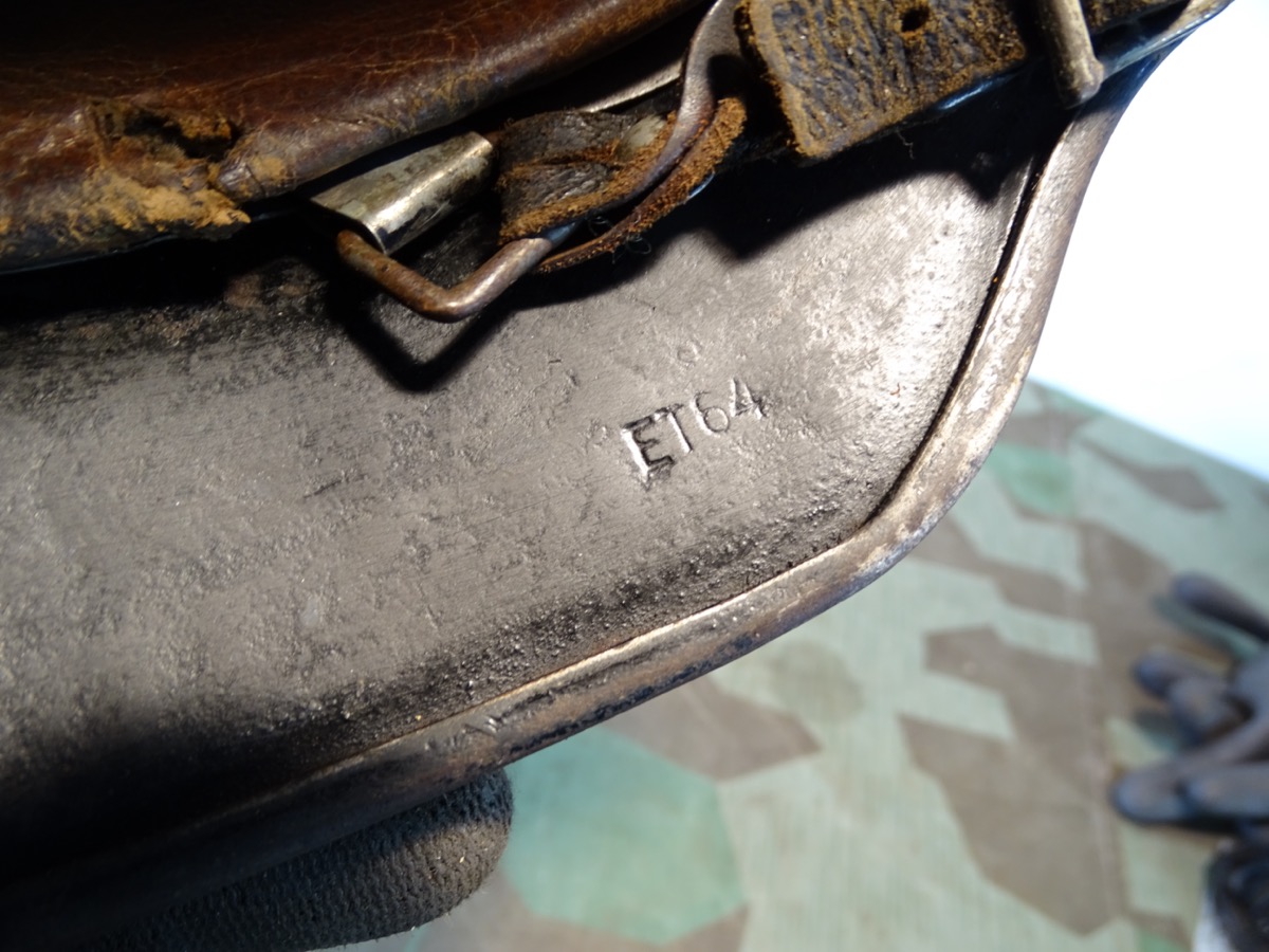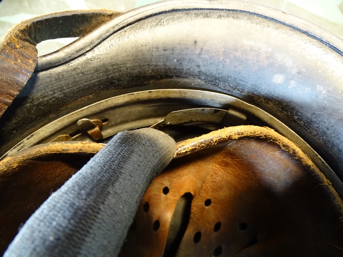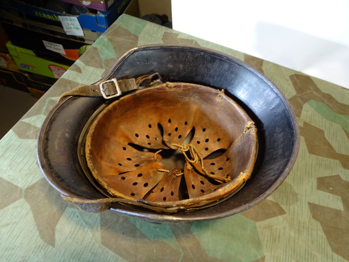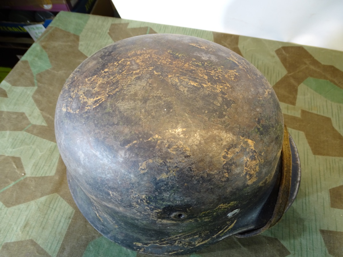 Für Nachkriegsnutzung in Feuerwehr schwarz überstrichen worden. Ein Teil der schwarzen Farbe wurde wieder vom Vorbesitzer entfernt. Darunter kam eine seltene, gesuchte, frontmässige Sommer Südfront Tarnung hervor. Sandgelbe, handgemalte Streifen auf grünem Grund und ein original Luftwaffen Emblem. Ein geschickter Restaurator kann ggf. noch weitere Teile der sandgelben/ grünen Tarnung und blaugrauen Grundfarbe freilegen. Innenleben und Kinnriemen sind original zugehörig. Im Leder ein paar Löcher vom anbringen eines Feuerwehr Nackenleders. Herstellermarke ET 64 für Eisenwerke Thale und Glockengröße 64. Im Nacken mit Seriennummer. Innenrand schwarz, mittig feldgrau oder blaugrau, nicht klar zu sagen.