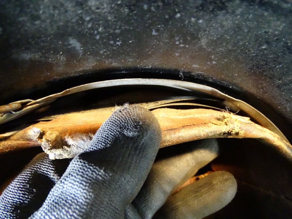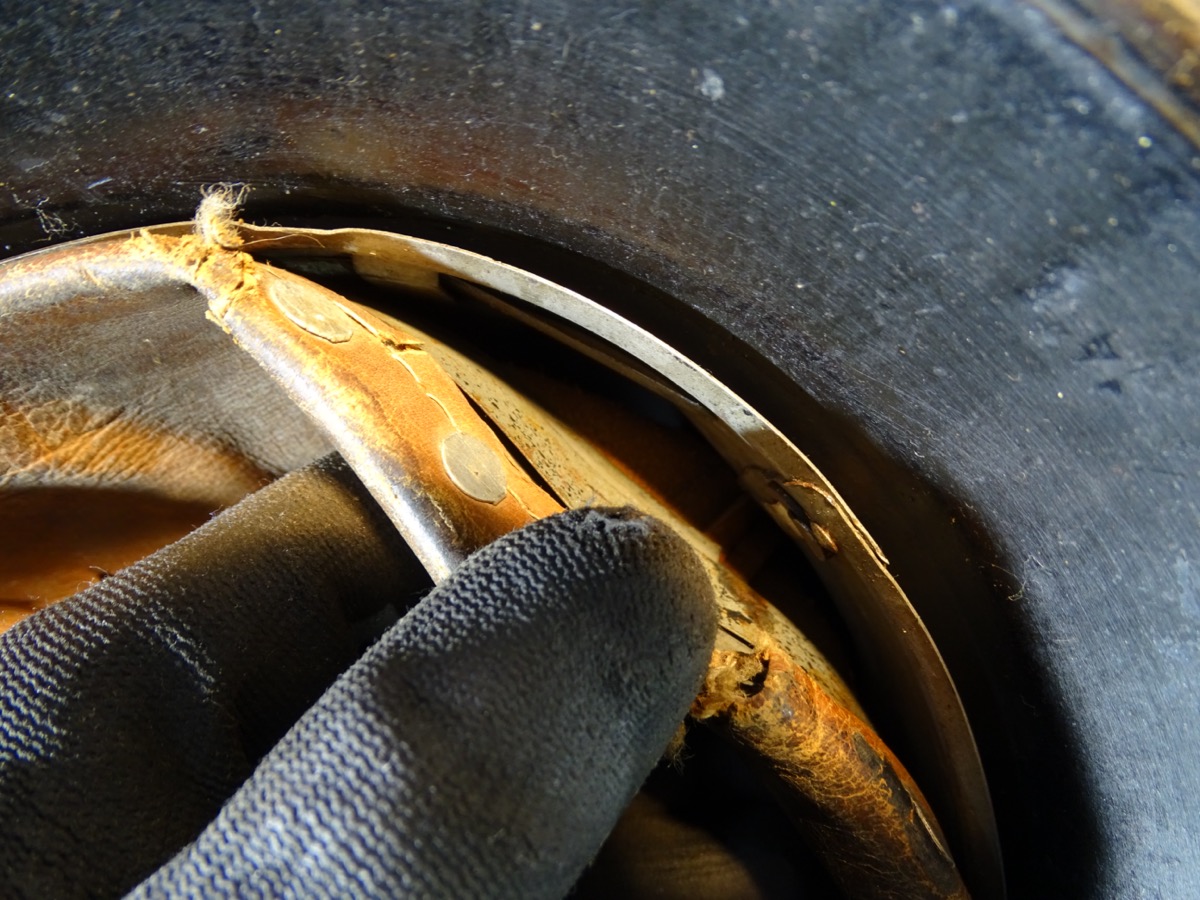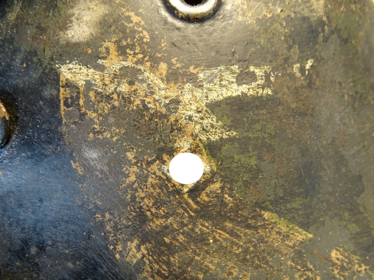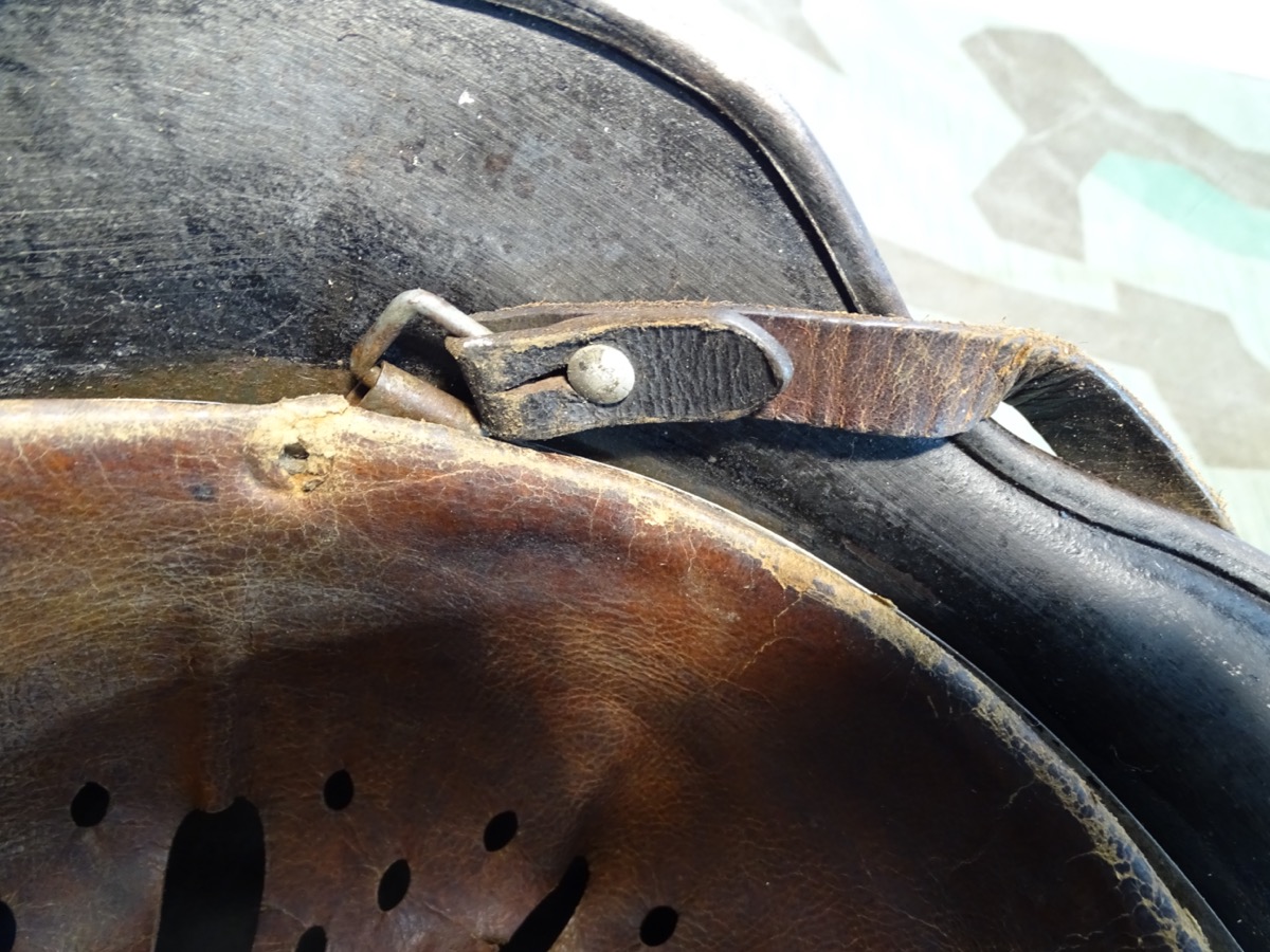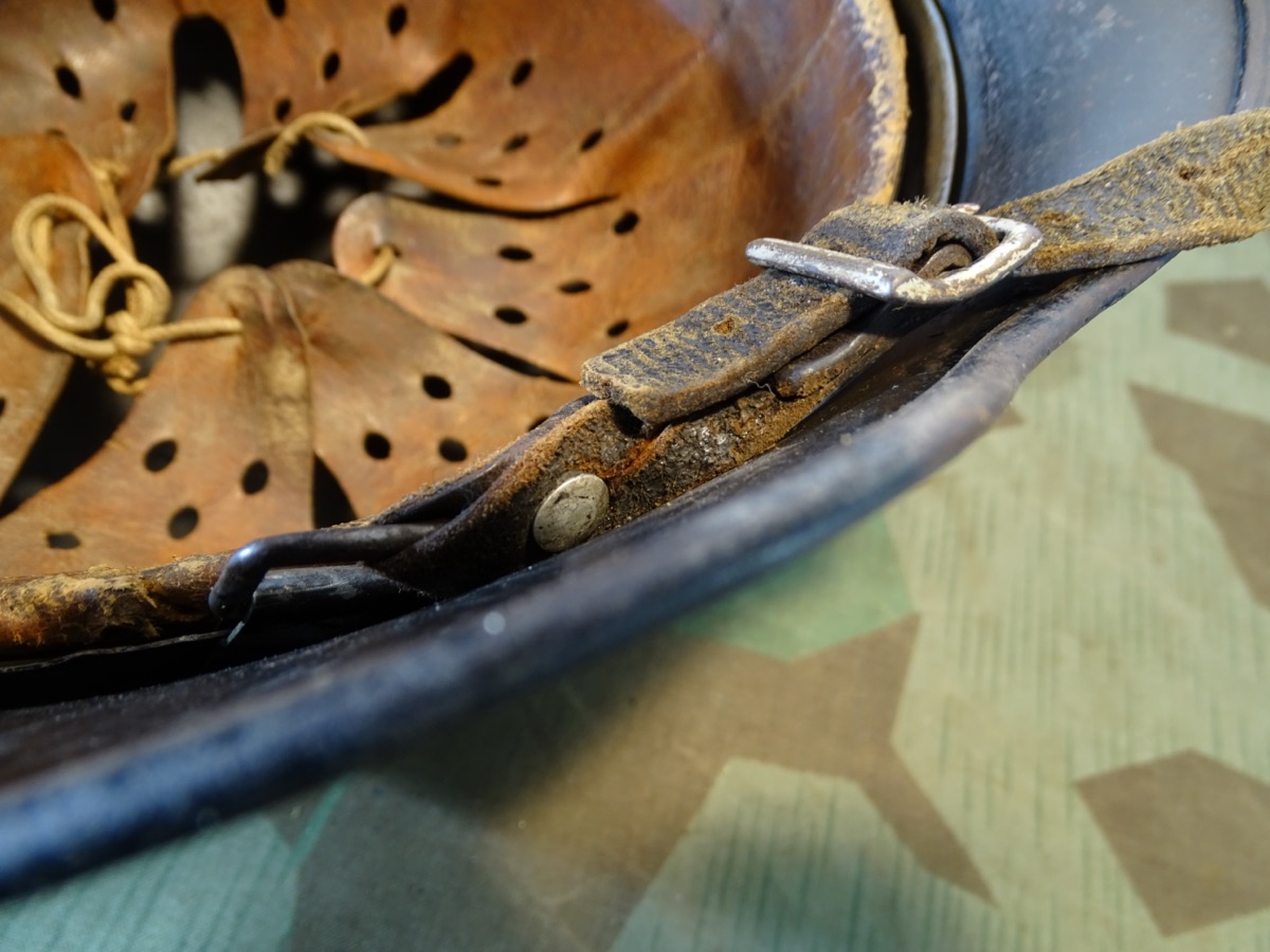 Für Nachkriegsnutzung in Feuerwehr schwarz überstrichen worden. Ein Teil der schwarzen Farbe wurde wieder vom Vorbesitzer entfernt. Darunter kam eine seltene, gesuchte, frontmässige Sommer Südfront Tarnung hervor. Sandgelbe, handgemalte Streifen auf grünem Grund und ein original Luftwaffen Emblem. Ein geschickter Restaurator kann ggf. noch weitere Teile der sandgelben/ grünen Tarnung und blaugrauen Grundfarbe freilegen. Innenleben und Kinnriemen sind original zugehörig. Im Leder ein paar Löcher vom anbringen eines Feuerwehr Nackenleders. Herstellermarke ET 64 für Eisenwerke Thale und Glockengröße 64. Im Nacken mit Seriennummer. Innenrand schwarz, mittig feldgrau oder blaugrau, nicht klar zu sagen.