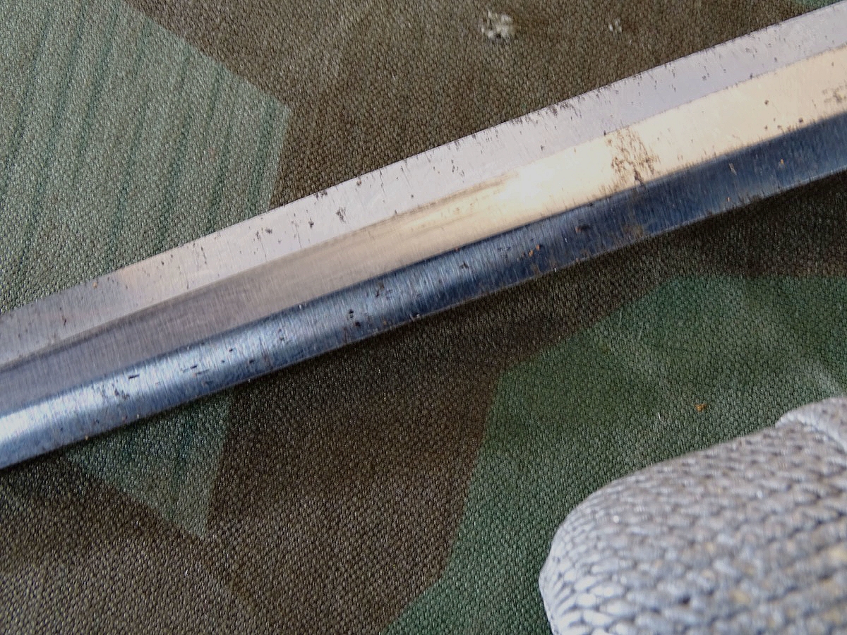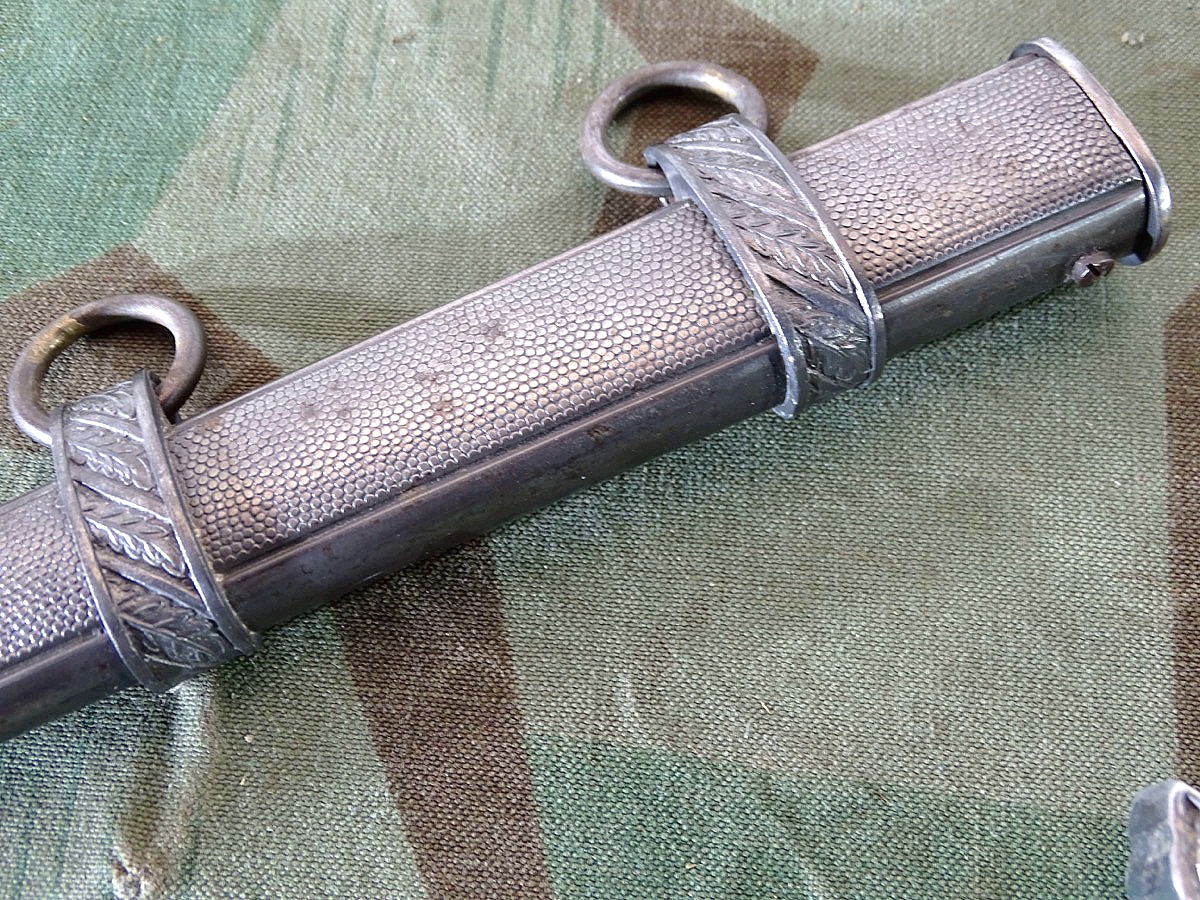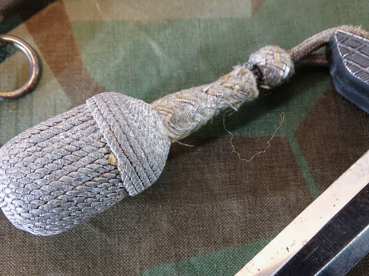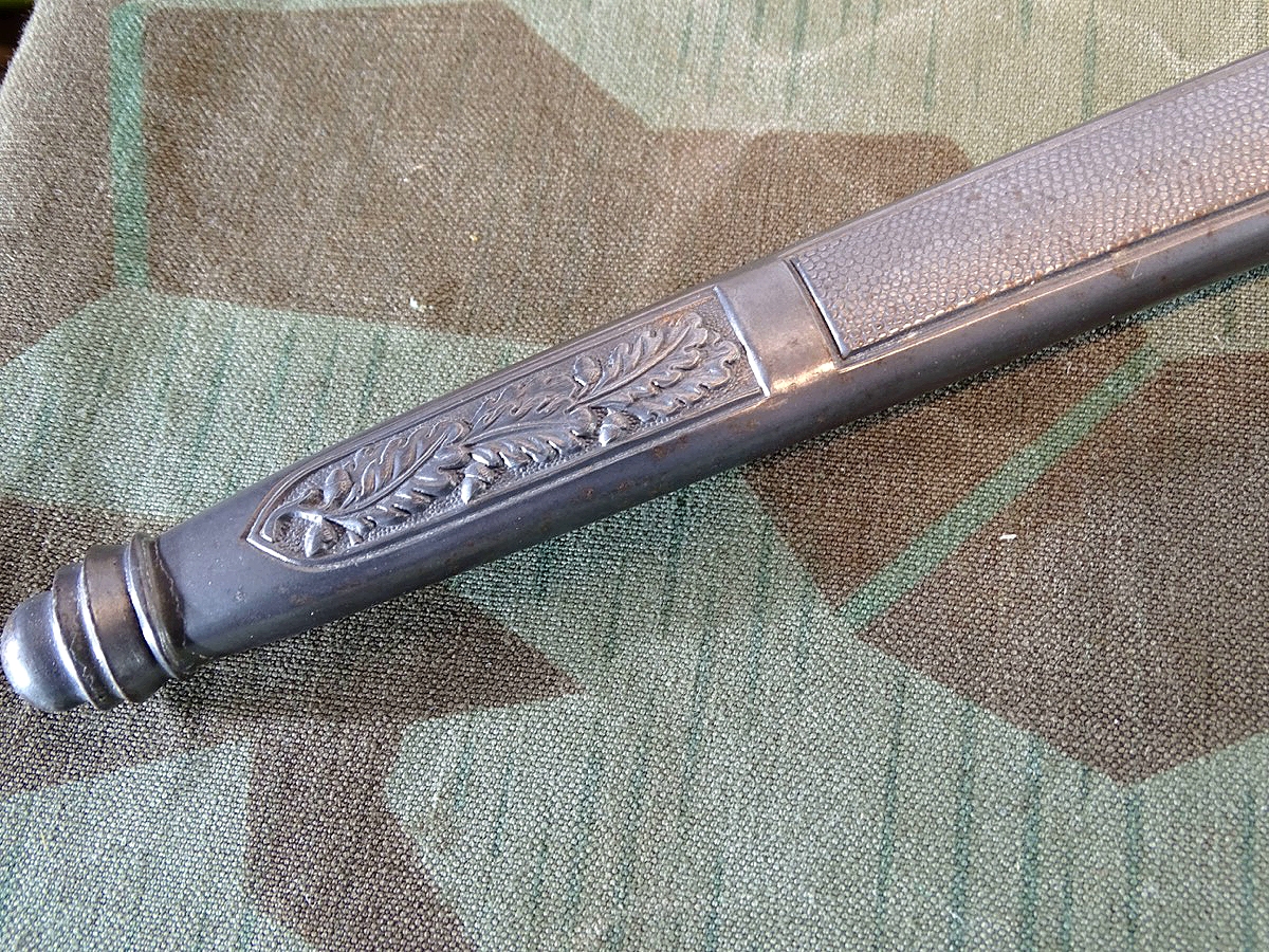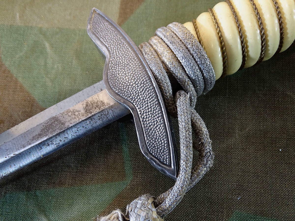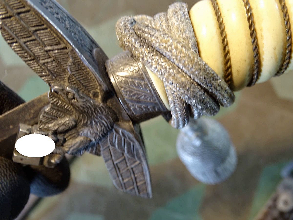 Zustand siehe Fotos. Der Griff ist frei von Abplatzern, und die Scheide weist keine Dellen auf. Weißer Kunststoffgriff, Wicklung erhalten, mit Feinzink Beschlägen, das HK unter dem Adler ist im unteren Teil von Tragung etwas heller gerieben, oben noch dunkel getönt, schöner Tragebeleg. Blanke, glatte Klinge ohne Herstellermarke mit ein paar nutzungsbedingten, leicht pattinierten Stellen, siehe Fotos. Scheide: Eisen mit Feinzink Beschlägen. Portepee deutlich getragen. Gehänge in gutem Zustand, Schöne handgepunzte Bandaufhängungen mit Eichenlaubdecor und DRGM Stempel. Gehänge mit normalen Tragespuren. Bei Bestellung bitte Altersnachweis senden (Kopie vom Personalausweis).