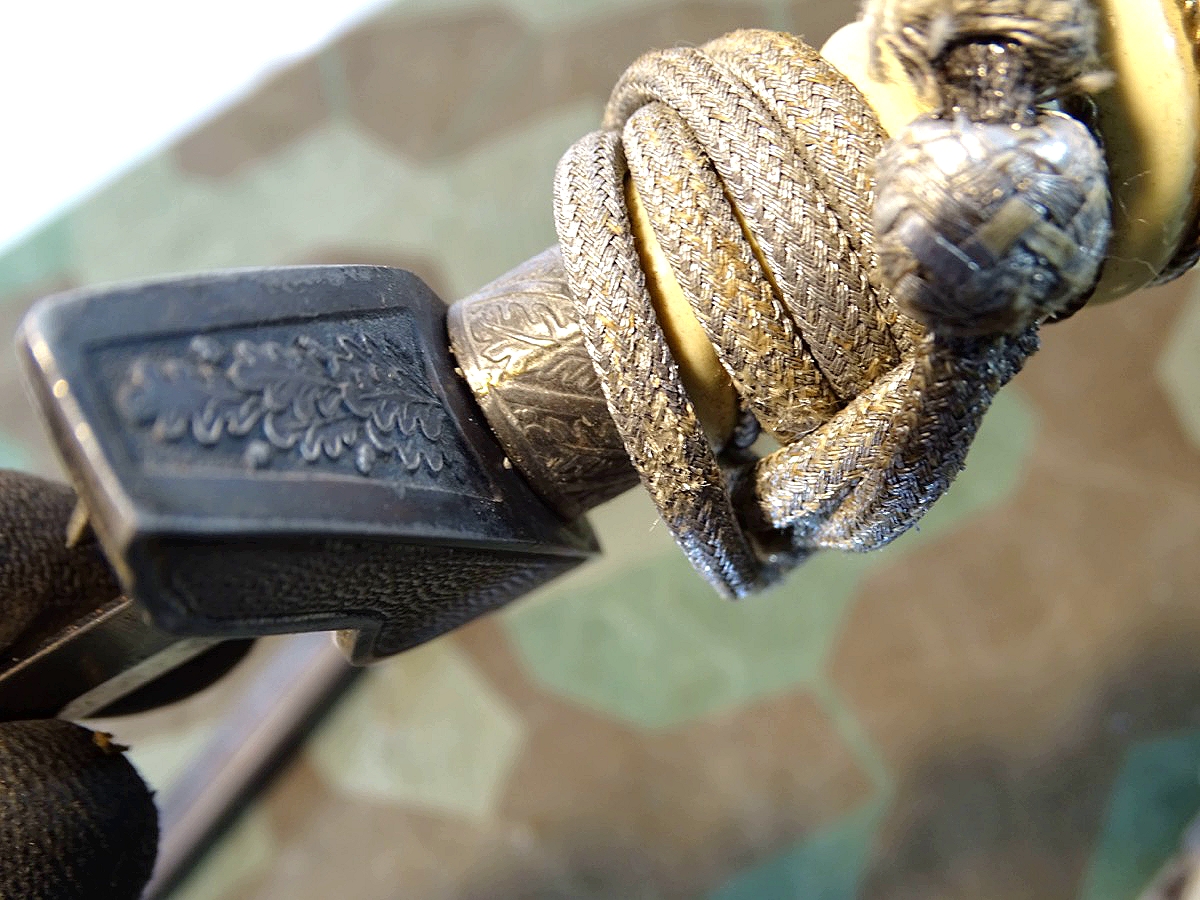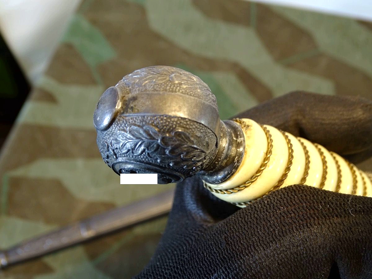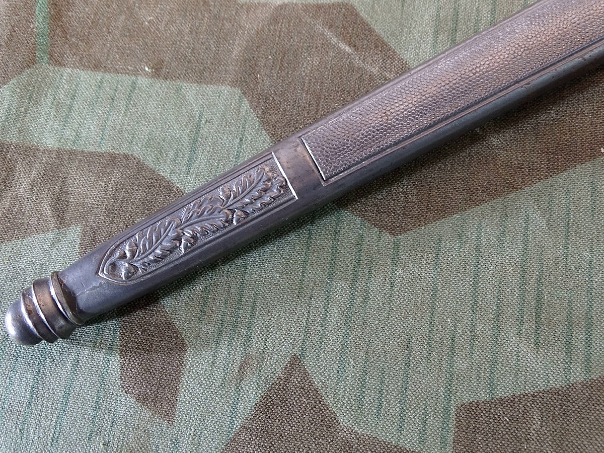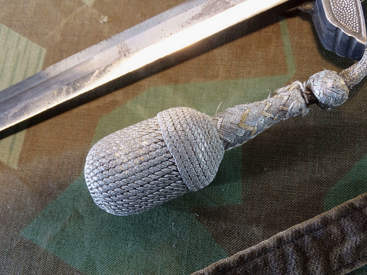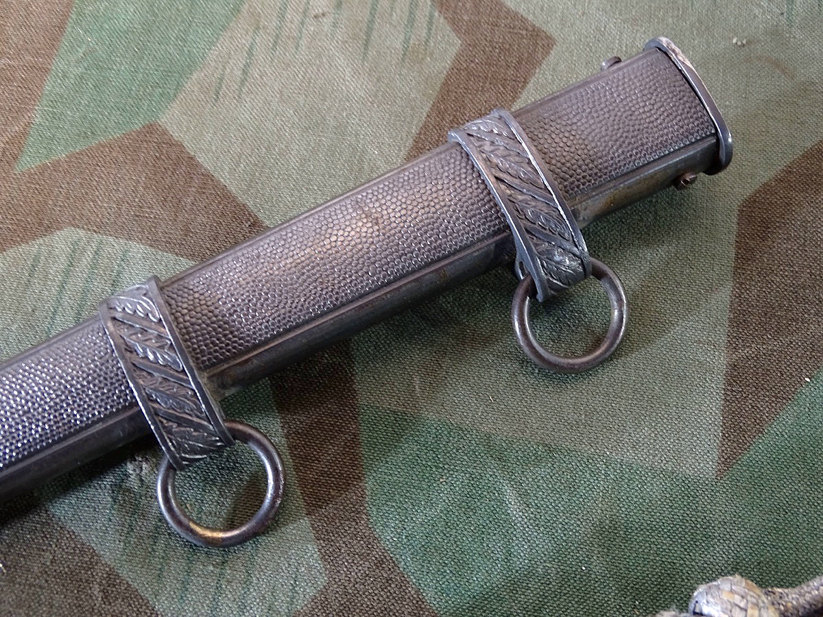 Zustand siehe Fotos. Der Griff ist frei von Abplatzern, und die Scheide weist keine Dellen auf. Weißer Kunststoffgriff, Wicklung erhalten, mit Feinzink Beschlägen, das HK unter dem Adler ist im unteren Teil von Tragung etwas heller gerieben, oben noch dunkel getönt, schöner Tragebeleg. Blanke, glatte Klinge ohne Herstellermarke mit ein paar nutzungsbedingten, leicht pattinierten Stellen, siehe Fotos. Scheide: Eisen mit Feinzink Beschlägen. Portepee deutlich getragen. Gehänge in gutem Zustand, Schöne handgepunzte Bandaufhängungen mit Eichenlaubdecor und DRGM Stempel. Gehänge mit normalen Tragespuren. Bei Bestellung bitte Altersnachweis senden (Kopie vom Personalausweis).