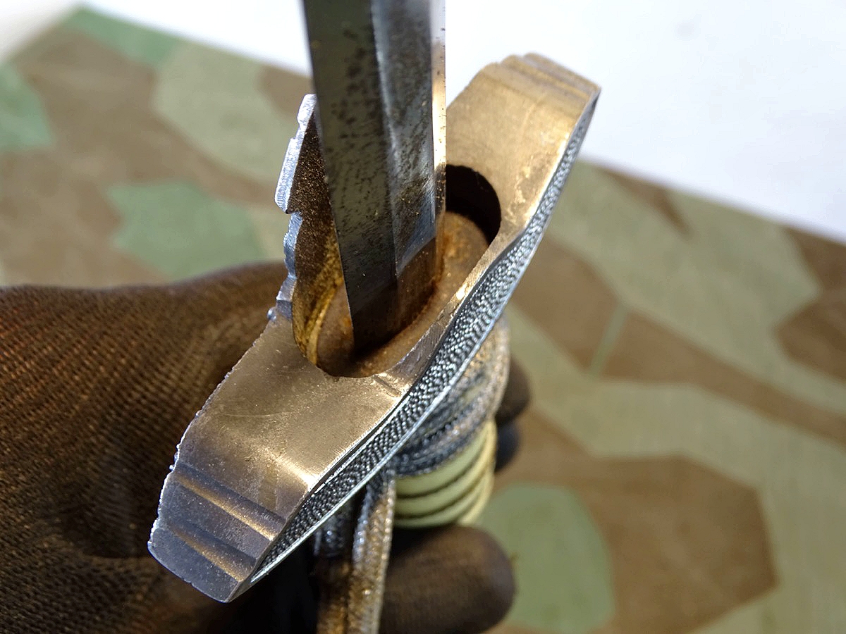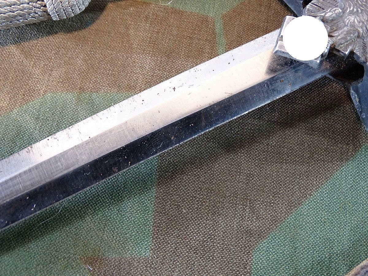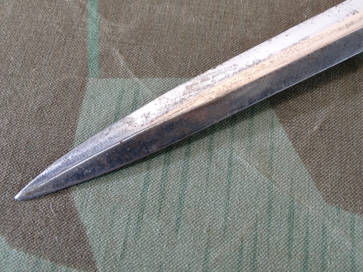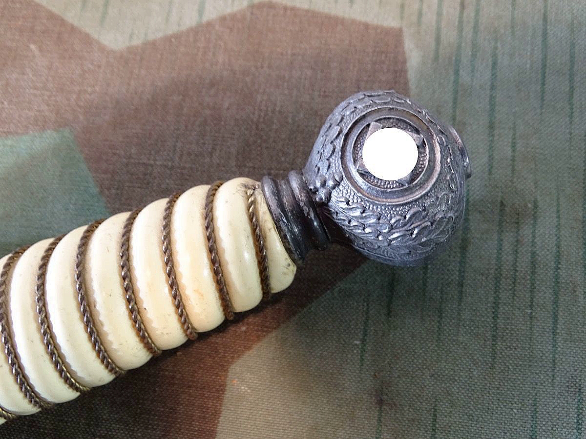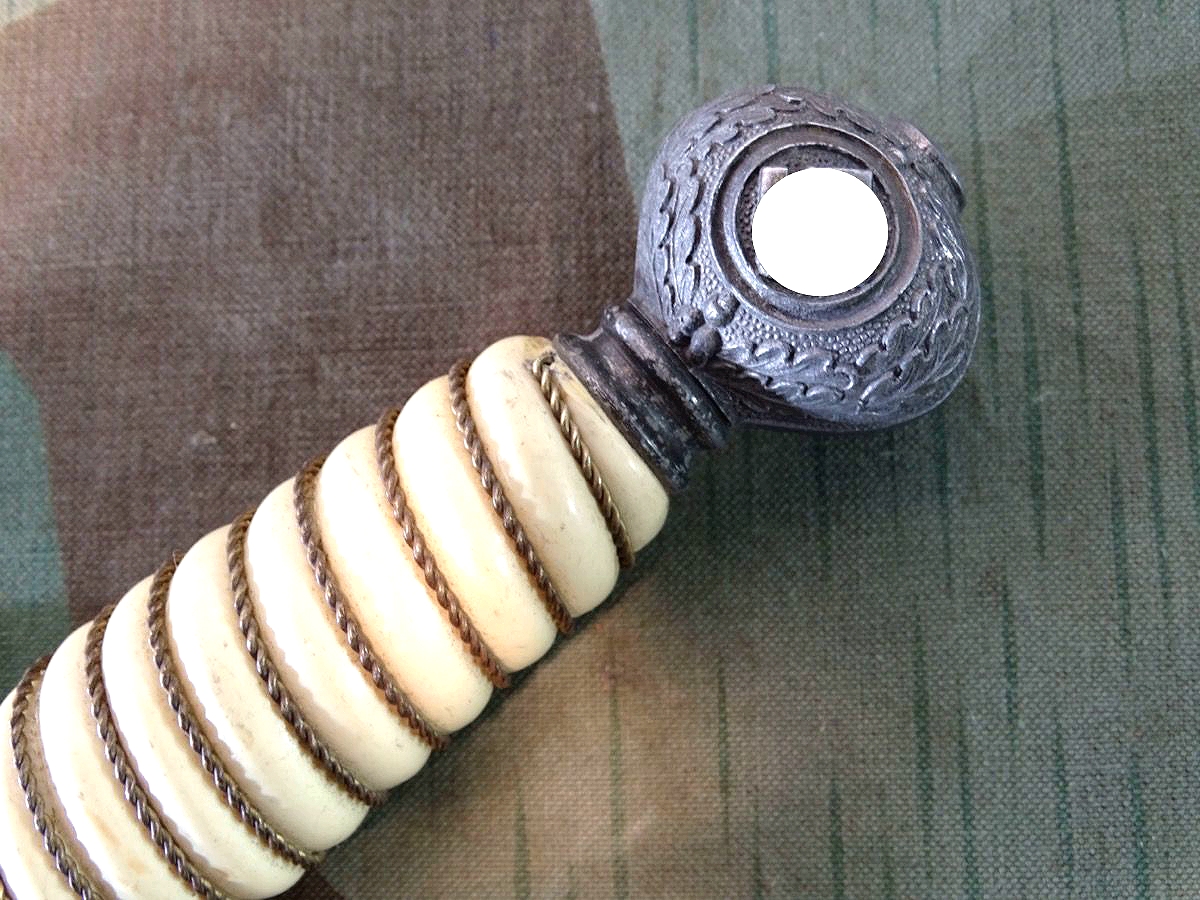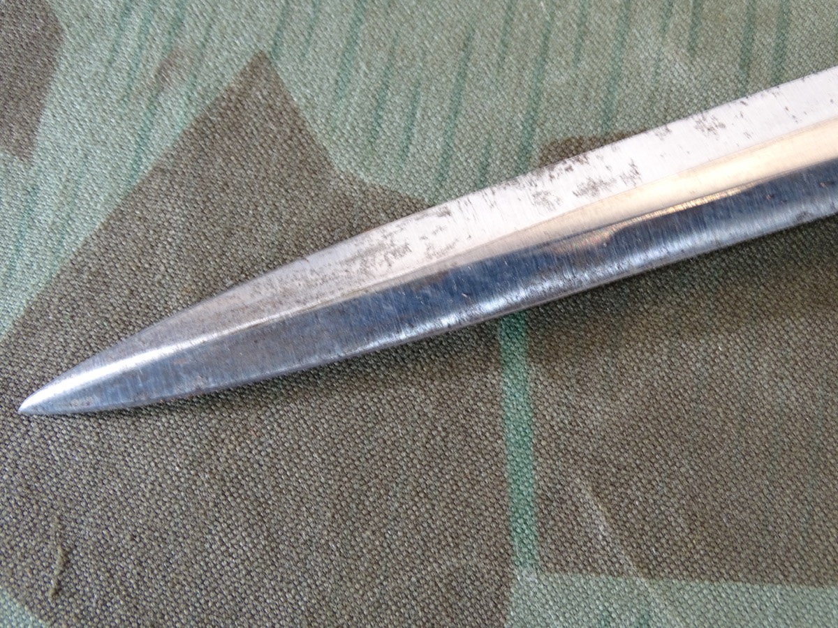 Zustand siehe Fotos. Der Griff ist frei von Abplatzern, und die Scheide weist keine Dellen auf. Weißer Kunststoffgriff, Wicklung erhalten, mit Feinzink Beschlägen, das HK unter dem Adler ist im unteren Teil von Tragung etwas heller gerieben, oben noch dunkel getönt, schöner Tragebeleg. Blanke, glatte Klinge ohne Herstellermarke mit ein paar nutzungsbedingten, leicht pattinierten Stellen, siehe Fotos. Scheide: Eisen mit Feinzink Beschlägen. Portepee deutlich getragen. Gehänge in gutem Zustand, Schöne handgepunzte Bandaufhängungen mit Eichenlaubdecor und DRGM Stempel. Gehänge mit normalen Tragespuren. Bei Bestellung bitte Altersnachweis senden (Kopie vom Personalausweis).