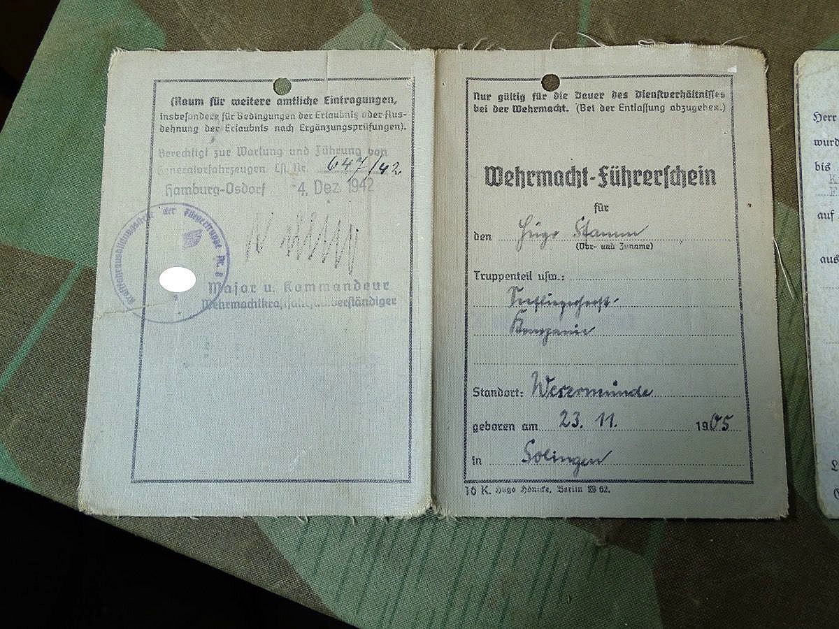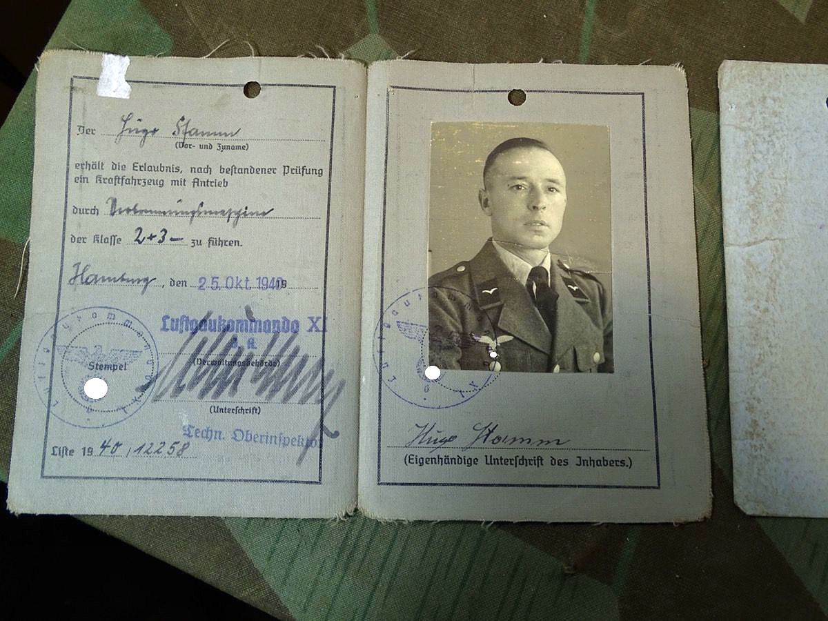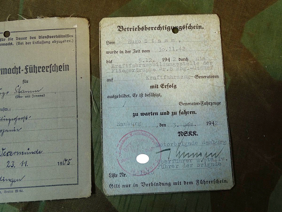 Luftwaffen u. NSKK Führerschein Hugo St. aus SG, Standort Warnemünde, Kl.2+3, Generator KFZ