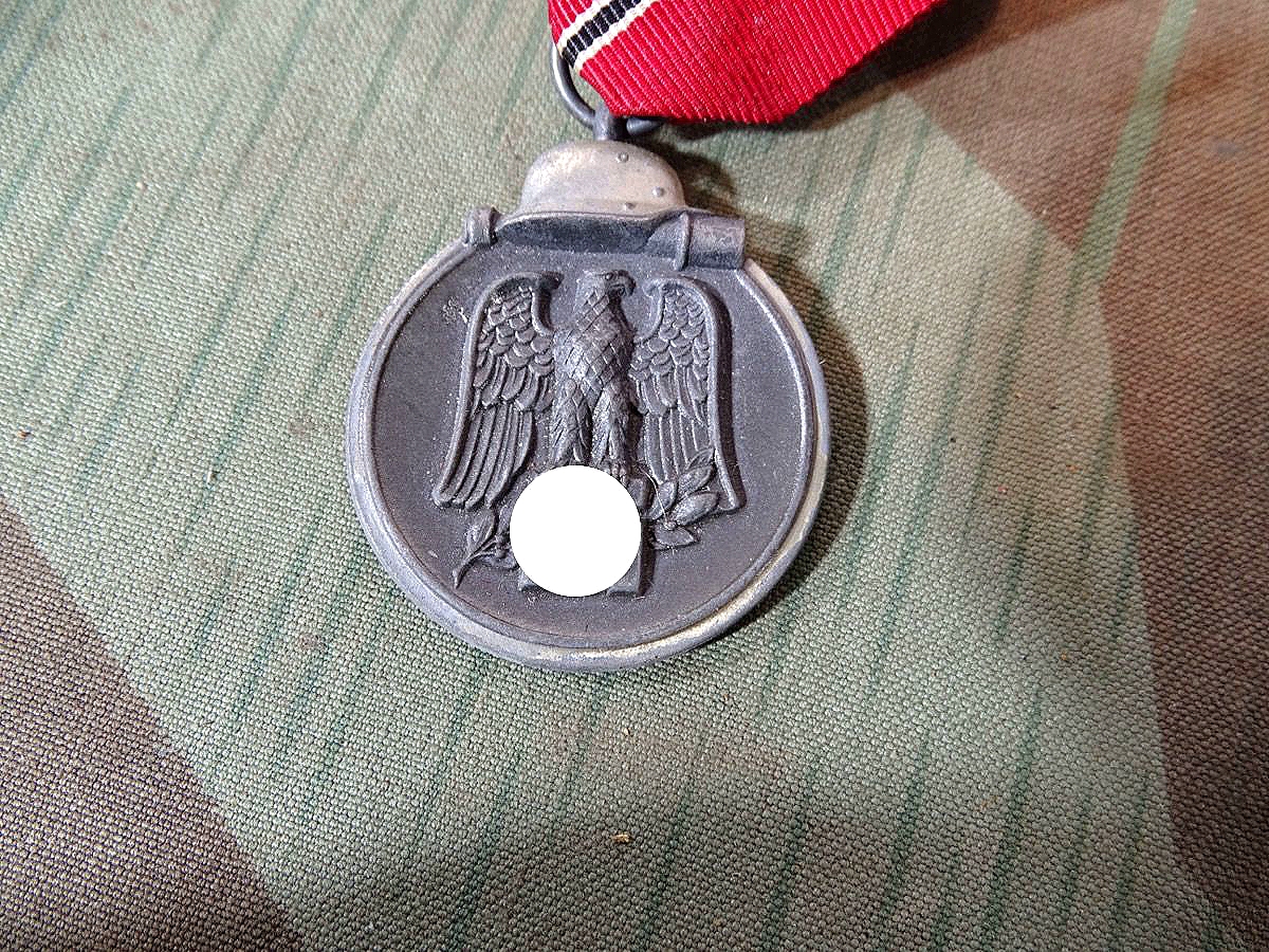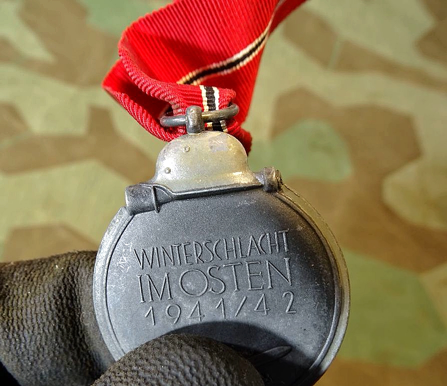 Medaille zur Winterschlacht im Osten (Ostmedaille) am Band. Guter Zustand. Helm und Rand noch mit großen Teilen der Versilberung, Mittelteil noch weitgehend antrazitfarben. Grade Ostmedaillen sind von der Farbe her oft nur noch grauer Zink. Zustand siehe Fotos
