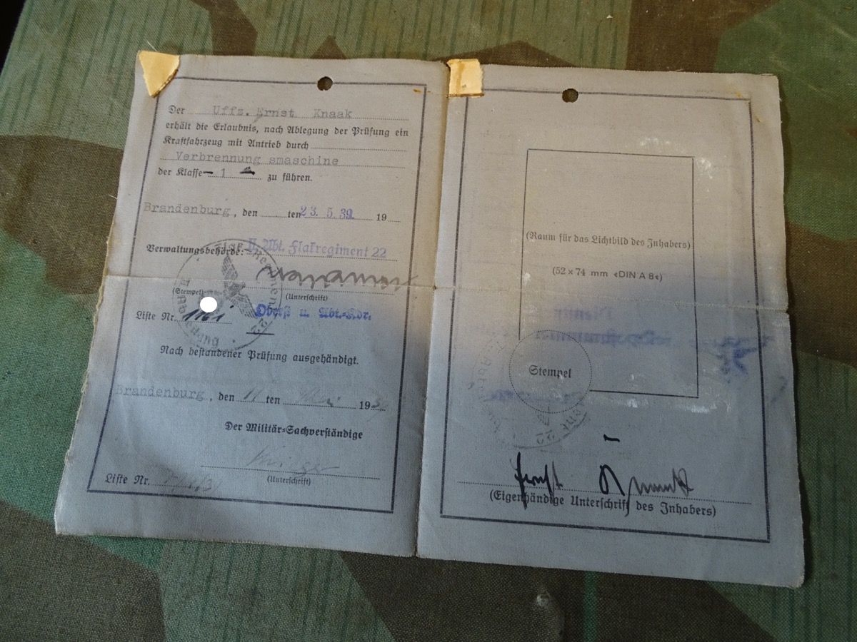 Produktinformationen "Militär/Wehrmacht Luftwaffen Führerschein 1939, Uffz. E.Knaak aus Berlin, 2. Abt. Flak Rgt. 22, 8 Batterie, Brandenburg, Maultier"