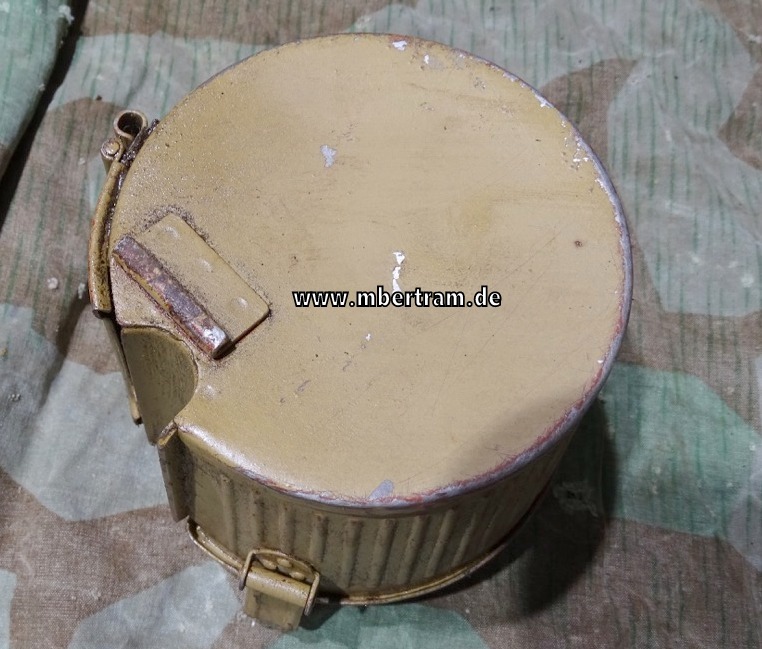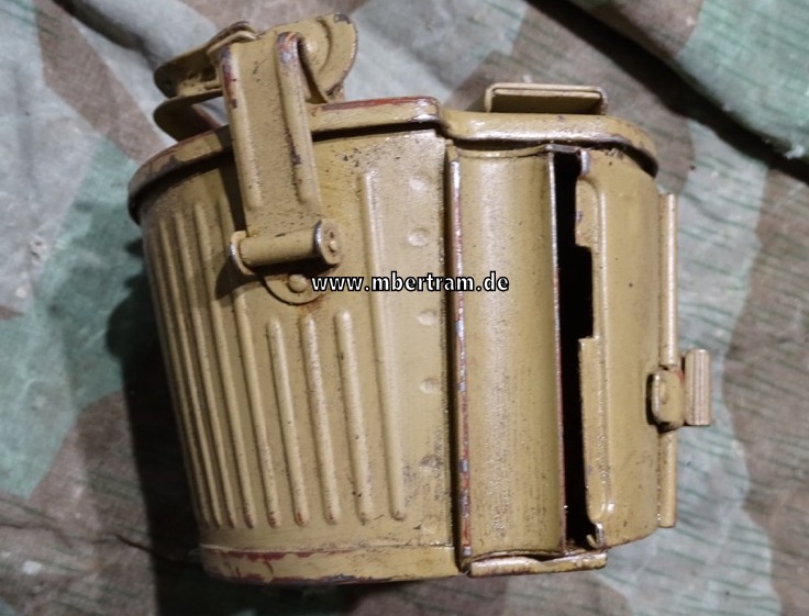 so ab 1943 eingesetzt. Herstellercode und Jahresstempel . Noch zu etwa 98 % Lackiert. Diese Trommeln konnten mit einem 50 Schussgurt versehen,am MG 34 und 42 montiert werden, und waren zum Einsatz im Häuserkampf, Fliegerabwehr (auf dem Dreibein) etc. gedacht.
