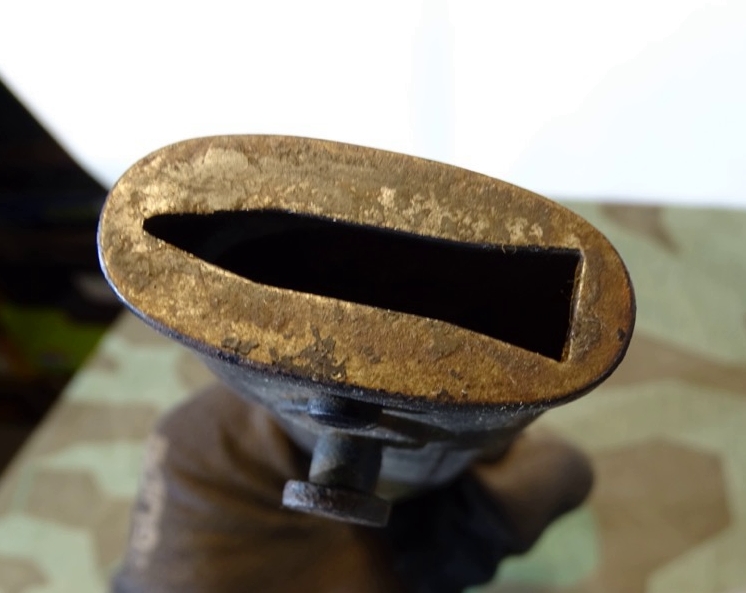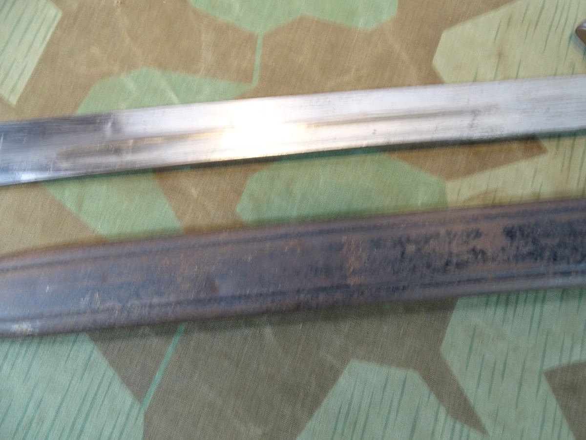 Seltene, etwas aufweniger gestalltete Variante in der Form wie ein frühes S 98/05 mit schwarz lackierter "FAG Design" Blechprägescheide. Diese mit oben abgesetzten Aufschub, der einer Lederscheide nachempfunden ist. Teile der schwarzen Originallackierung noch vorhanden. Unrestauriertes Stück, Griff noch mit Teilen der feldgrauen Originalfarbe, Klinge komplett blank. Ohne Herstellermarke. Drücker klappt. Klingenrücken mit kaiserlicher Waffenamts Abnahme. Zustand siehe Fotos. Bei Bestellung bitte Altersnachweis senden oder mailen ( Kopie vom Personalausweis).Zustand siehe Fotos.