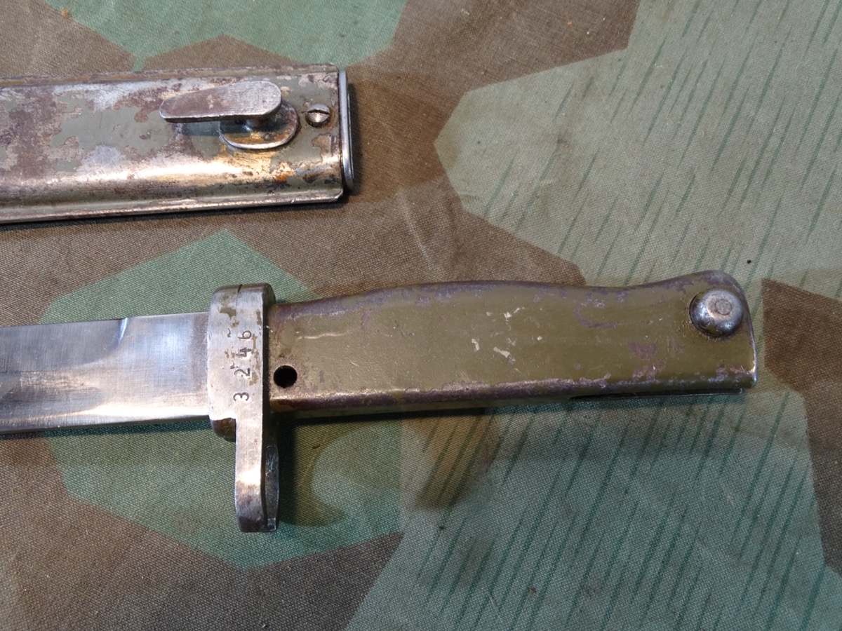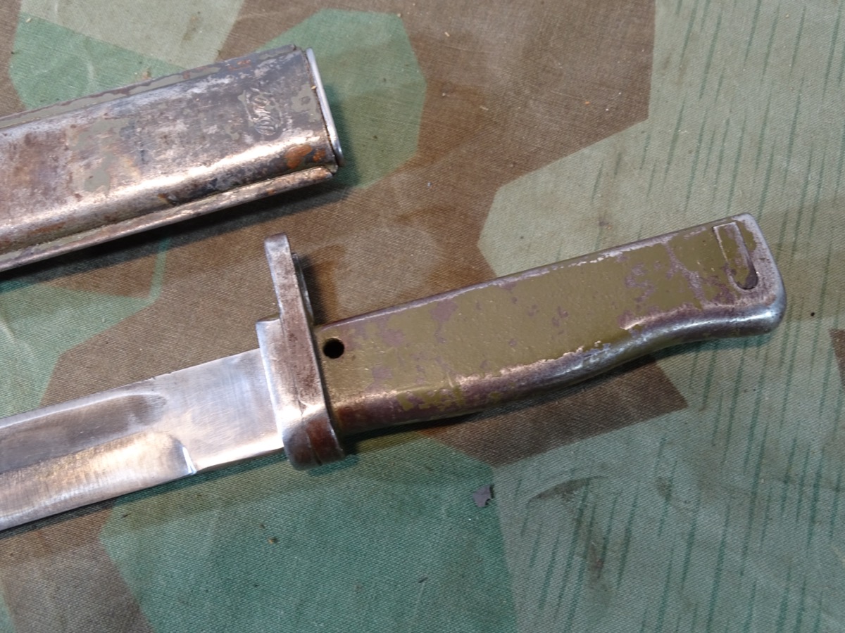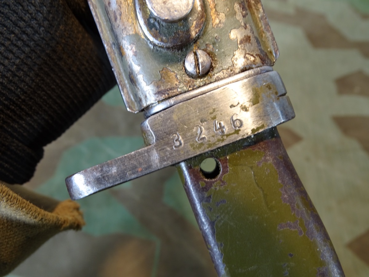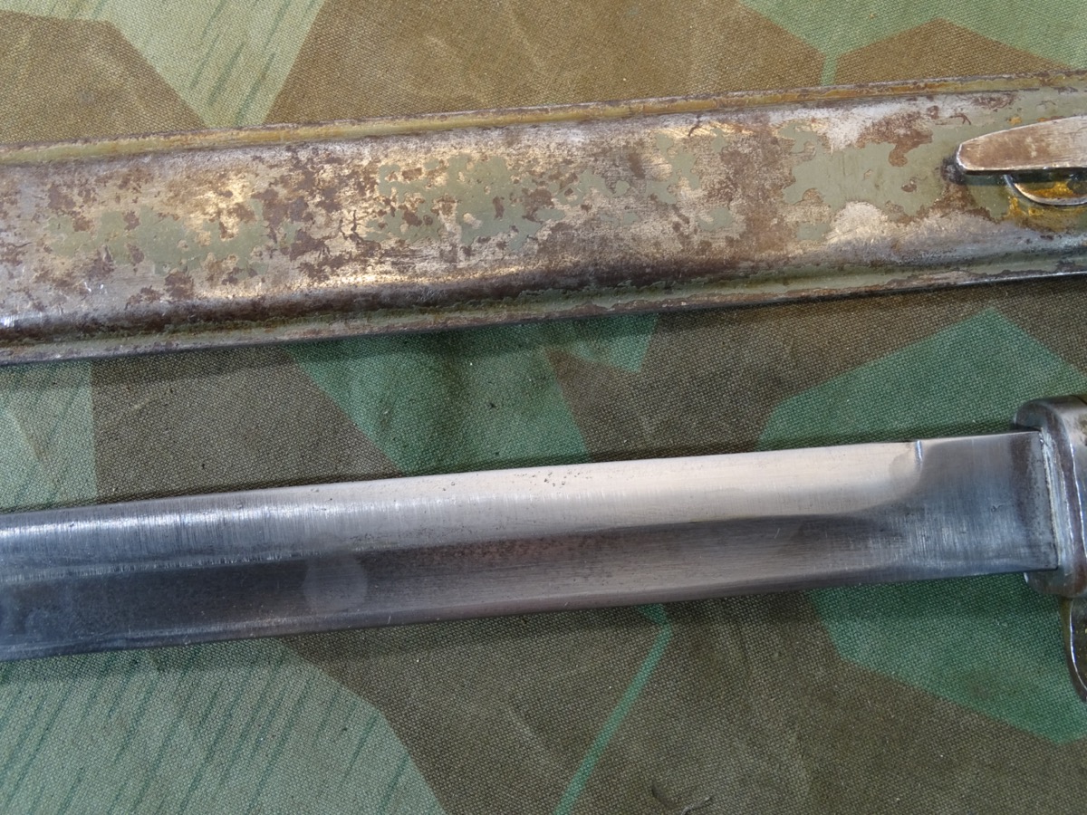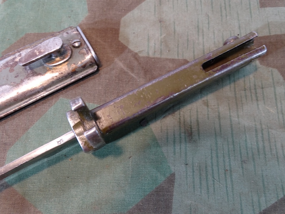 Drücker gänig. Auf Klingenrücken mit deutscher Waffenamts Punze. Griff noch zum größten Teil lackiert. Seltene Prägebleck Scheide mit Herstellermarke und Resten feldgrauer Lackierung. So genutzt mit Gewehr 88, Karabiner 88, Gewehr 98, Karabiner 98. Bei Bestellung bitte Altersnachweis senden oder mailen ( Kopie vom Personalausweis).