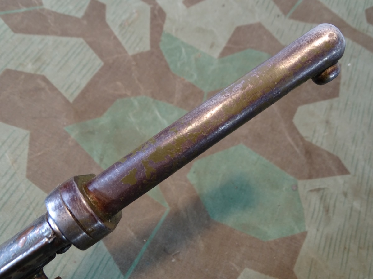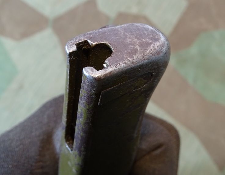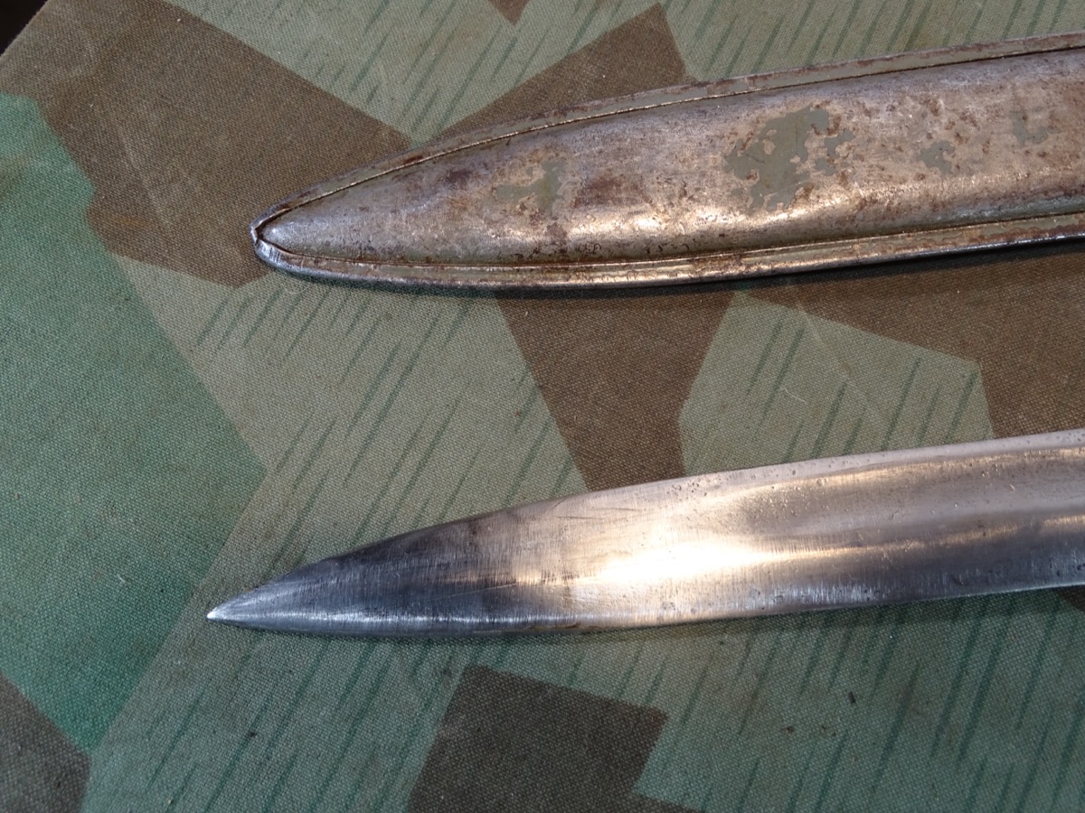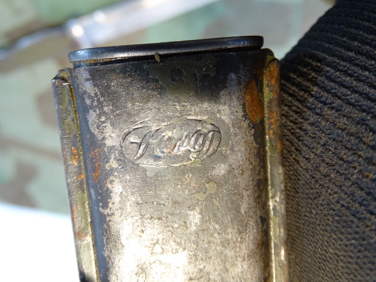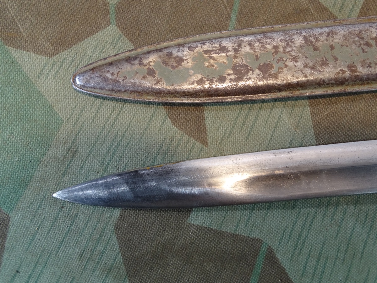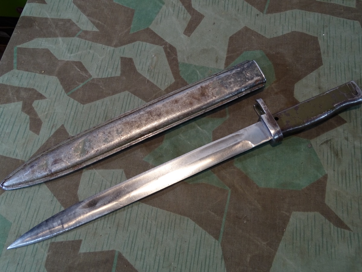 Drücker gänig. Auf Klingenrücken mit deutscher Waffenamts Punze. Griff noch zum größten Teil lackiert. Seltene Prägebleck Scheide mit Herstellermarke und Resten feldgrauer Lackierung. So genutzt mit Gewehr 88, Karabiner 88, Gewehr 98, Karabiner 98. Bei Bestellung bitte Altersnachweis senden oder mailen ( Kopie vom Personalausweis).