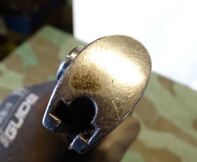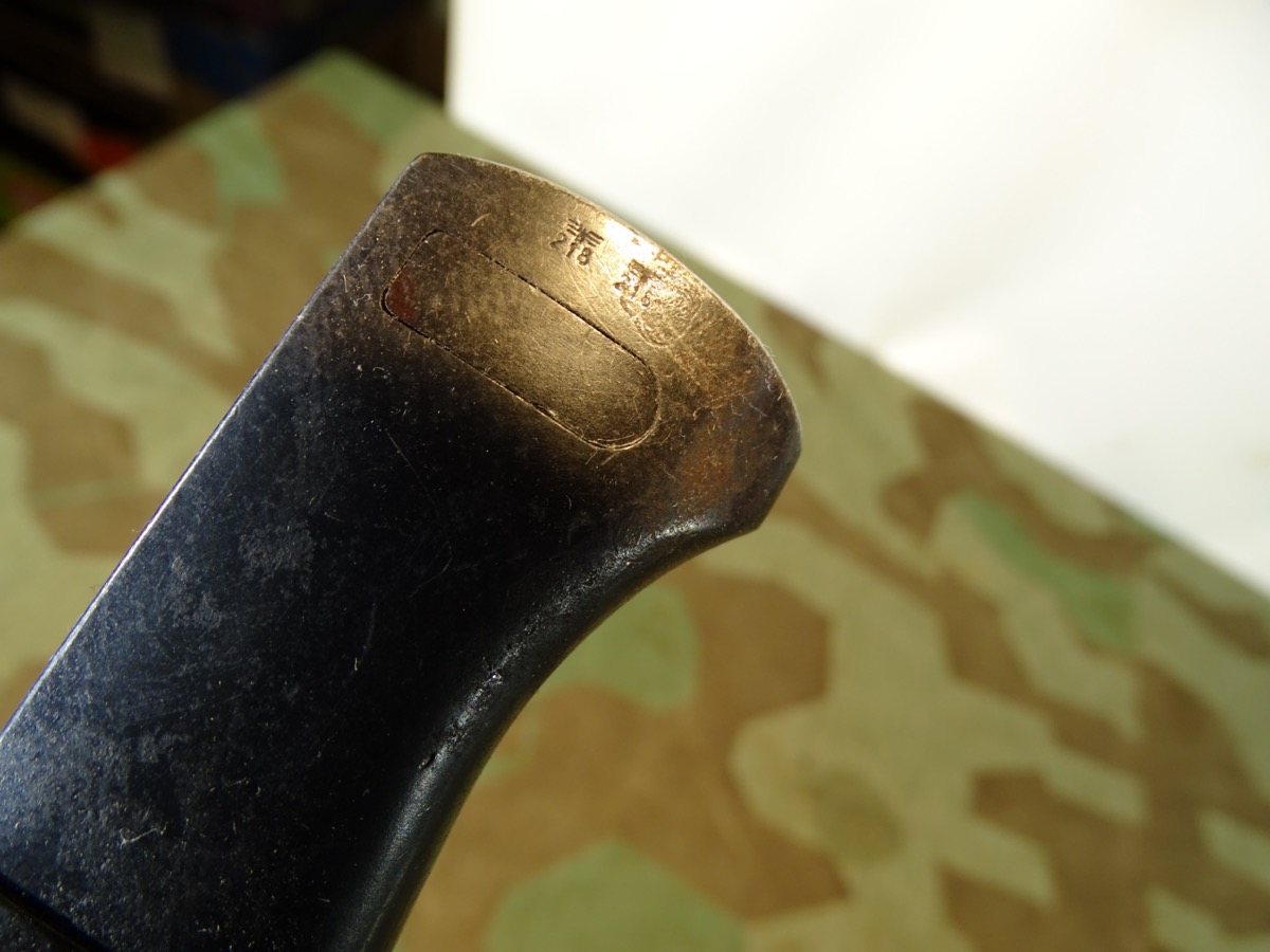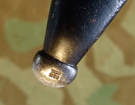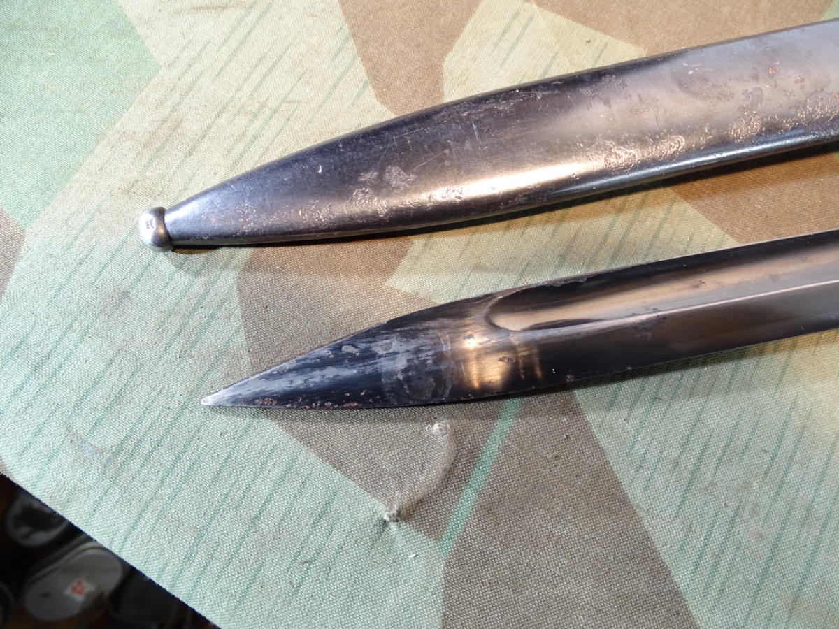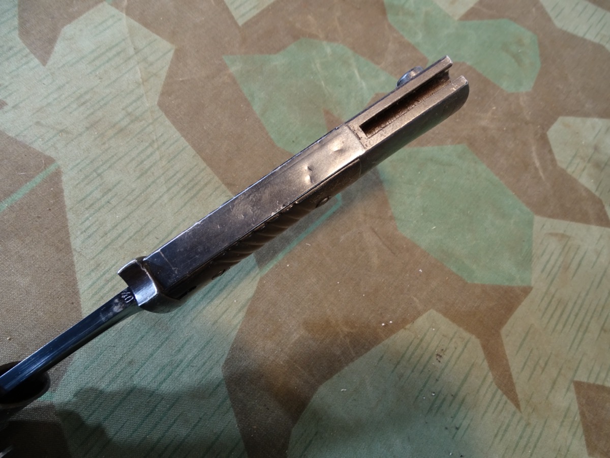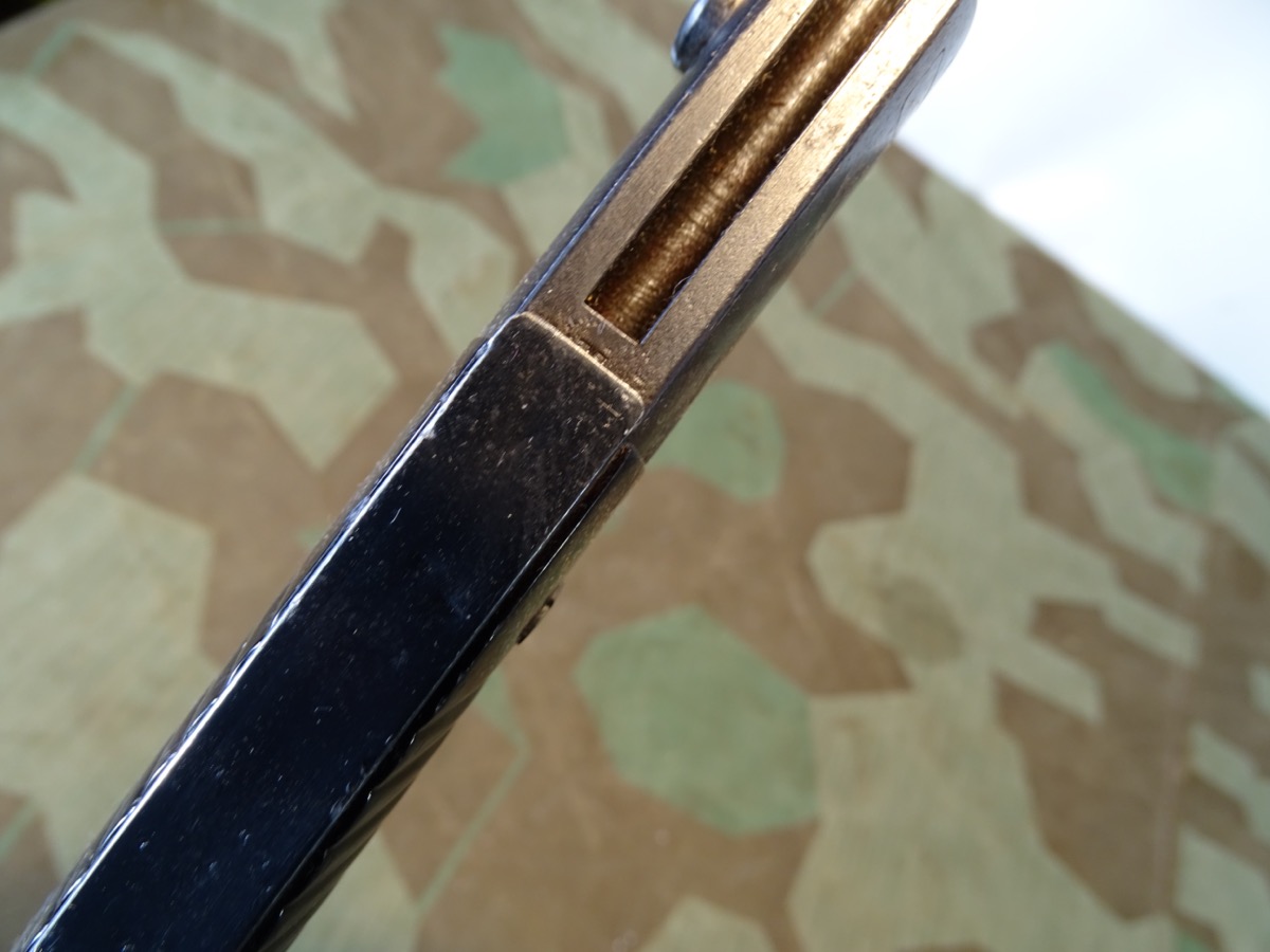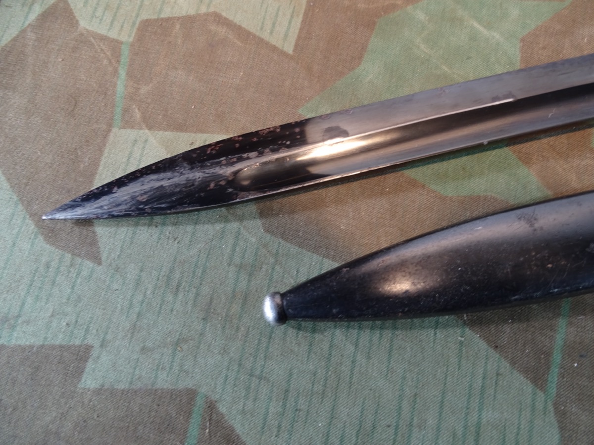 Gleiche Waffennummer 8990 auf Klinge und Scheide. Gleicher Hersteller Elite Diamant 1940 auf Klinge und Scheide. Fast das komplette Metall noch sehr schön dunkel brüniert. Braune Bakelittgriffschalen in guter Erhaltung. Auf Knauf mit 2 WaA Abnahme Stempeln und einem über dem Feuerschutzblech und auf Scheiden Kugel.