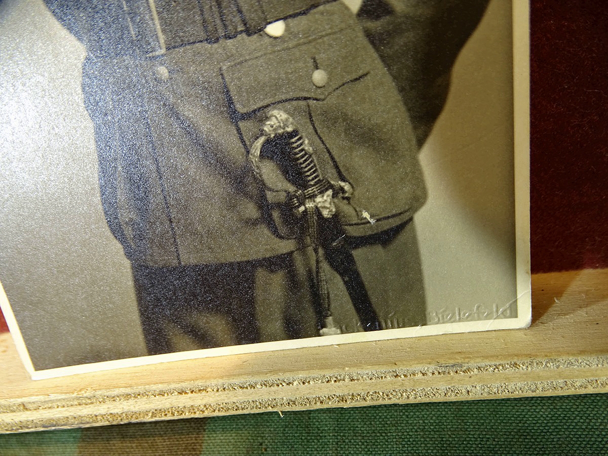 Foto mit ein paar Besonderheiten : Frühe Uniform, noch mit dem braunen, ungeschwärzten Schulterriemen und unter den Schulterklappen je 2 Stege zum befestigen wie im 1. WK. ( Älterer, lang gedienter Offizier ) auf Brust mit Stern des türkischen eisernen Halbmondes, gegenüber EK 1 1914, mit 5er Bandspange, wahrscheinlich vorwiegend 1. Weltkrieg, wir erkennen das Band Ehrenkreuz für Frontkämpfer 1914-18, daneben 4 weitere. Aufgrund der Trageberechtigung aus dem 1. Weltkrieg trägt er noch seinen Offiziers Löwenkopfsäbel mit gekreuzten Kanonenrohren auf dem Wappen und keinen 3 Reichs Säbel. Ungelaufen