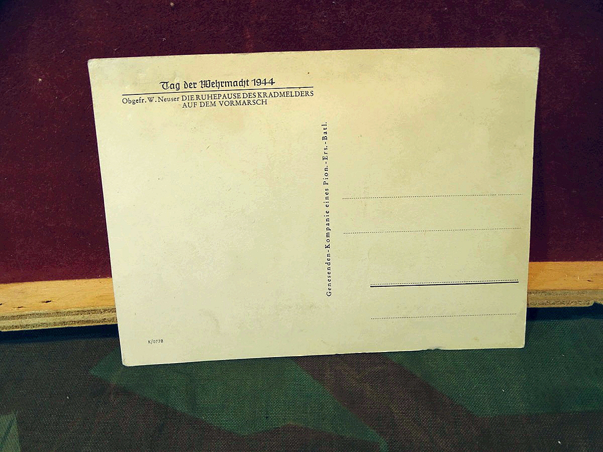 Produktinformationen "Postkarte zum Tag der Wehrmacht 1944. Die Ruhepause des Kradmelders auf dem Vormarsch"