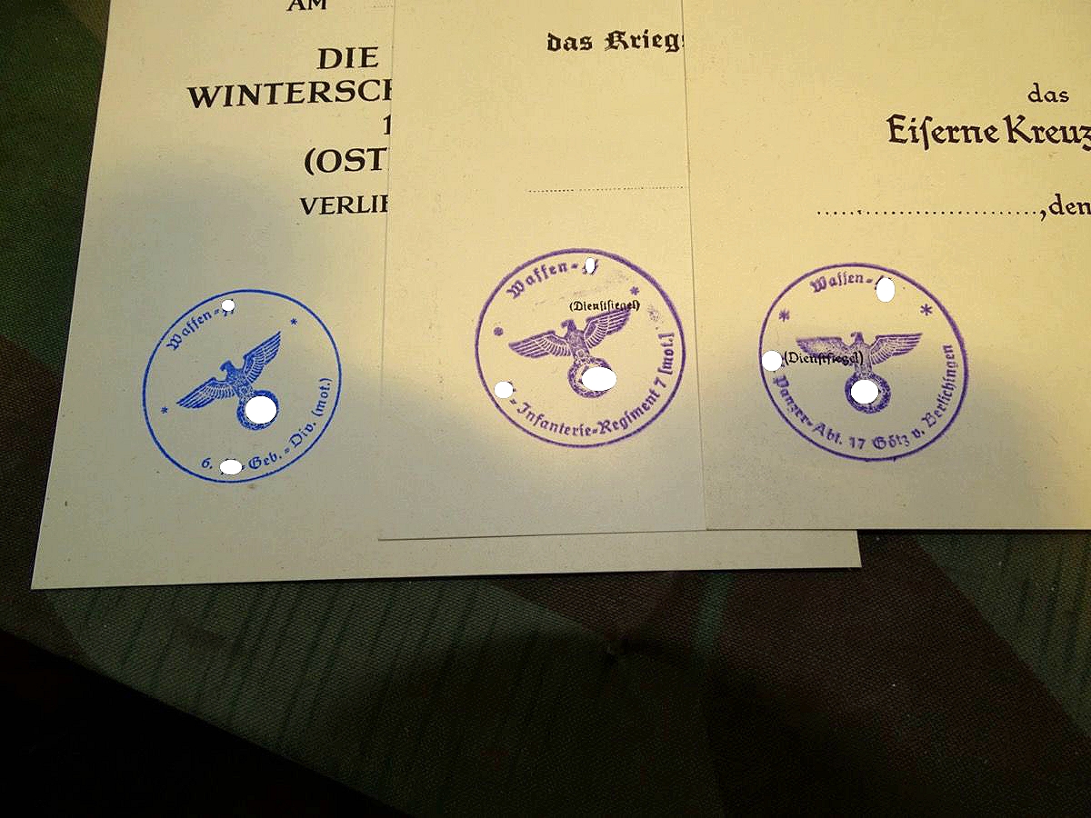 Produktinformationen "Replik: 3 Blanko Urkunden m. Stempeln, EK 2, Ostmedaille, KvK 2, Waffen SS Pz.Abt.17, Götz v Berlichingen"