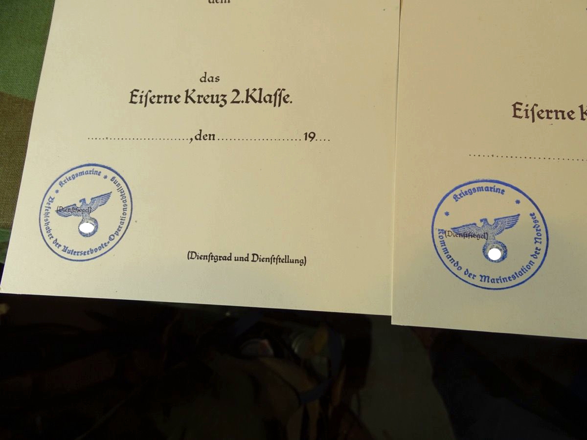 Produktinformationen "Replik: 4 Blanko Urkunden m. Stempeln, EK 1, EK 2, KvK 1 u.2, Kriegsmarine 21 U-Boot Flotille"