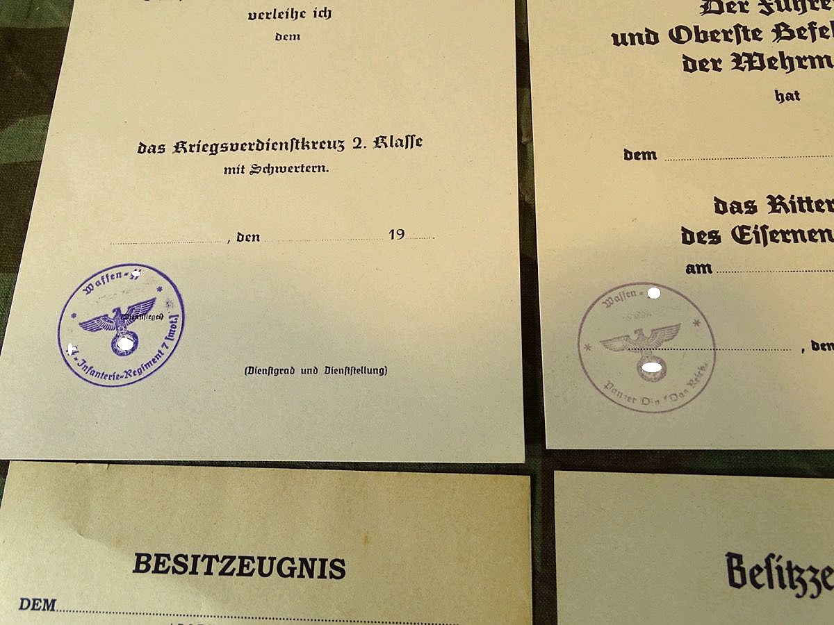 Produktinformationen "Replik: 4 Blanko Urkunden m. Stempeln, Ritterkreuz, EK 2, KvK 2, Verw. Abz. Waffen SS Pz. Div. " Das Reich " "