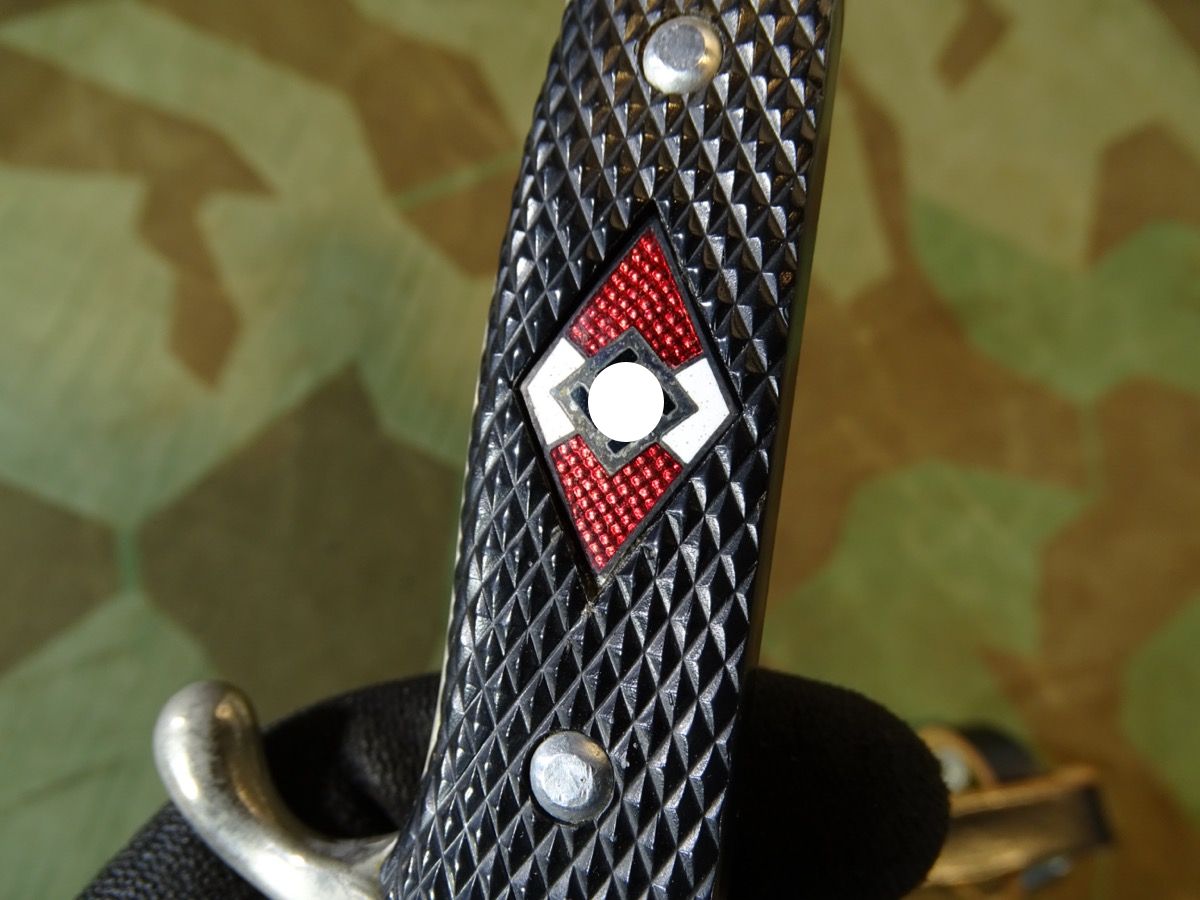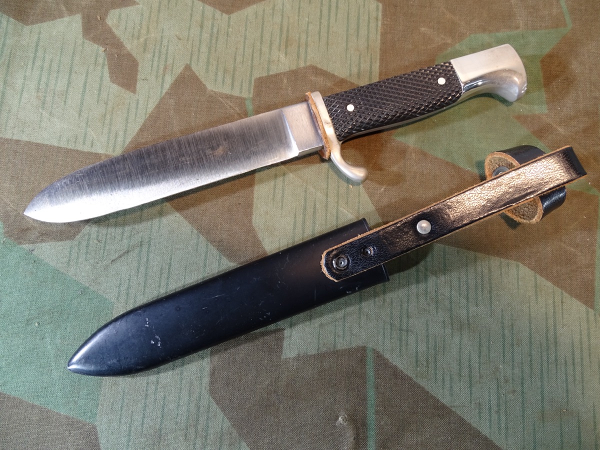 Zustand siehe Fotos. Klinge mit geätzter Devise "Blut und Ehre" .Das Emaillierte Griffemblem ist so gut gemacht, es könnte sich noch um einen Restbestand von Originalabzeichen handeln. Scheide am oberen Rand nicht mit der dicken, typischen, umlaufenden Nachkriegswulst. Mittlerweile nun auch schon ca. 50 Jahre alt. Gut gemacht. Gute Möglichkeit diese Lücke in der Sammlung mit einer guten Kopie zu füllen. Das Original kostet wohl über 400 Euro. Die modernen Kopien davon sind meist viel schlechter und unsauberer gefertigt. Da sind diese alten Stücke viel authentischer und originalgetreuer. Bei Bestellung bitte Altersnachweis mailen oder senden (Kopie vom Personalausweis)