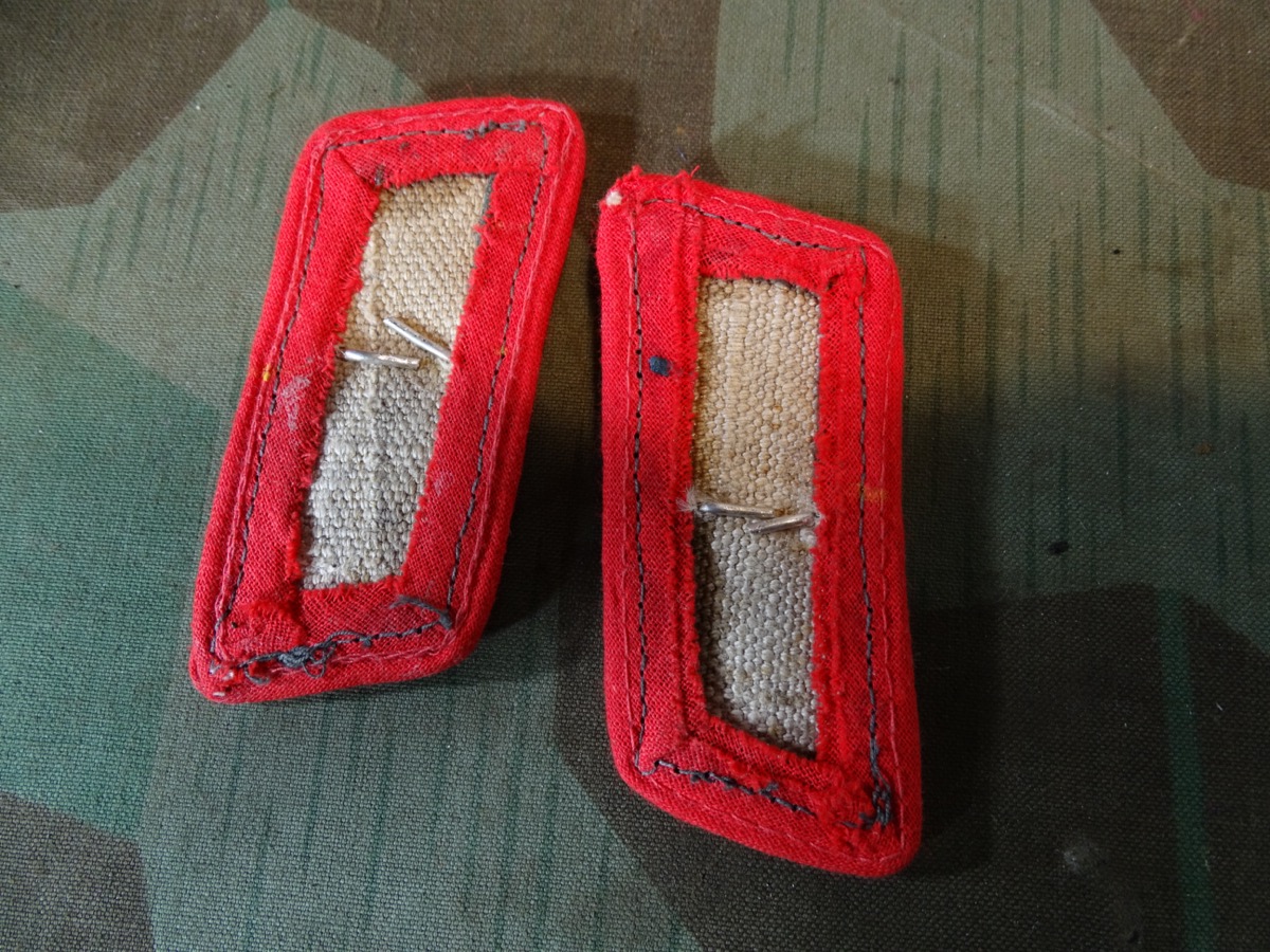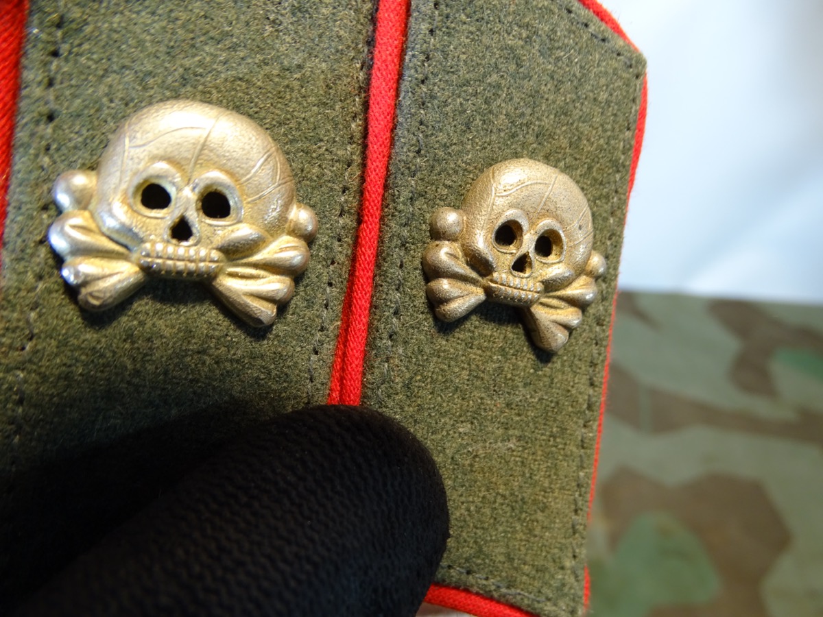 Unserer Meinung nach sind die Unterlagen Originale und die Totenköpfe Repiken. Vor 30 Jahren mit Nachlass eines Wehrmachtssoldaten einer Sturmgeschütz Einheit direkt vom Träger angekauft. Nun geben wir sie durch Umstellung des Sammlegebietes in den Verkauf. Laut Träger Aussage hat er bei Kriegsende die Totenköpfe entfernt um nicht für SS gehalten zu werden und sich nach dem Krieg auf einem Rgt. Treffen ein Paar nachgekauft. Ungetragene Kragenspiegel die er als Reserve hatte. Mit ergänzten original Totenköpfen würde das Paar ca. um 400-500€ liegen. Zustand siehe Fotos.