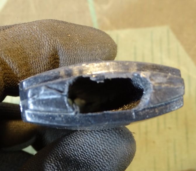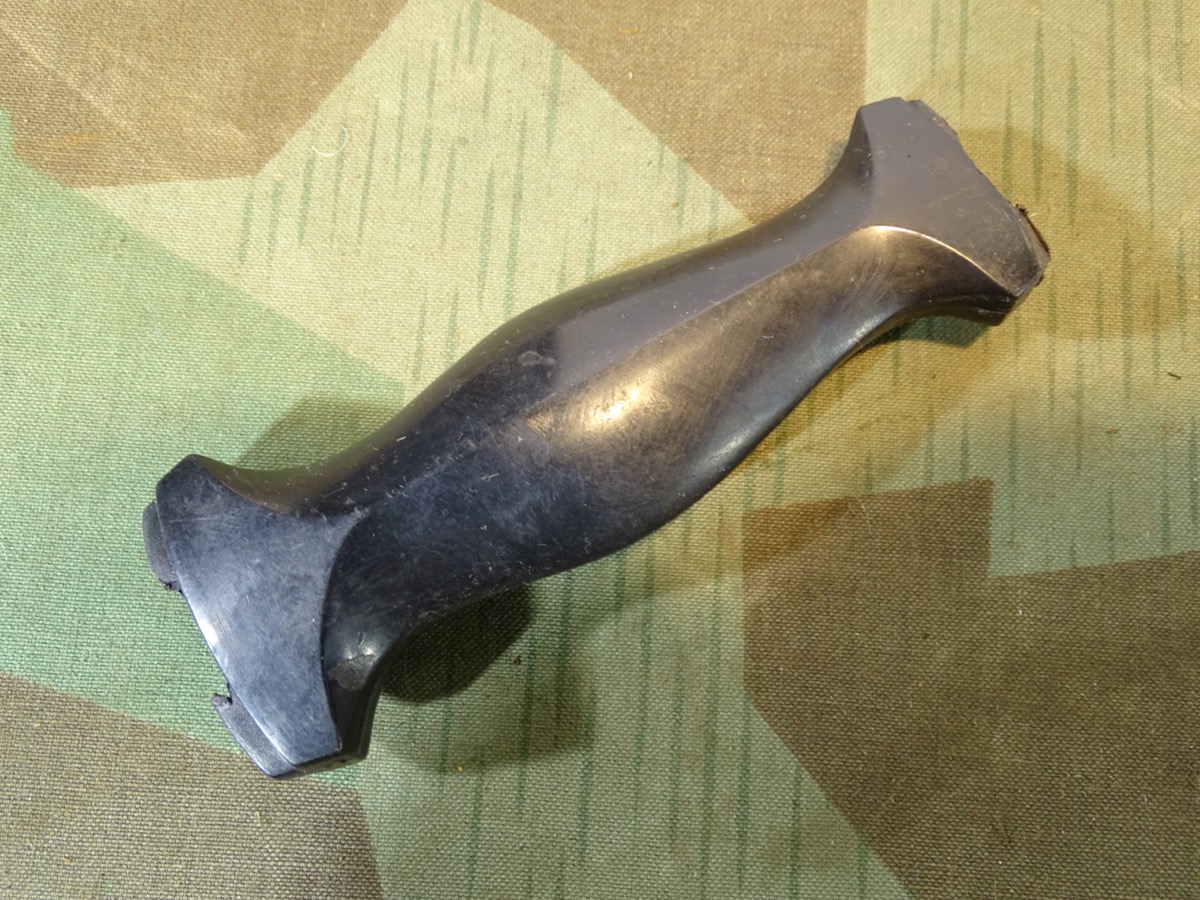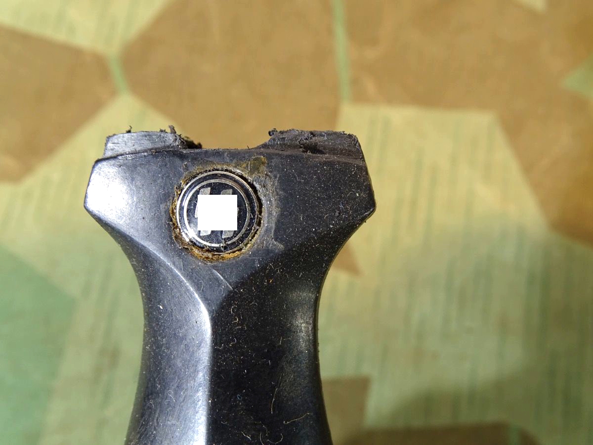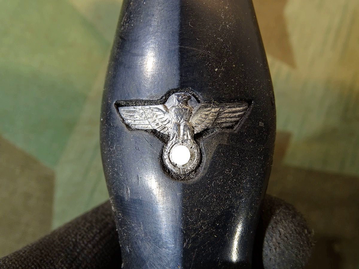 Der Griff ist aus schwarzem Kunststoff, oben die Parierstangenaufnahme etwas schmaler gefeilt, wohl um Original Griffschiffchen drauf zu bekommen. Die 2 Griffabzeichen sind in sehr guter Qualität. Der Adler könnte sogar ein eingesetztes Originalstück sein -oder halt eine gut gemachte Replik . Das SS Symbol ist sauber emailliert. Bei den meisten Replik Griffen sind beide Embleme nur aus grob gegossenem, unpräzise gearbeiteten und stark glänzend vernickeltem Grauguss.