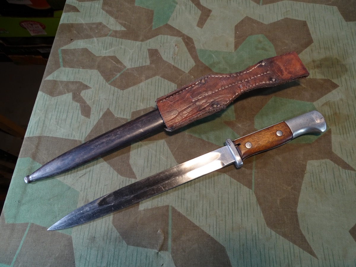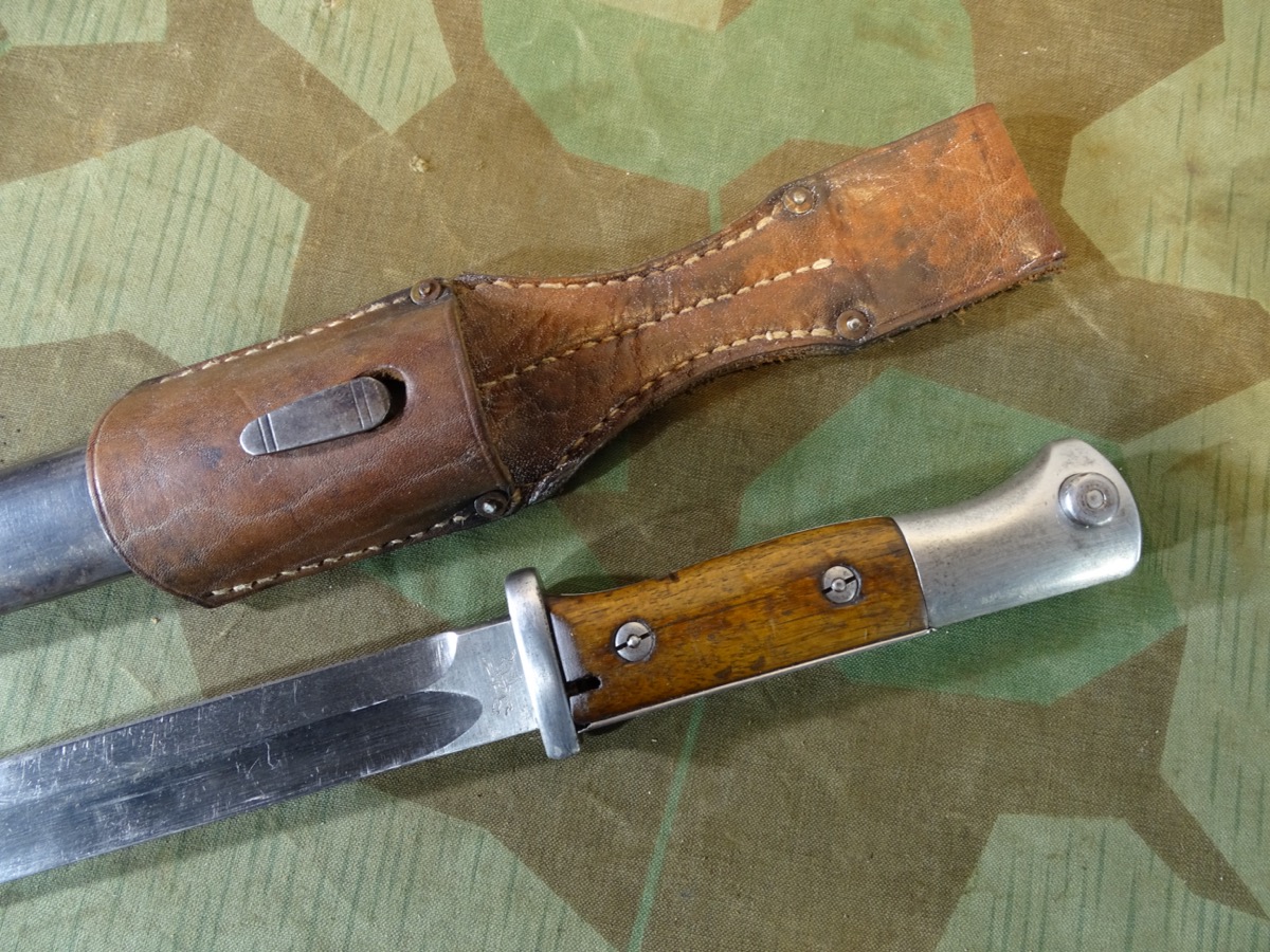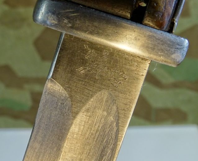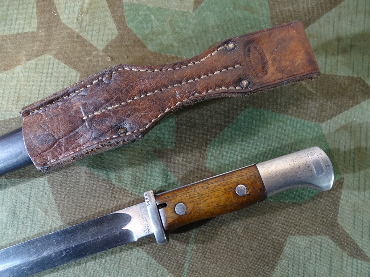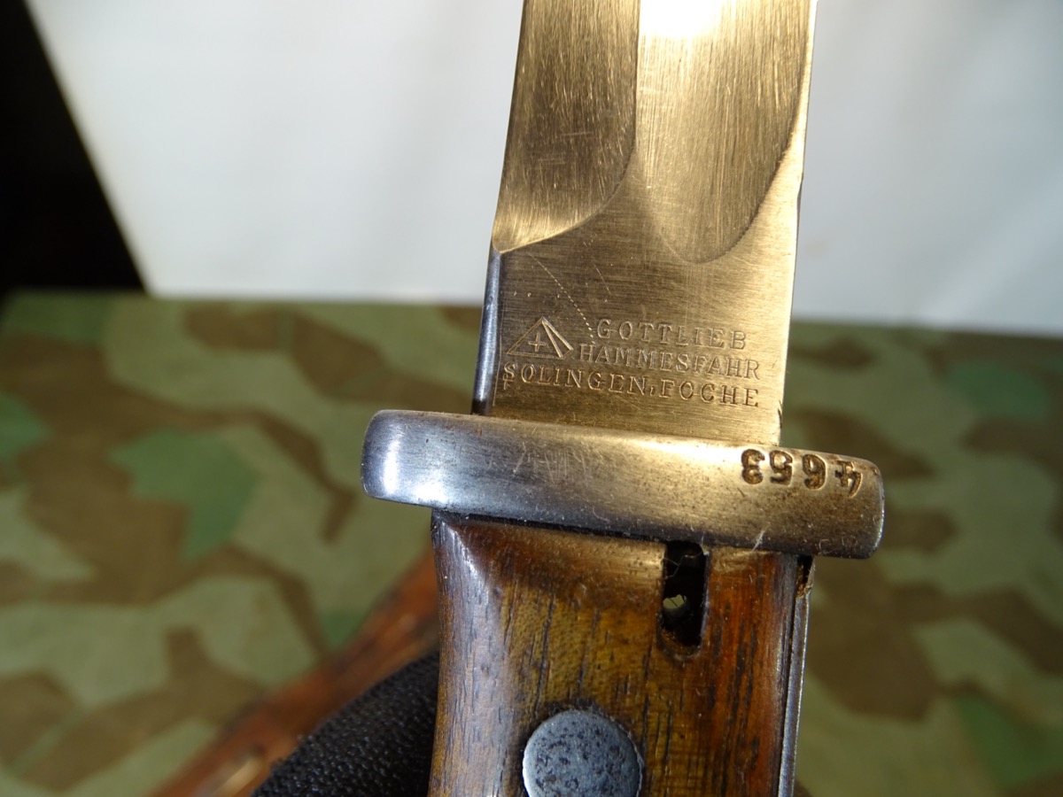 Deutsches 1. Weltkriegs Bajonett von 1916 zum kaiserlichen Karabiner K.98 oder Gewehr 98 .Auf Klingenrücken kaiserlicher Abnahmestempel W, Krone 1916. Auf Griffknauf weitere kaiserliche Waffenamts Abnahme. Holz Griffschalen gut erhalten. Drücker klappt einwandfrei. Metall des Bajonetts schön glatt und gut erhalten. Klinge mit schöner klarer Herstellermarke von Gottlieb Hammesfahr Solingen Foche. Umseitig ein uns unbekanntes weiteres Firmensymbol mit Ritter auf Pferd mit einer Lanze. Wahrscheinlich ein Doppelhersteller / Eine Coproduktion zweier Firmen. Brünierte Eisenscheide, noch viel Brünierung erhalten. Brauner Koppelschuh noch gut beweglich. Wir halten den Koppelschuh für eine gut gemachte Replik. Zustand siehe Fotos. Bei Bestellung bitte Altersnachweis mailen oder senden, nicht faxen ( Kopie vom Personalausweis).