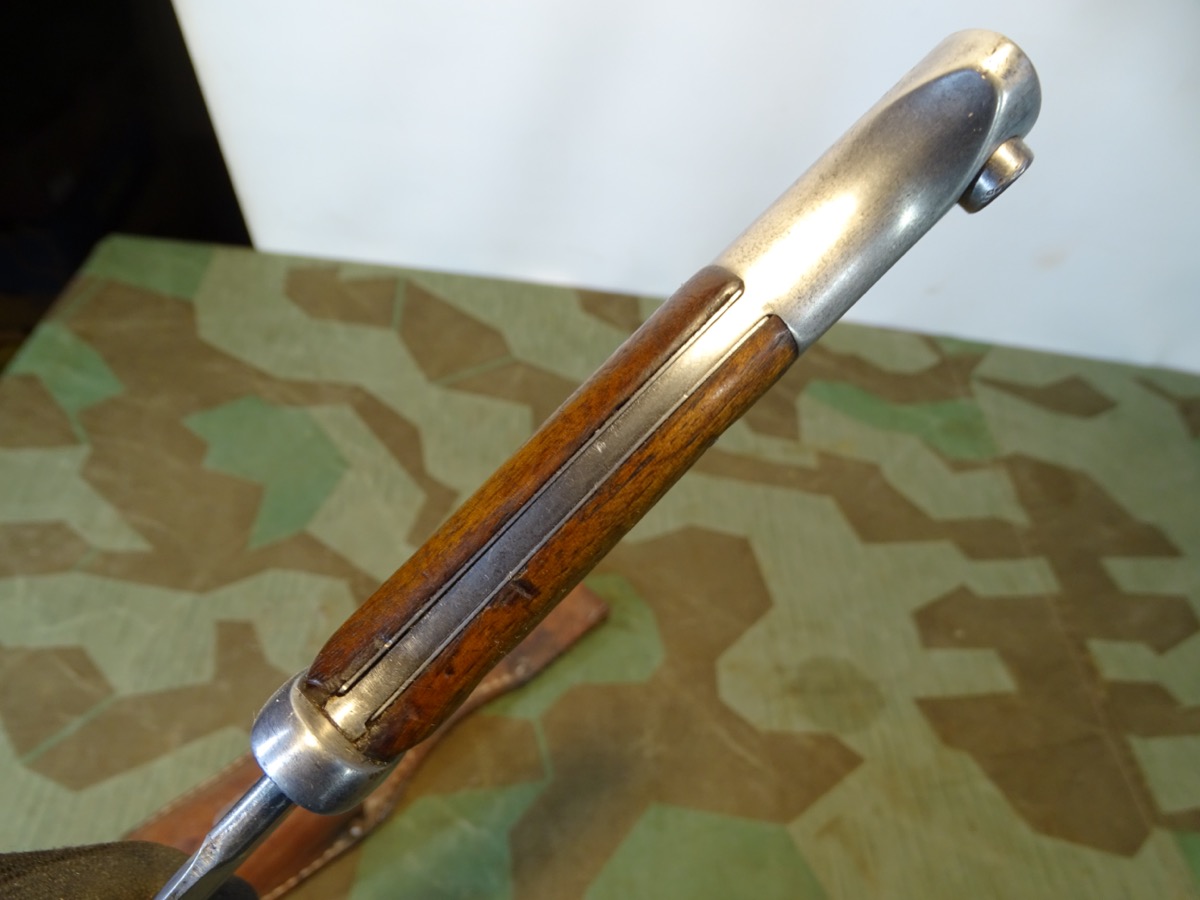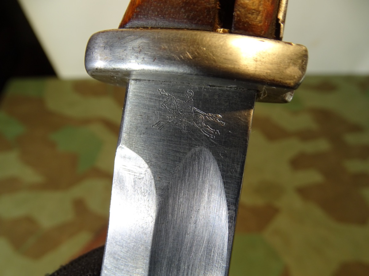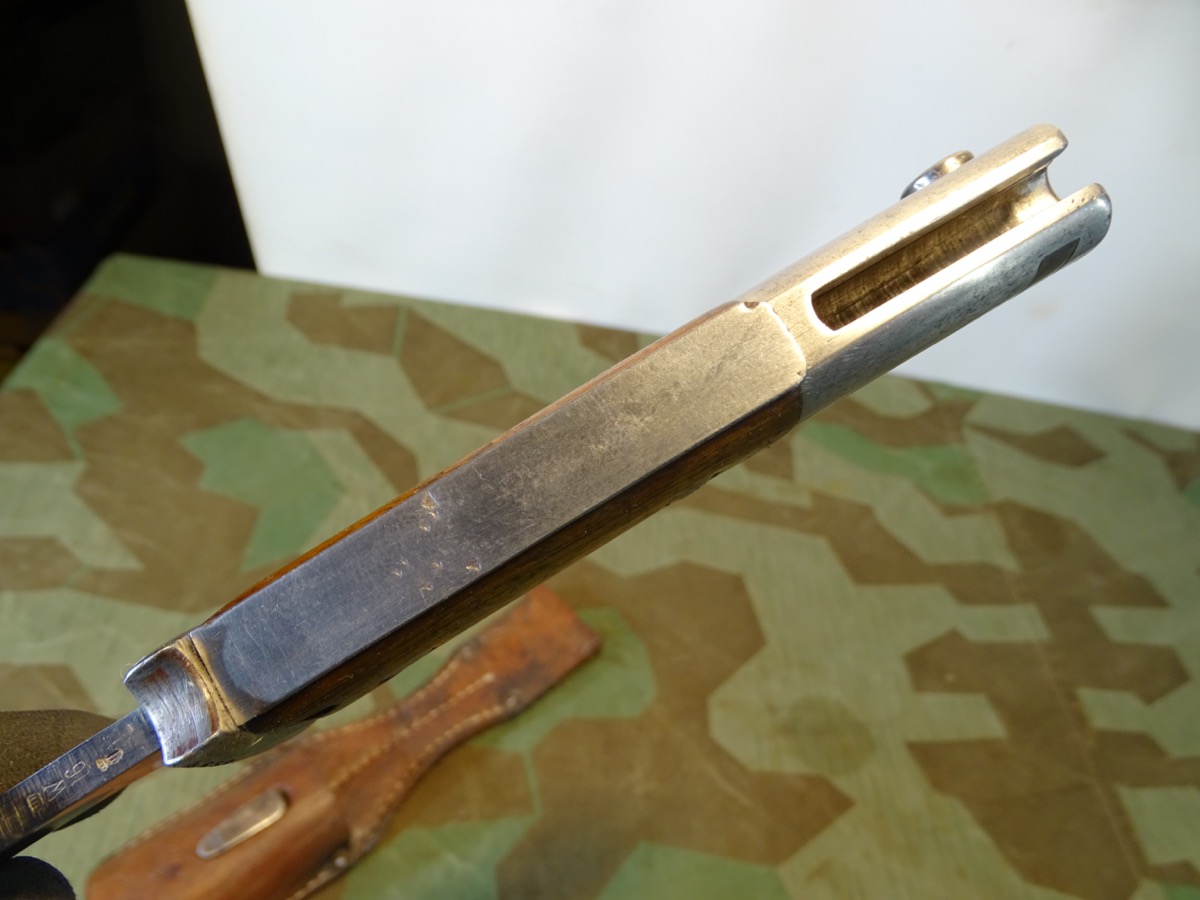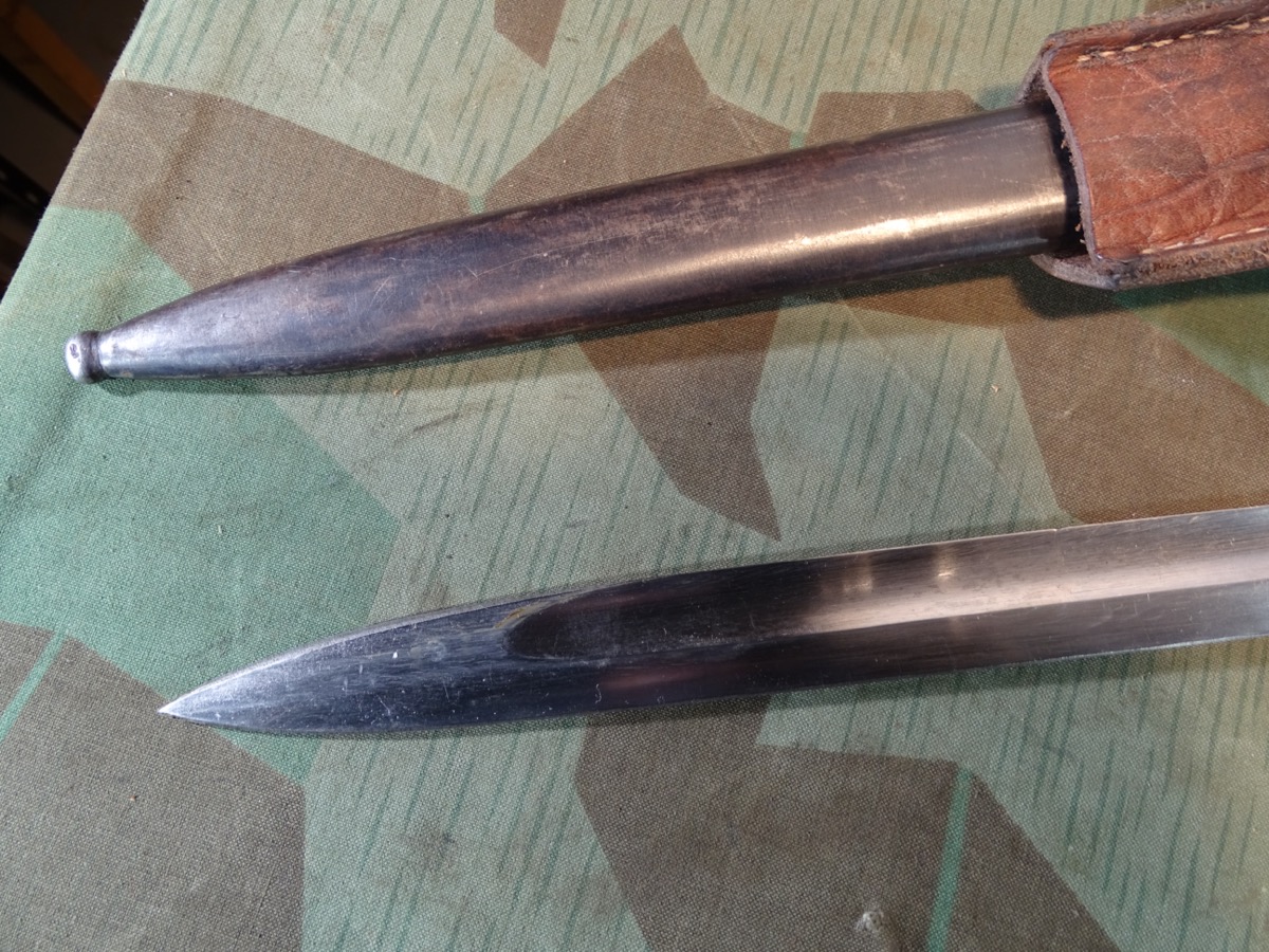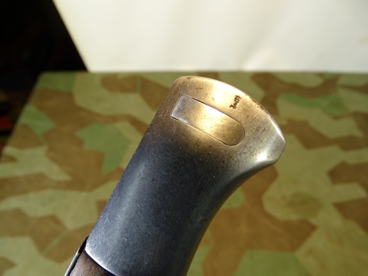 Deutsches 1. Weltkriegs Bajonett von 1916 zum kaiserlichen Karabiner K.98 oder Gewehr 98 .Auf Klingenrücken kaiserlicher Abnahmestempel W, Krone 1916. Auf Griffknauf weitere kaiserliche Waffenamts Abnahme. Holz Griffschalen gut erhalten. Drücker klappt einwandfrei. Metall des Bajonetts schön glatt und gut erhalten. Klinge mit schöner klarer Herstellermarke von Gottlieb Hammesfahr Solingen Foche. Umseitig ein uns unbekanntes weiteres Firmensymbol mit Ritter auf Pferd mit einer Lanze. Wahrscheinlich ein Doppelhersteller / Eine Coproduktion zweier Firmen. Brünierte Eisenscheide, noch viel Brünierung erhalten. Brauner Koppelschuh noch gut beweglich. Wir halten den Koppelschuh für eine gut gemachte Replik. Zustand siehe Fotos. Bei Bestellung bitte Altersnachweis mailen oder senden, nicht faxen ( Kopie vom Personalausweis).