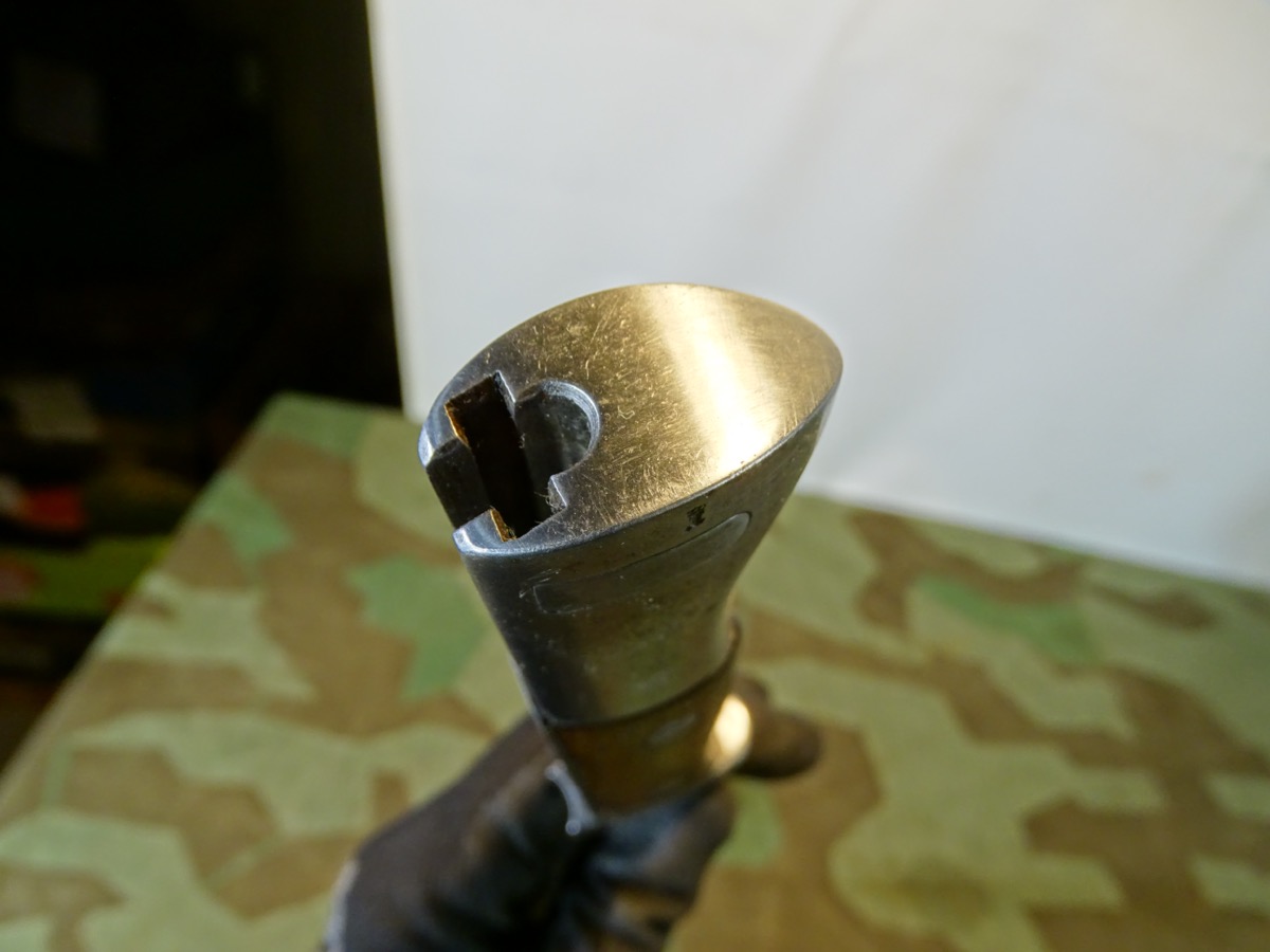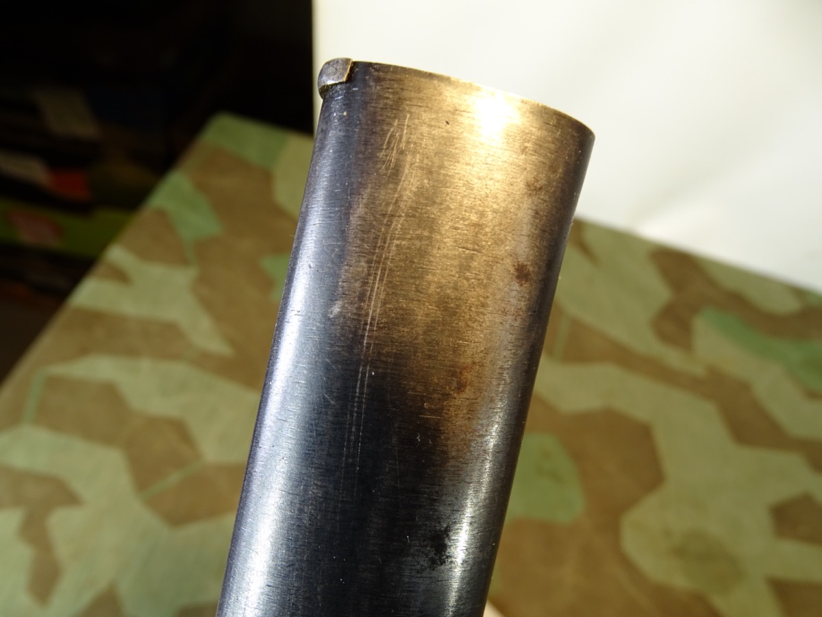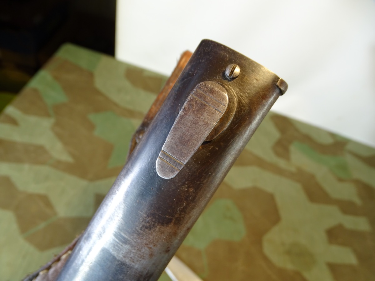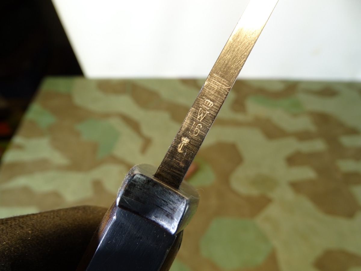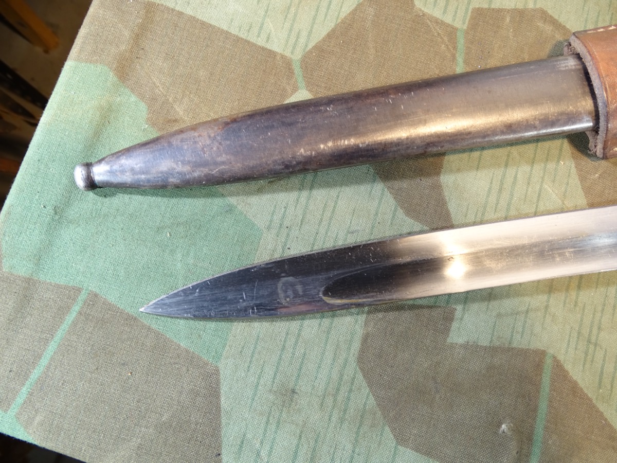 Deutsches 1. Weltkriegs Bajonett von 1916 zum kaiserlichen Karabiner K.98 oder Gewehr 98 .Auf Klingenrücken kaiserlicher Abnahmestempel W, Krone 1916. Auf Griffknauf weitere kaiserliche Waffenamts Abnahme. Holz Griffschalen gut erhalten. Drücker klappt einwandfrei. Metall des Bajonetts schön glatt und gut erhalten. Klinge mit schöner klarer Herstellermarke von Gottlieb Hammesfahr Solingen Foche. Umseitig ein uns unbekanntes weiteres Firmensymbol mit Ritter auf Pferd mit einer Lanze. Wahrscheinlich ein Doppelhersteller / Eine Coproduktion zweier Firmen. Brünierte Eisenscheide, noch viel Brünierung erhalten. Brauner Koppelschuh noch gut beweglich. Wir halten den Koppelschuh für eine gut gemachte Replik. Zustand siehe Fotos. Bei Bestellung bitte Altersnachweis mailen oder senden, nicht faxen ( Kopie vom Personalausweis).