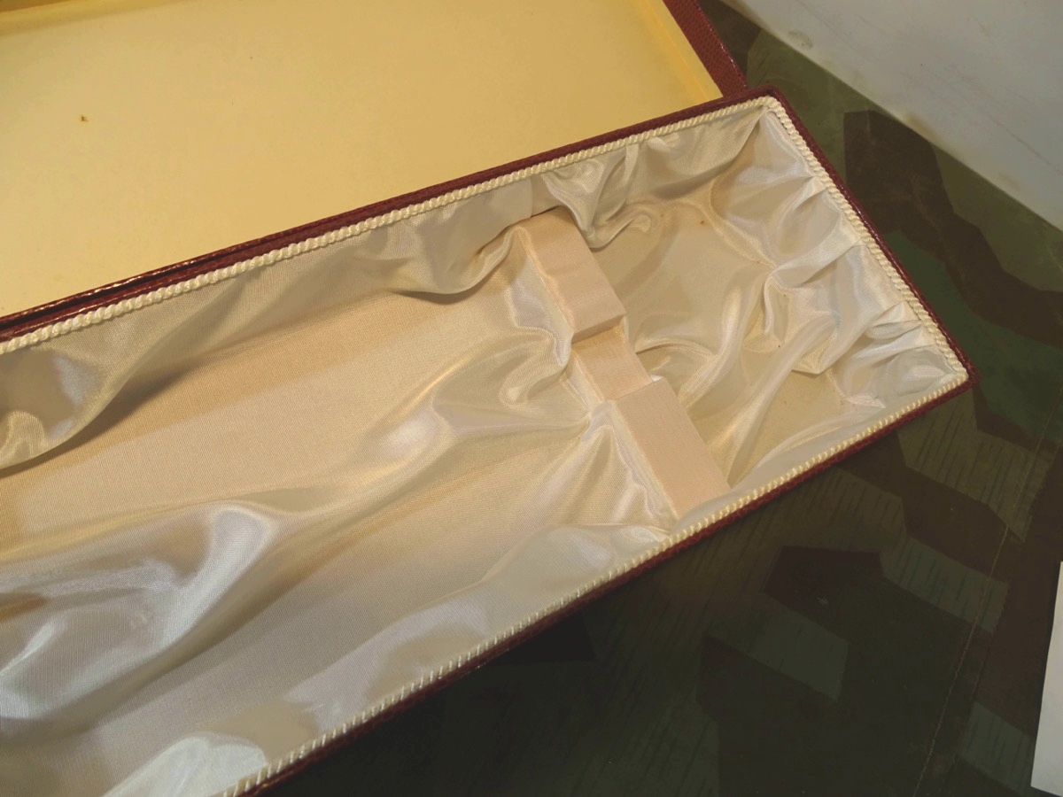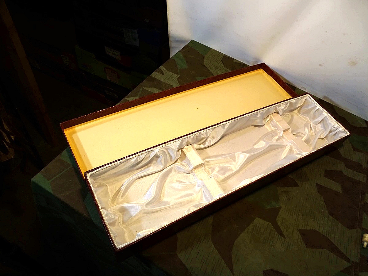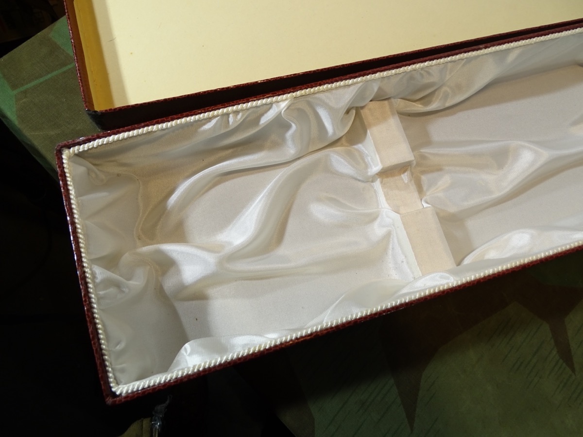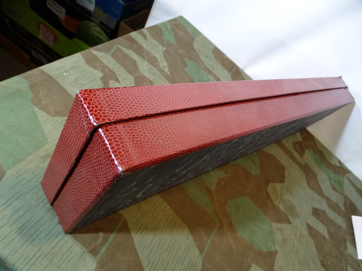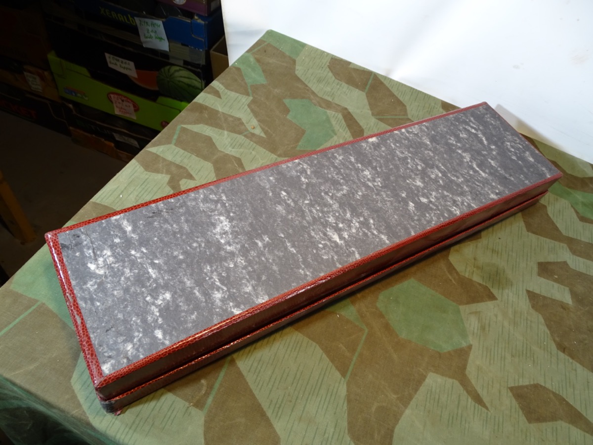 Von der Größe her wohl für Hirschfänger oder lange Extra Seitengewehre. Aus Auflösung einer Solinger Blankwaffen Firma. Dekoratives Aufbewahrungs- und Präsentations Etui für Blankwaffen. Kartonkörper mit rotem Reptilmuster Bezug. Innen mit weißer Kunstseide ausgeschlagen. Alter unbekannt aber wohl frühe Nachkriegszeit. Ca. 56,5 cm x 14,5cmx 6 cm