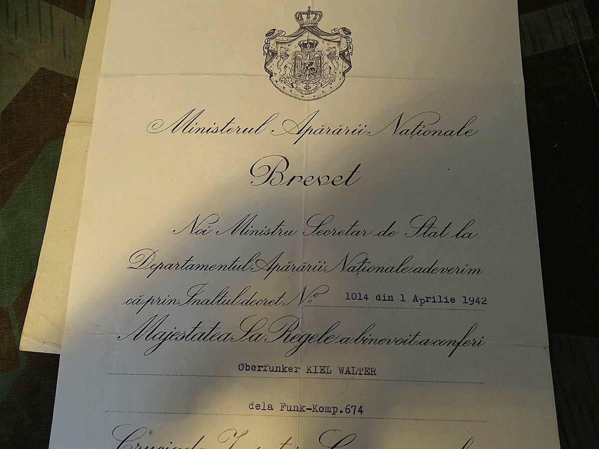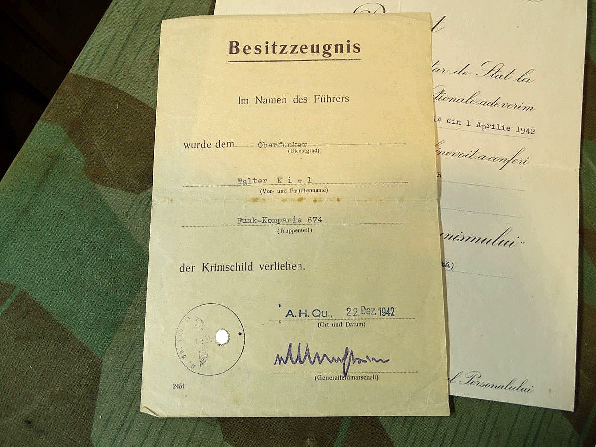 2 Urkunden für Wehrmachts Oberfunker Walter K. , Funk Kp. 674- 1. Große Schmuckurkunde für den Orden "Kreuzzug gegen den Kommunismus 1941" vom 1. April 1942. 2. Besitzzeigniss für den Krimschild vom 22.12.1942 , Faksimilie Unterschrift Generalfeldmarschall v. Manstein.