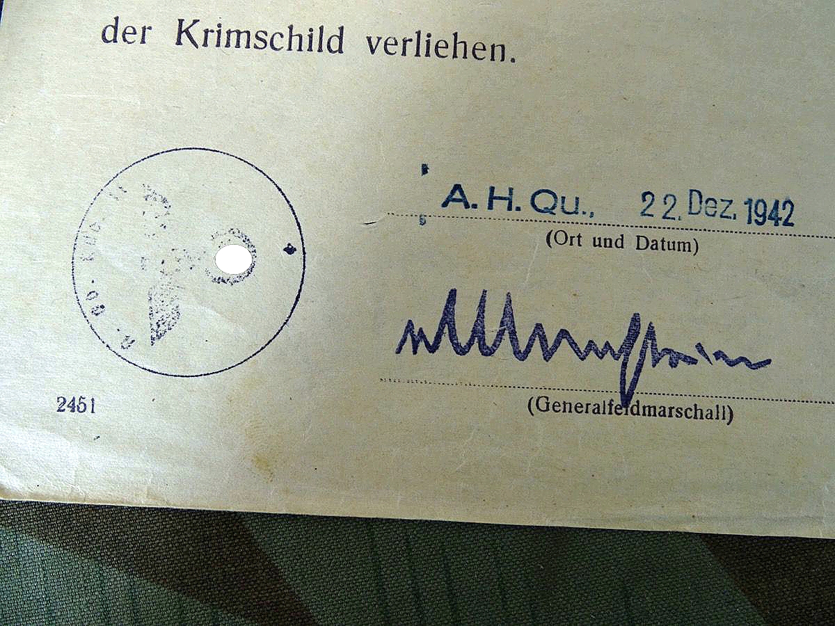 Schmuckurkunde Kreuzzug gegen den Kommunismus 1941 und Urkunde Krimschild, 2 Fotos.