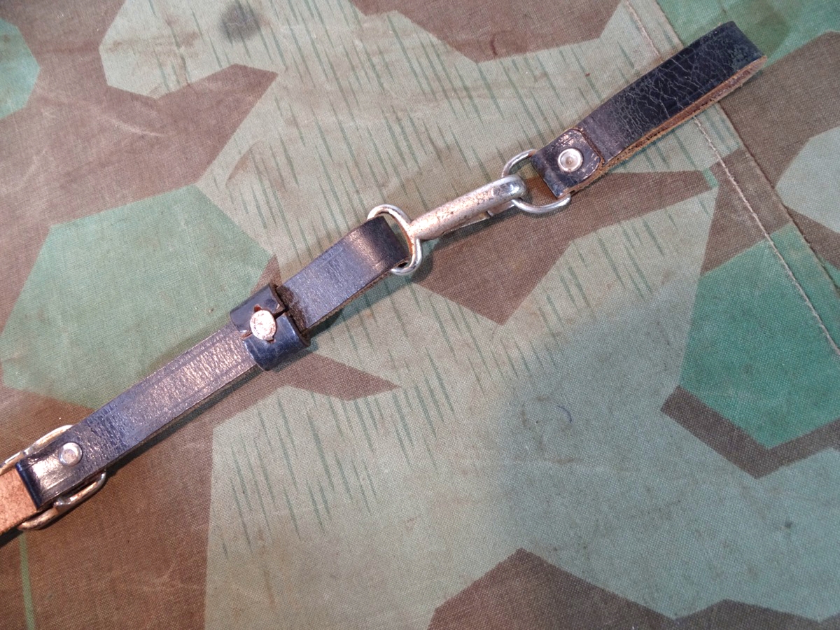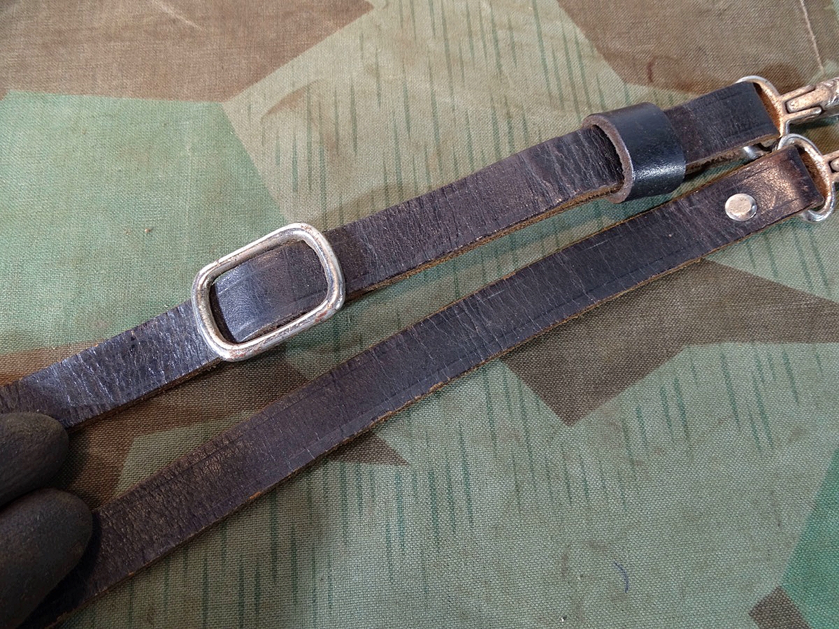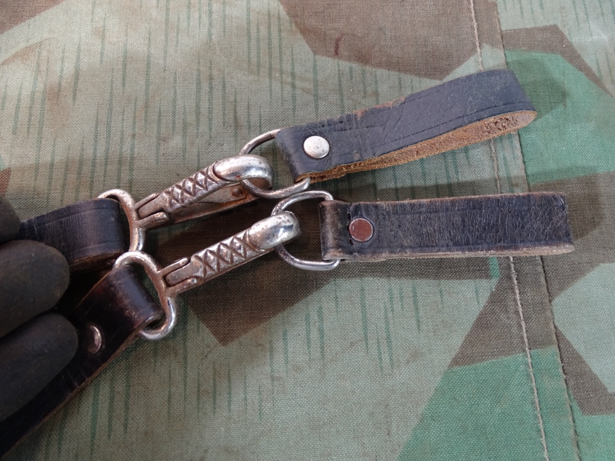 Leder gut beweglich, gut erhalten. Auch getragen von Polizei, Feuerwehr Mitgliedern von Partei Organisationen wie SS, NSKK, DAF, HJ …So ausgezogen wie auf Bild ca. 88 cm bis zum Ende der Karabinerhaken, ohne Koppelschlaufen gemessen.