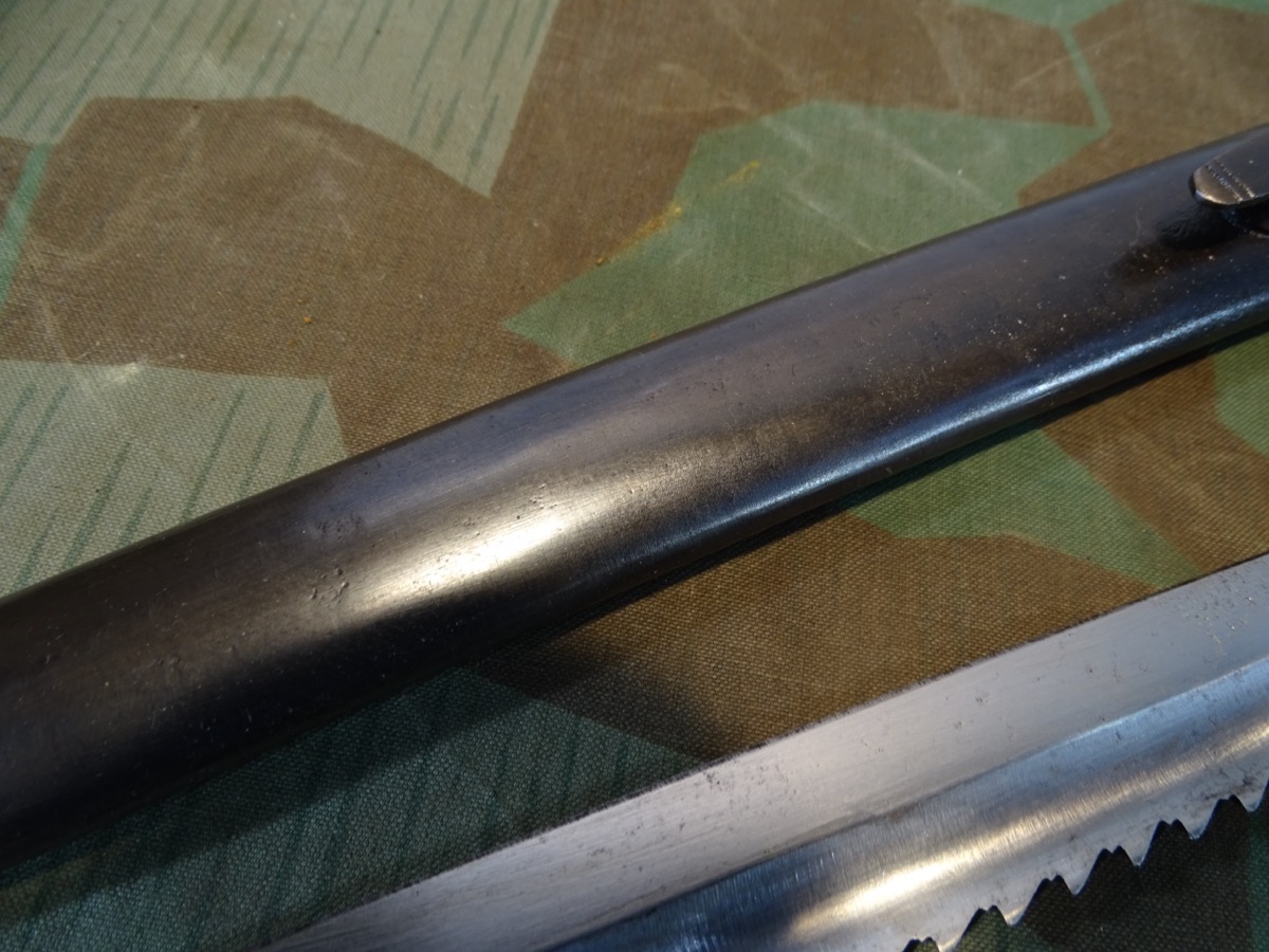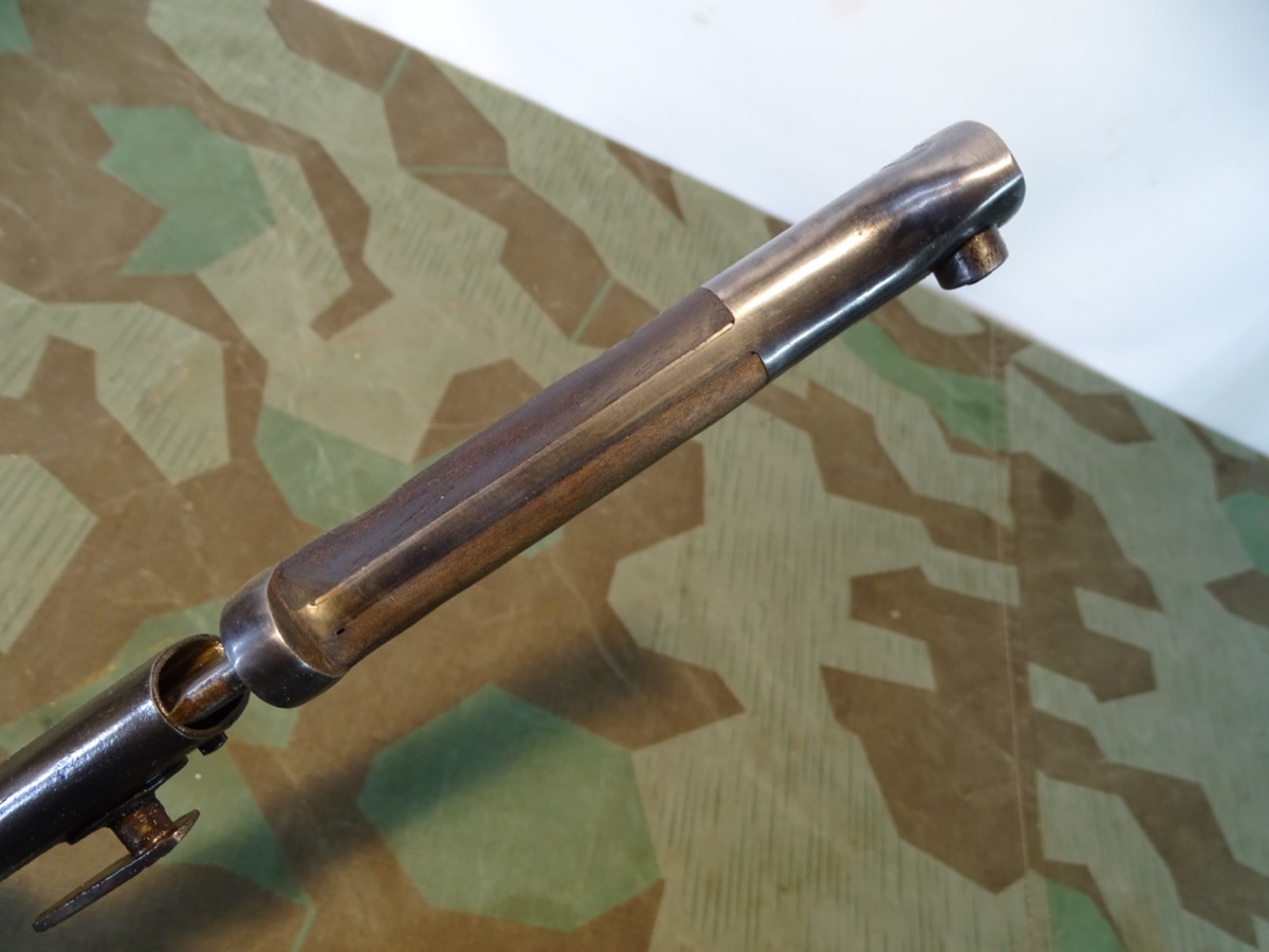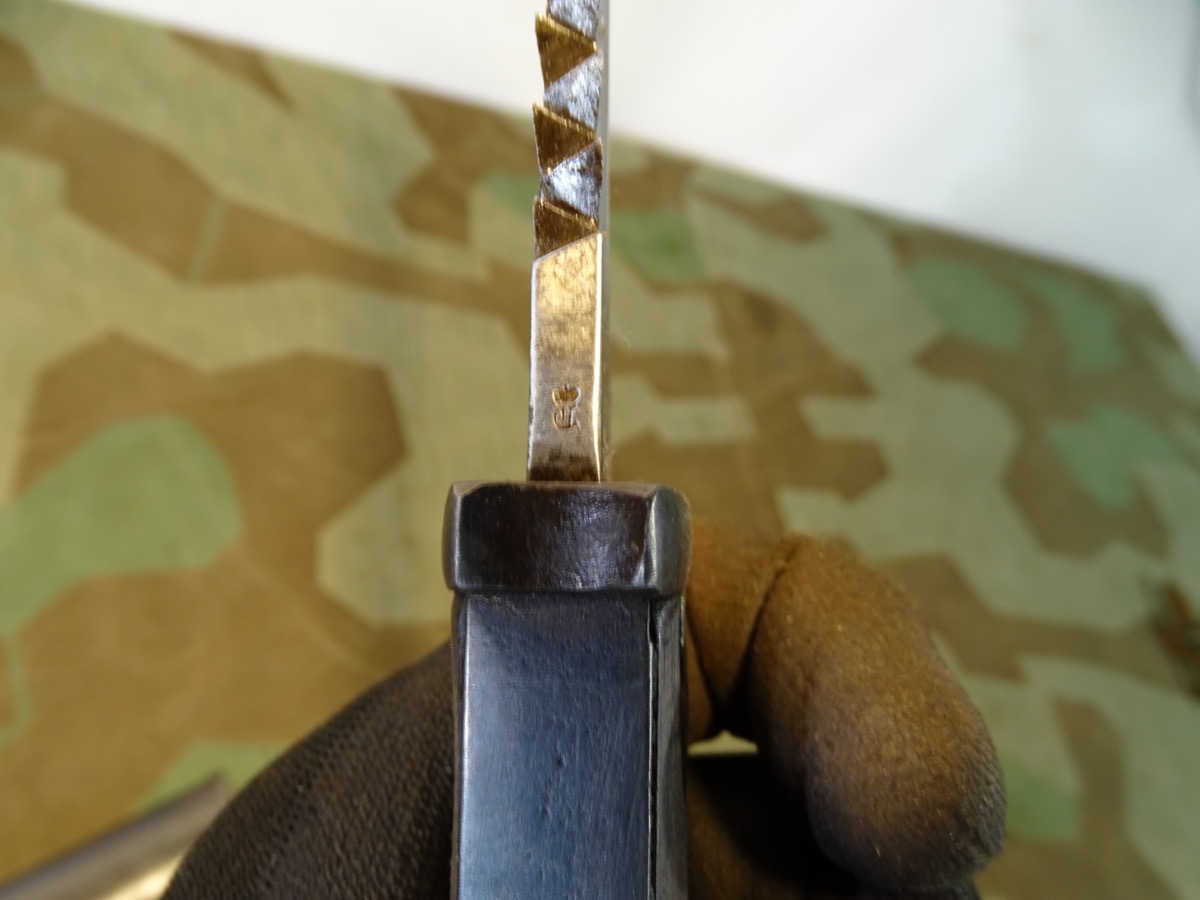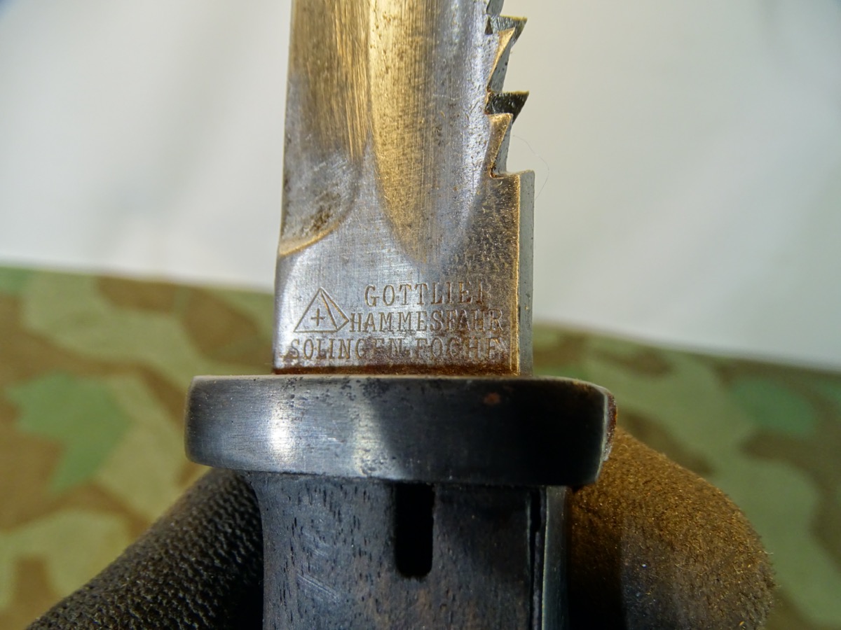 Ansprechender Zustand, siehe Fotos. Wohl mal im Laufe der Nutzung gereinigt und brüniert worden, daher nun fast komplett dunkel brüniert. Drücker klappt. Griffschalen gut erhalten. Klinge mit gut lesbarem Hersteller Gottlien Hammesfahr Solingen Foche. Klingenrücken mit kaiserlicher Waffenamtsabnahme, Buchstabe mit Krone. Scheide mit einer Beule, siehe Fotos. Frei verkäuflich ab 18 Jahren. Bei Bestellung bitte Altersnachweis mailen oder schicken ( Kopie / Foto vom gültigen Personalausweis)