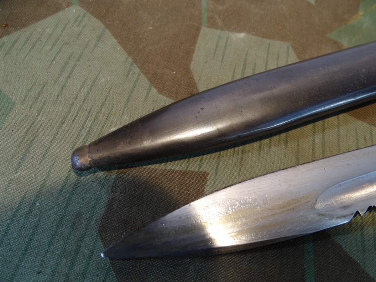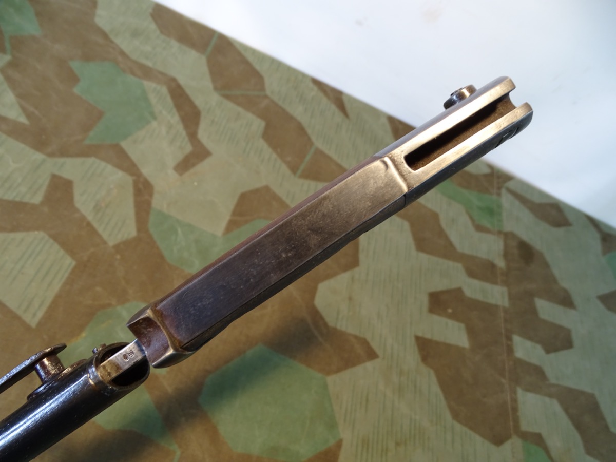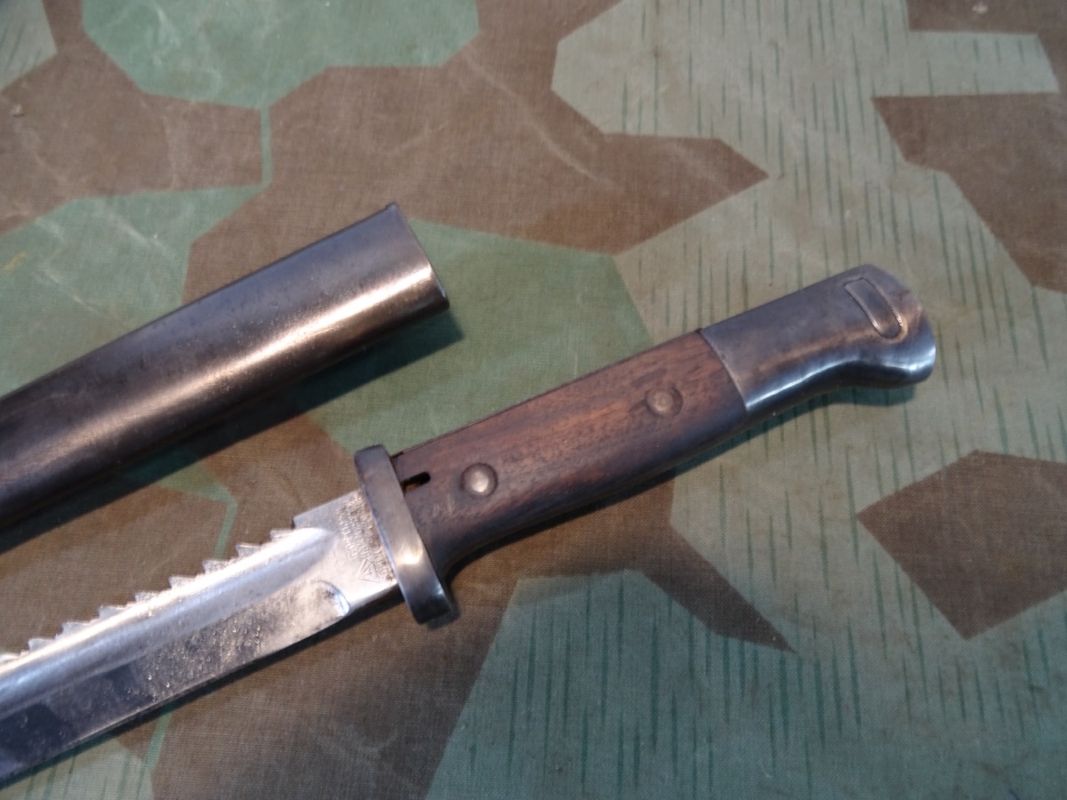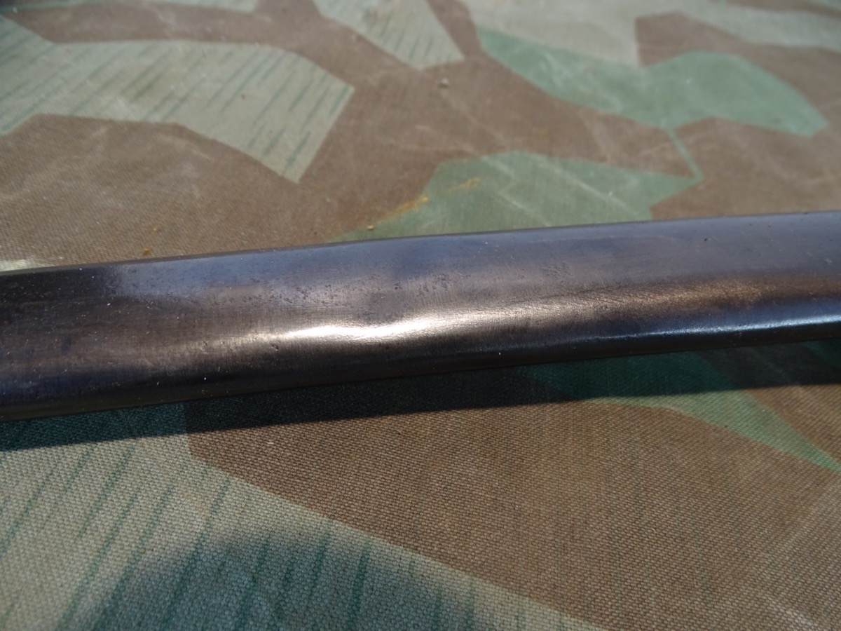 Ansprechender Zustand, siehe Fotos. Wohl mal im Laufe der Nutzung gereinigt und brüniert worden, daher nun fast komplett dunkel brüniert. Drücker klappt. Griffschalen gut erhalten. Klinge mit gut lesbarem Hersteller Gottlien Hammesfahr Solingen Foche. Klingenrücken mit kaiserlicher Waffenamtsabnahme, Buchstabe mit Krone. Scheide mit einer Beule, siehe Fotos. Frei verkäuflich ab 18 Jahren. Bei Bestellung bitte Altersnachweis mailen oder schicken ( Kopie / Foto vom gültigen Personalausweis)