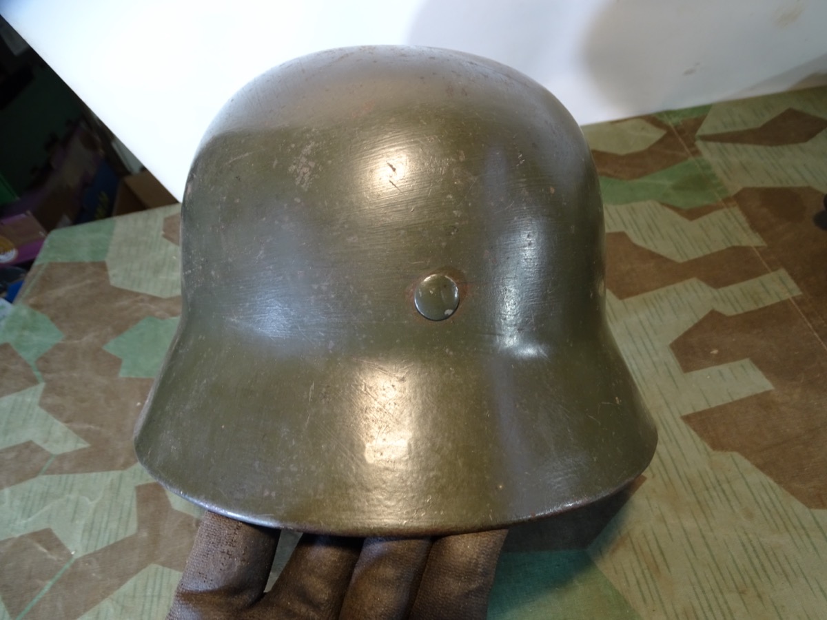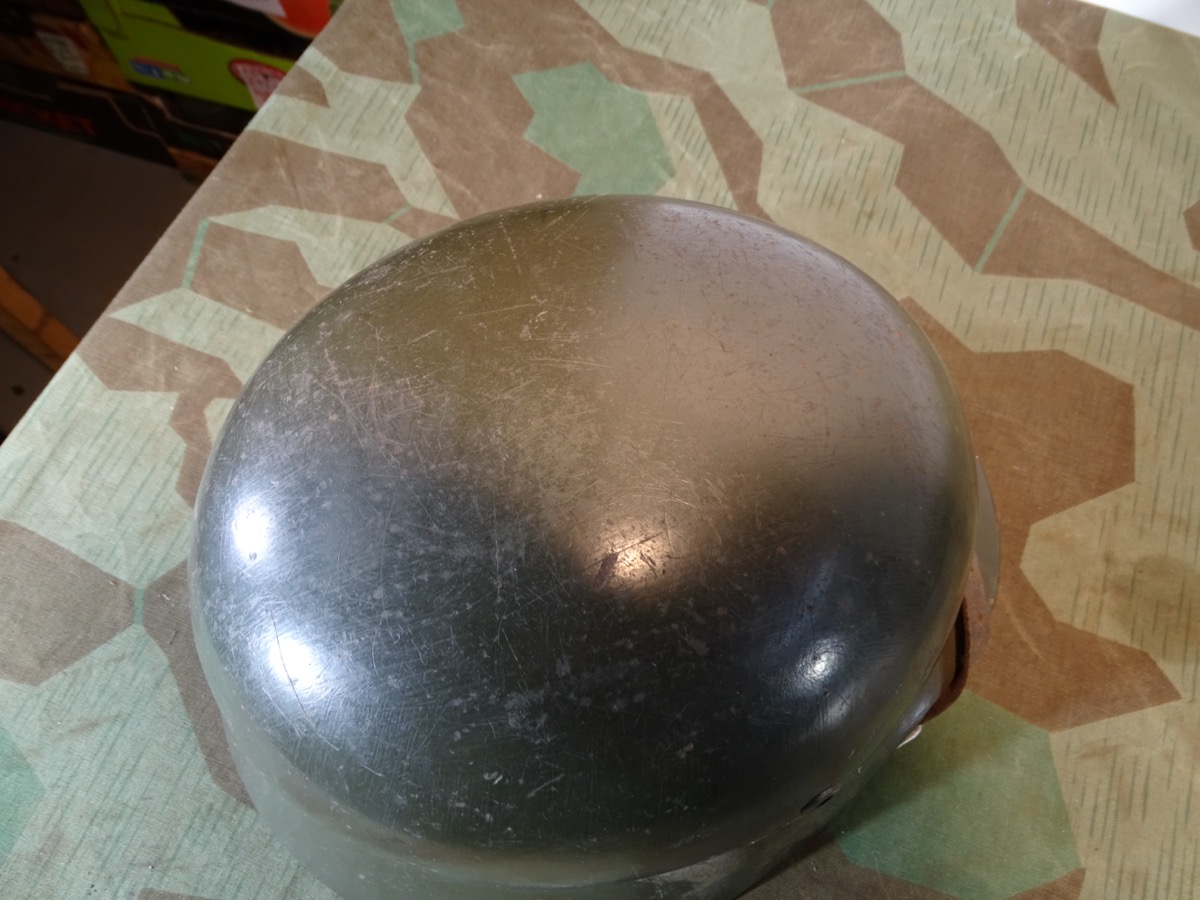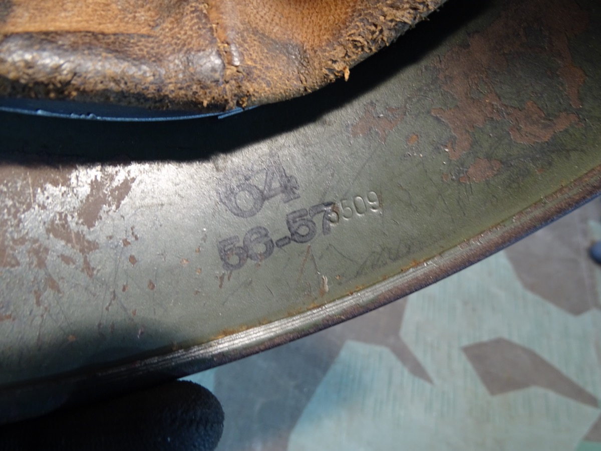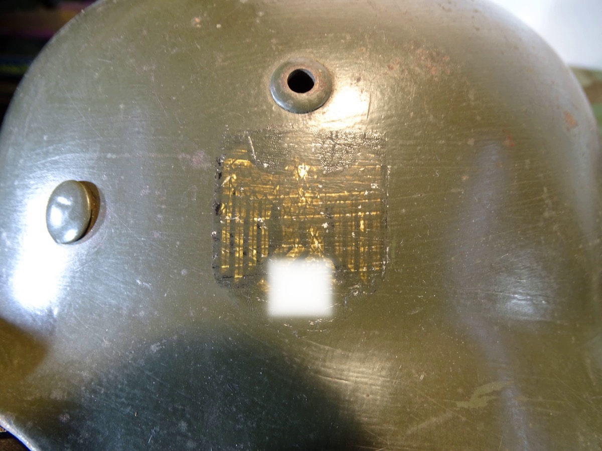Die Innenfarbe unverändert. Die farblich sehr ähnliche Außenfarbe ist mal nachgestrichen worden. Wohl im Rahmen von tournusmäßigen Instandsetzungen bei der Wehrmacht. Dabei wurde das Adleremblem teils überstrichen. Ist anber noch gut zu erkennen. Auf der Gegenseite hat der Vorbesitzer mal ein Papier Landeswappen aufgeklebt.
