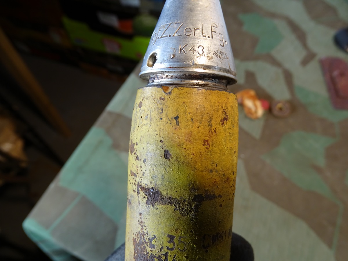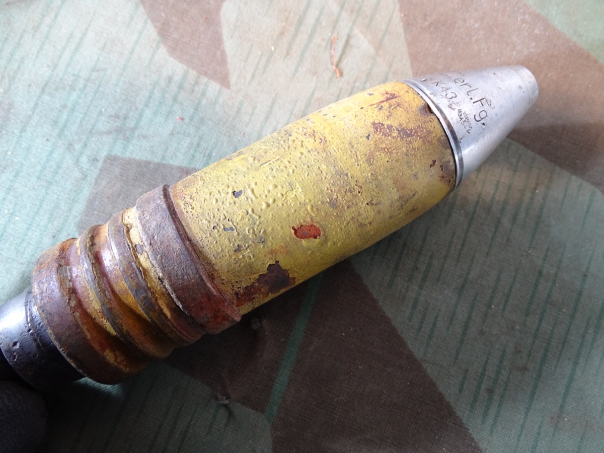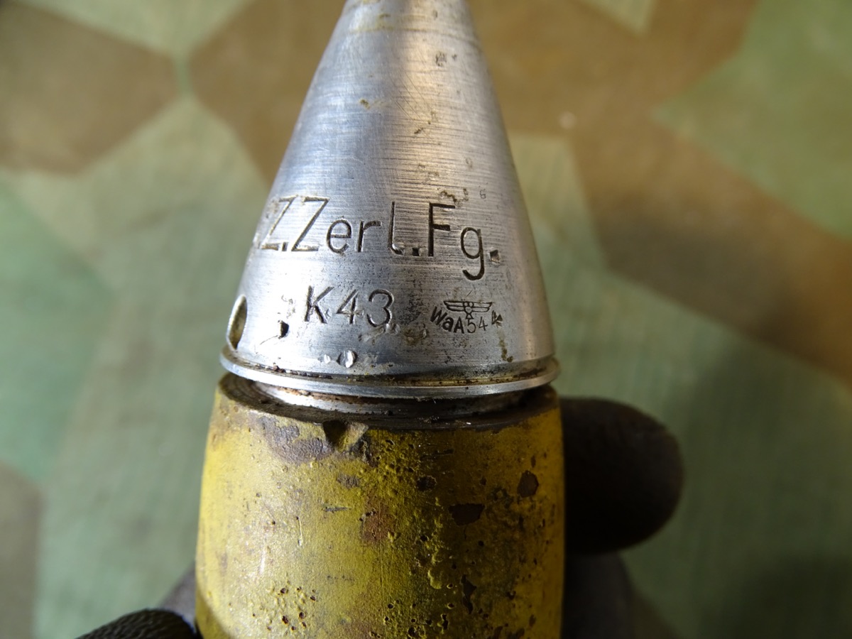 Schöner Zustand, angekauft aus einer Museumsauflösung. Geschoss noch fast komplett originallackiert. Schlagstempel auch noch gut erkennbar, auch WaA Adler. Späte Variante mit wenig Tintenstempeln auf dem gelben Lack, hatte nur eine kleine Farbstempel Beschriftung oben auf dem Rand, die noch schwach erkennbar ist.