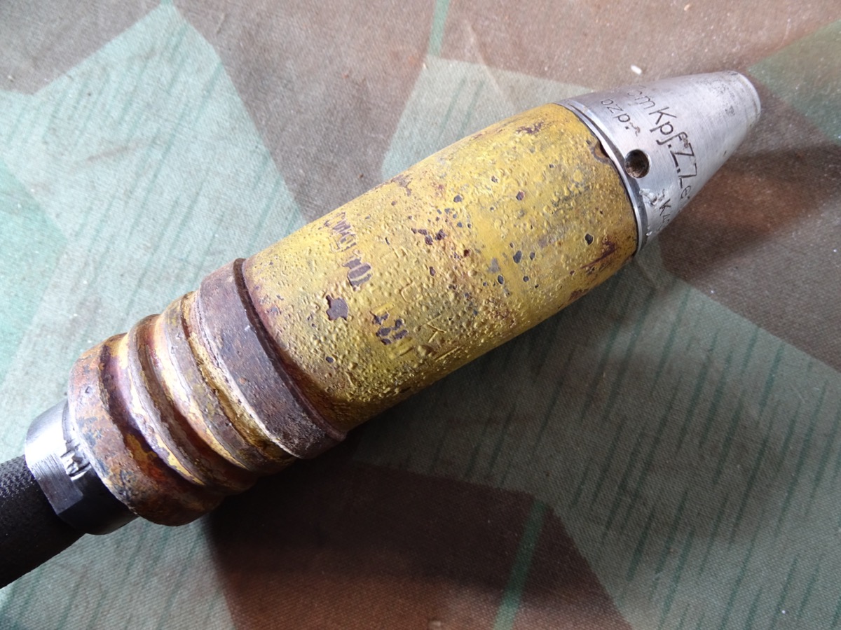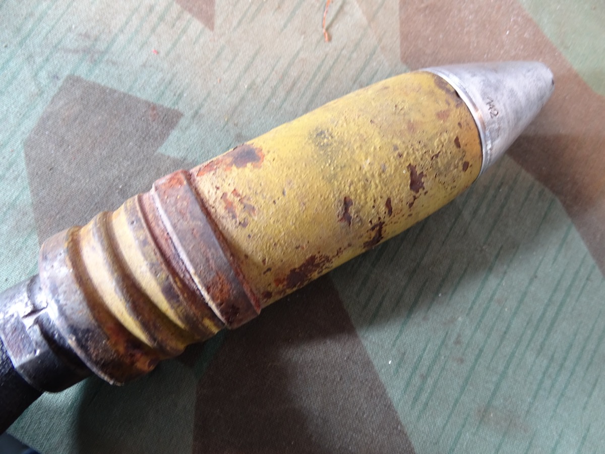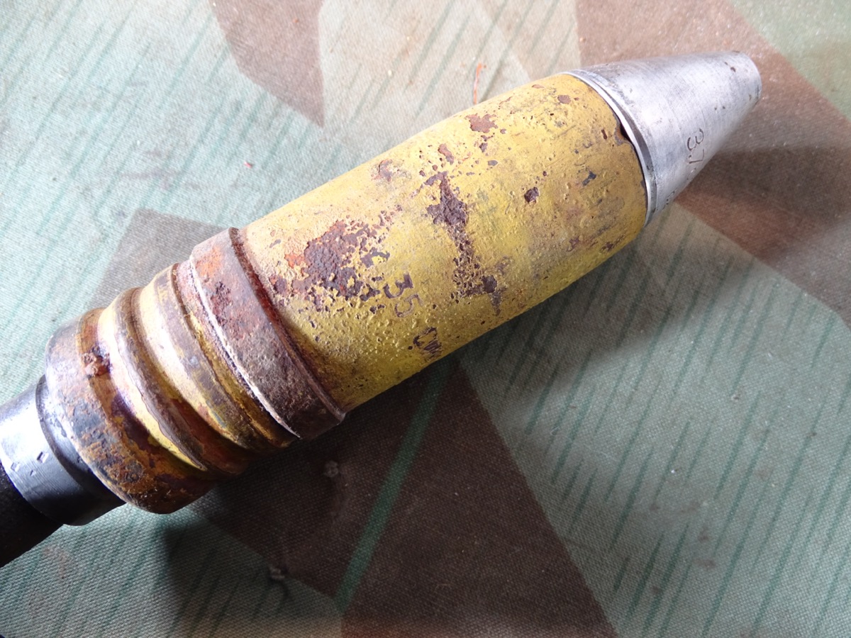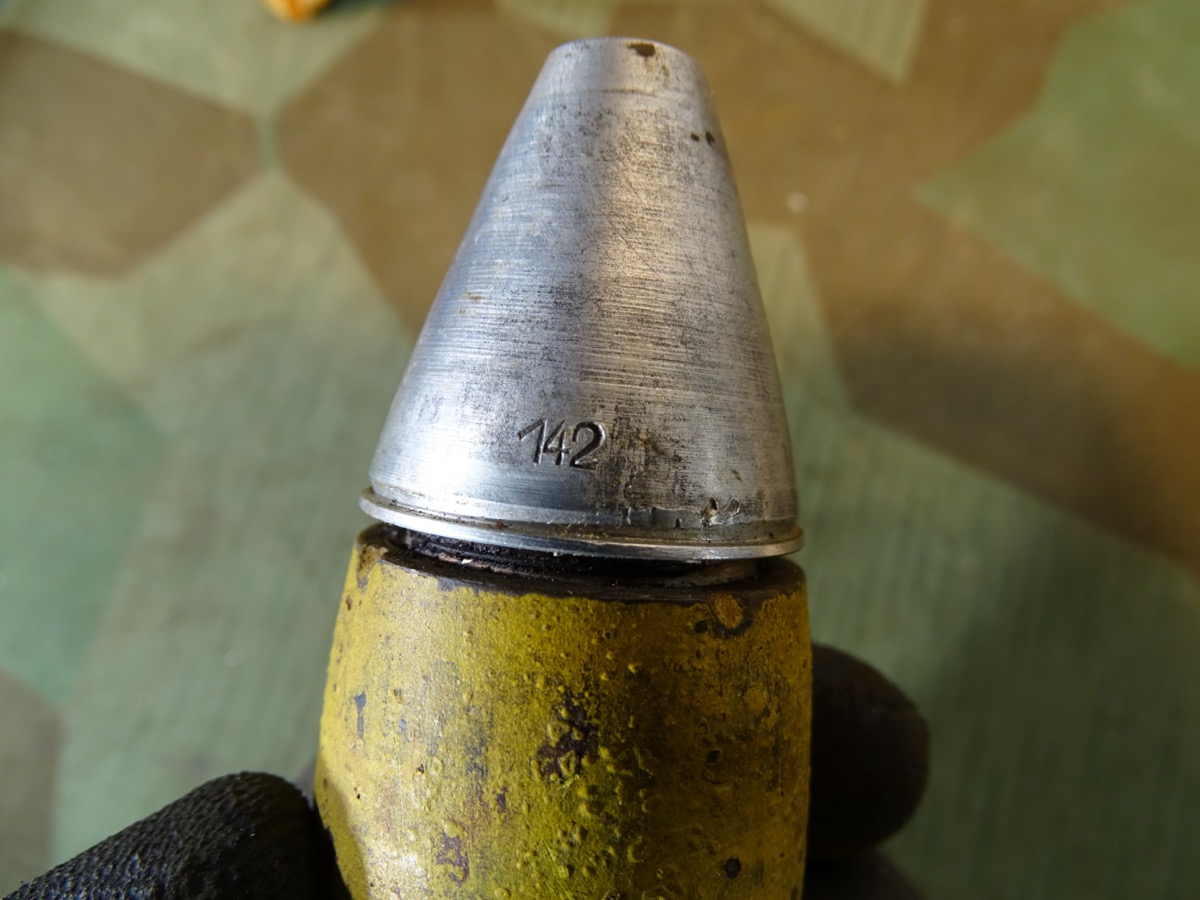 Schöner Zustand, angekauft aus einer Museumsauflösung. Geschoss noch fast komplett originallackiert. Schlagstempel auch noch gut erkennbar, auch WaA Adler. Späte Variante mit wenig Tintenstempeln auf dem gelben Lack, hatte nur eine kleine Farbstempel Beschriftung oben auf dem Rand, die noch schwach erkennbar ist.