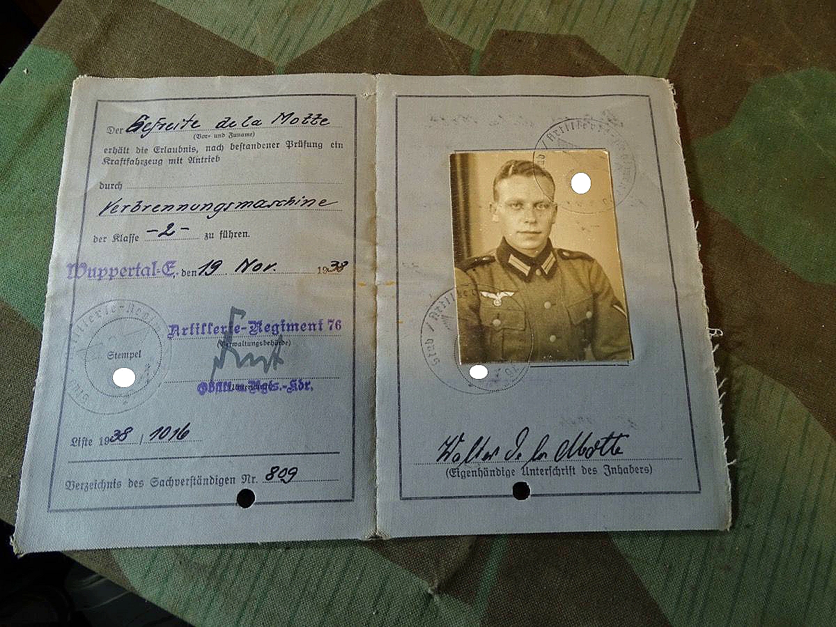 Wehrmacht Führerschein 1938, Gefr. W.de La Motte, aus Solingen, 2./ Art. Rgt. 76 -Wuppertal , Bild