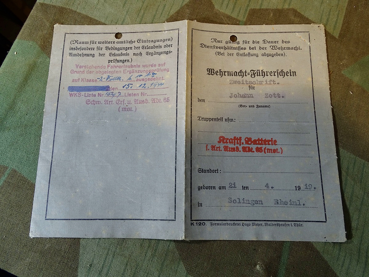 Wehrmacht Führerschein 1944, J.Zott aus SG, Kraftf. Batterie, schw. Art. Ers. Abt 65, Vollkette