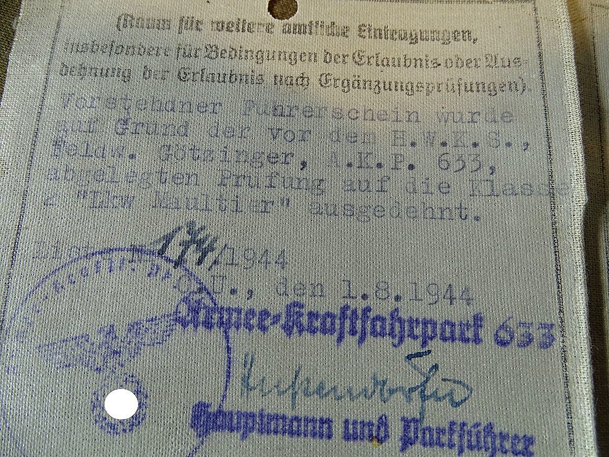 Führerscheine von Pionier Truppenteilen sind relativ selten zu finden. Ebenso selten sind Einträge für Zugkraftwagen und Maultier.Zustand siehe Fotos.