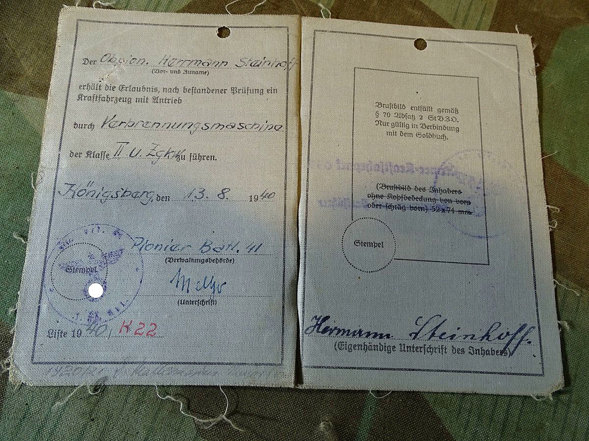Wehrmacht Führerschein, H.Steinhoff, Düsseldorf, Pionier Btl. 41 Brücken Komp.1, Königsberg, Zugkraftwagen, Maultier