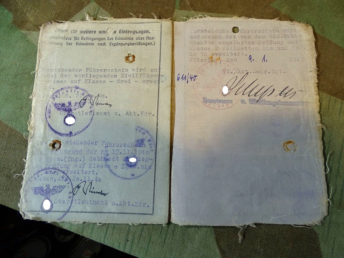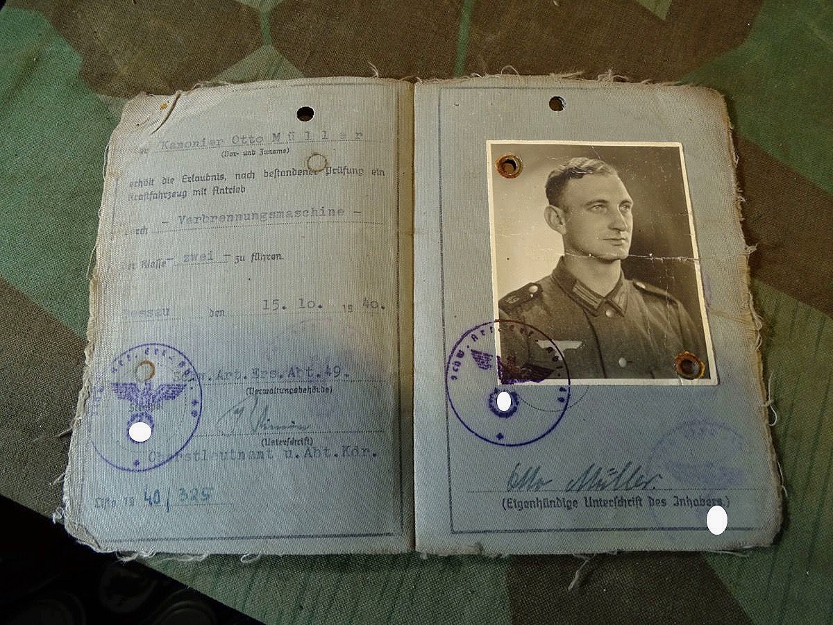 Wehrmacht Führerschein, Kanonier O. Müller aus SG, schw. Art. Ers. Abt 49, Zugkraftwagen und Vollkette, Bild