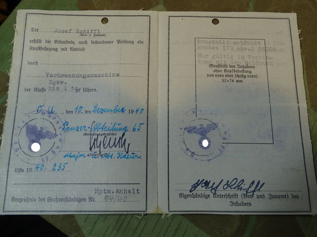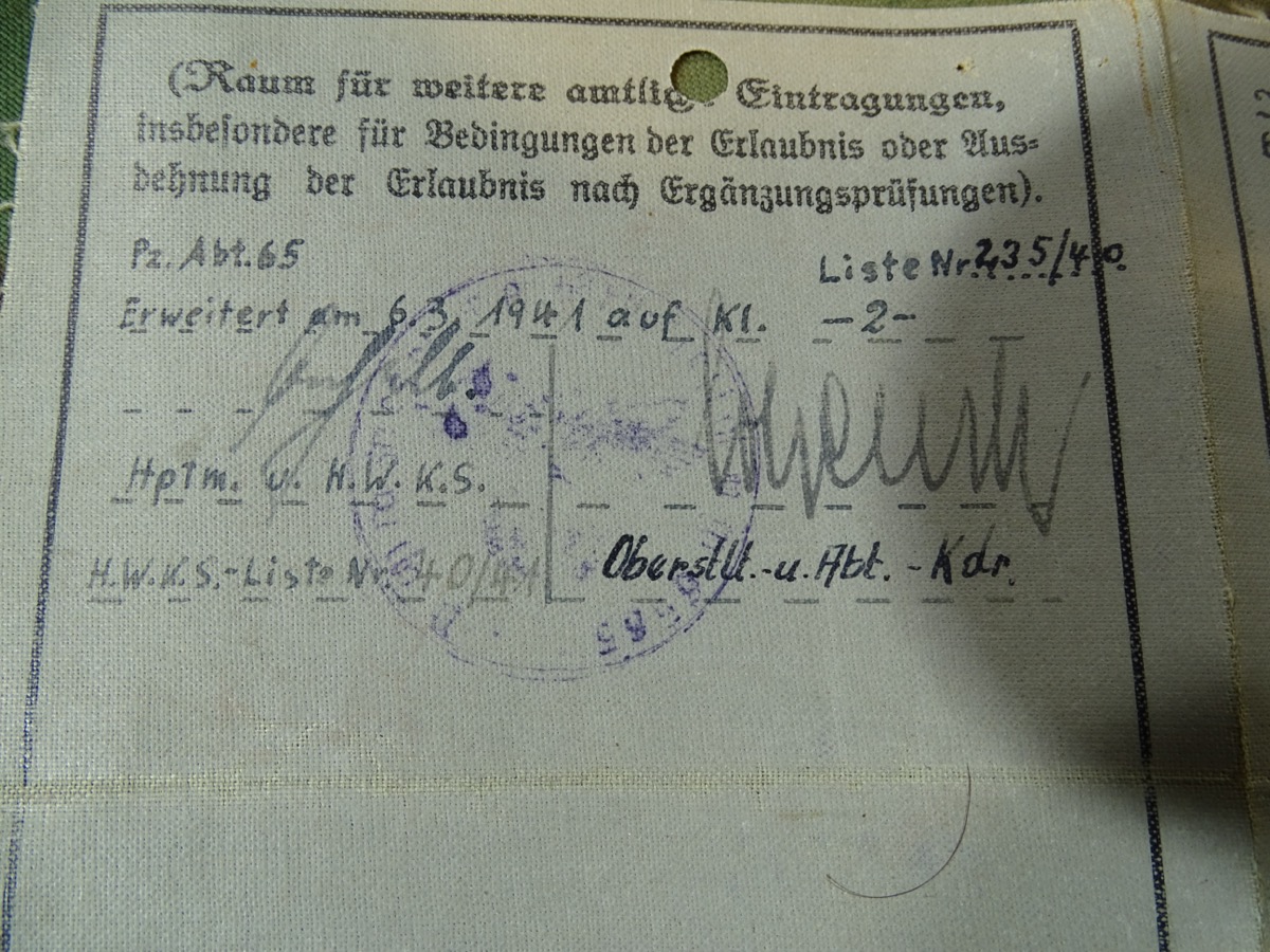 Führerscheine von Panzer Truppenteilen sind relativ selten zu finden. Die Panzer Abt. 65 gab es nur von 1937-42, danach wurde sie ins Pz. Rgt. 11 eingegleidert. Die Abteilung war im Polenfeldzug der 1. leichten Division unterstellt. Nach deren Umbenennung unterstand die Abteilung der 6. Panzer-Division.