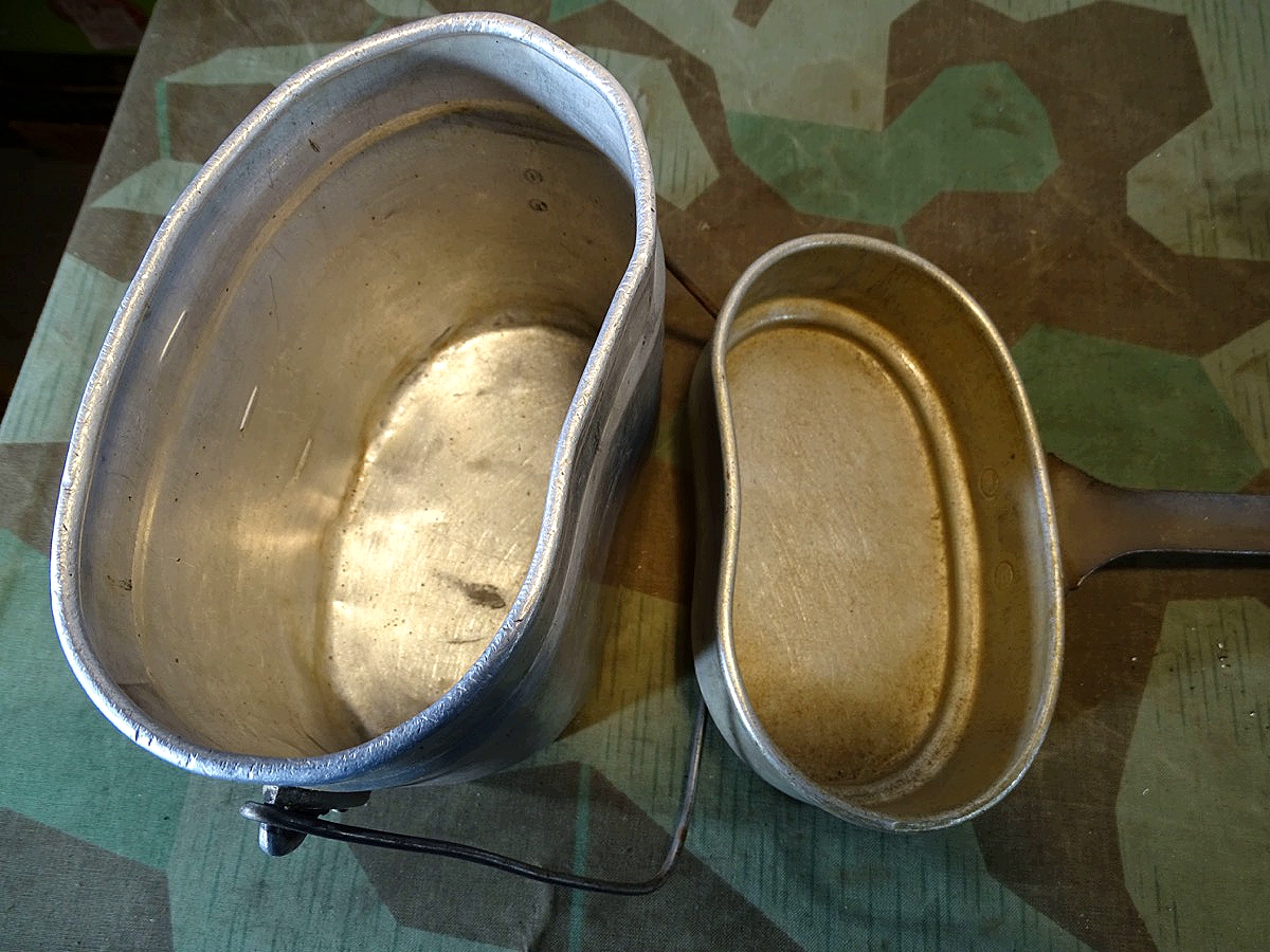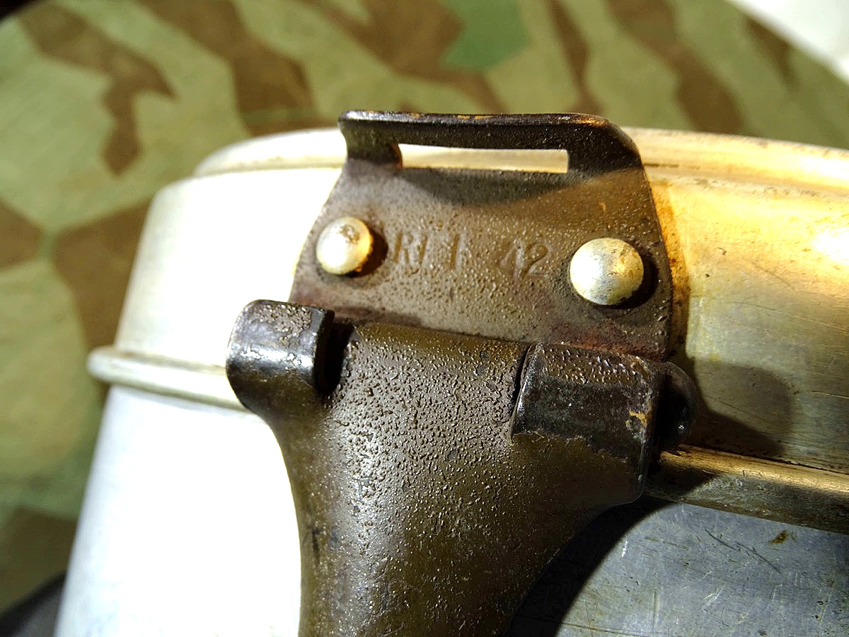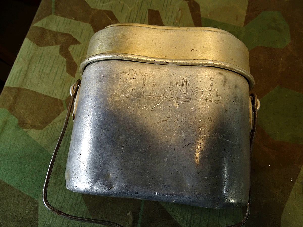 Wehrmacht Kochgeschirr, Komplett von 1942. Unten ESB 42, Deckel RFI 1942 für R. Fissler Idar Oberstein ( Schnellkochtopf)