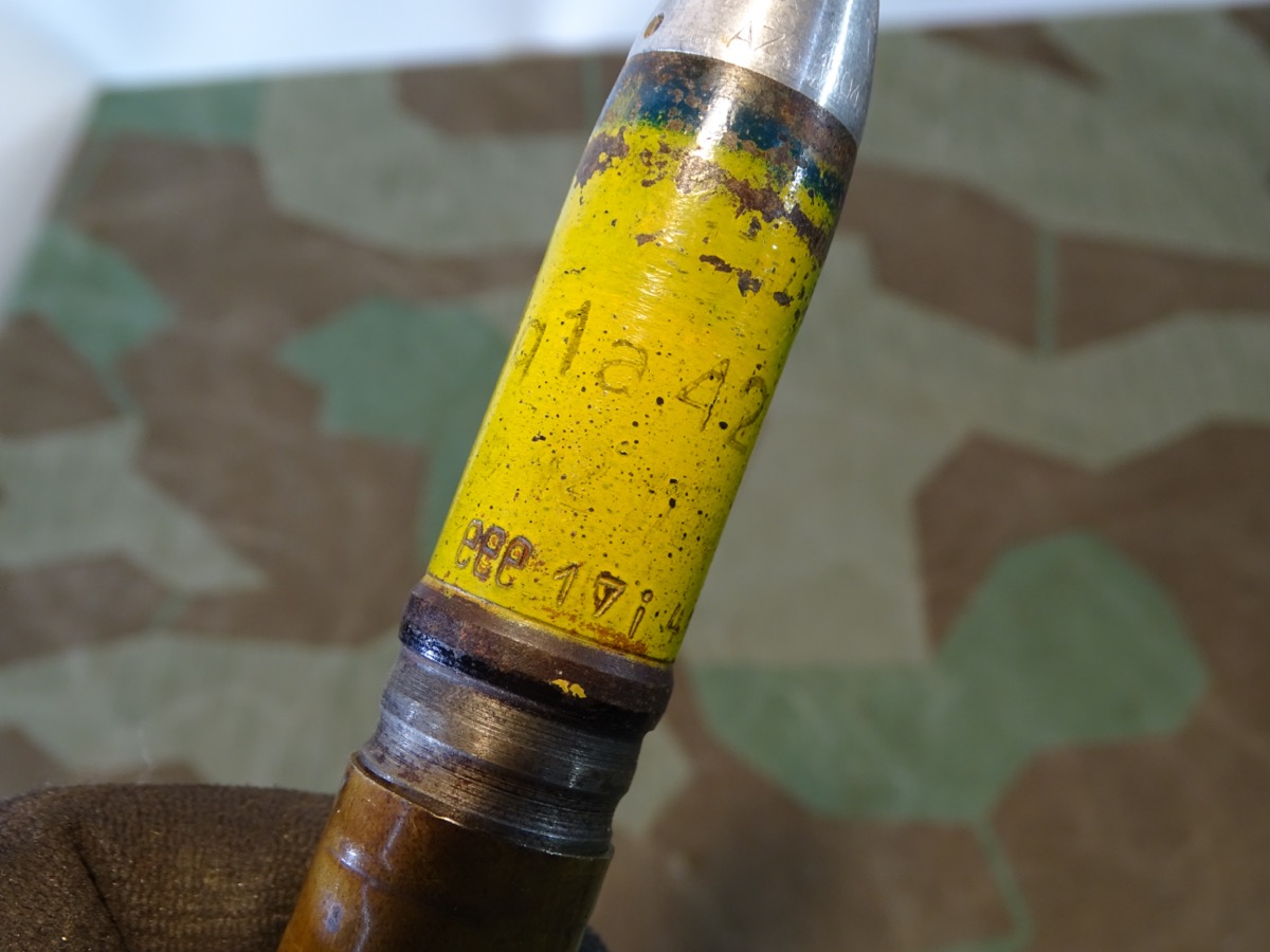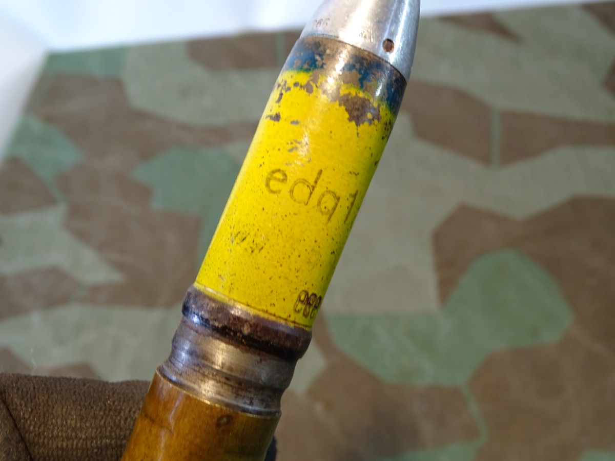 Kein Versand ins Ausland , NO Shipping to foreign countrys possible. Selten in dieser sehr schönen Erhaltung zu finden !. 20mm Deko-Patrone, sie wurden bei der Luftwaffe aus der Maschinenkanone MG 151/20 verschossen. Buntmetall Hülse mit Sprenggranate und Zerlege-Zünder aus Alu. Geschoss noch fast komplett mit gelber Originalfarbe und - Beschriftung wie Code und 1944 erhalten. Zünder mit Stempeln, Hülsenboden auch mit Hersteller Code Stempel. Gewinde gängig. Zustand siehe Fotos. Die Patrone ist gem. KWKG abgeändert, komplett delaboriert, kein zündfähiges Matrial enthalten. Bei Bestellung bitte Altersnachweis mitsenden (Kopie vom Personalausweis).