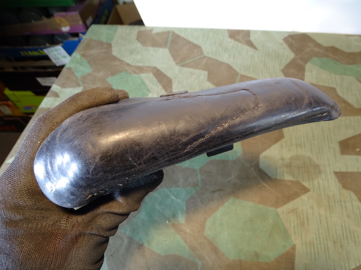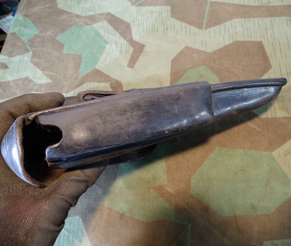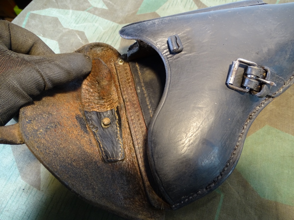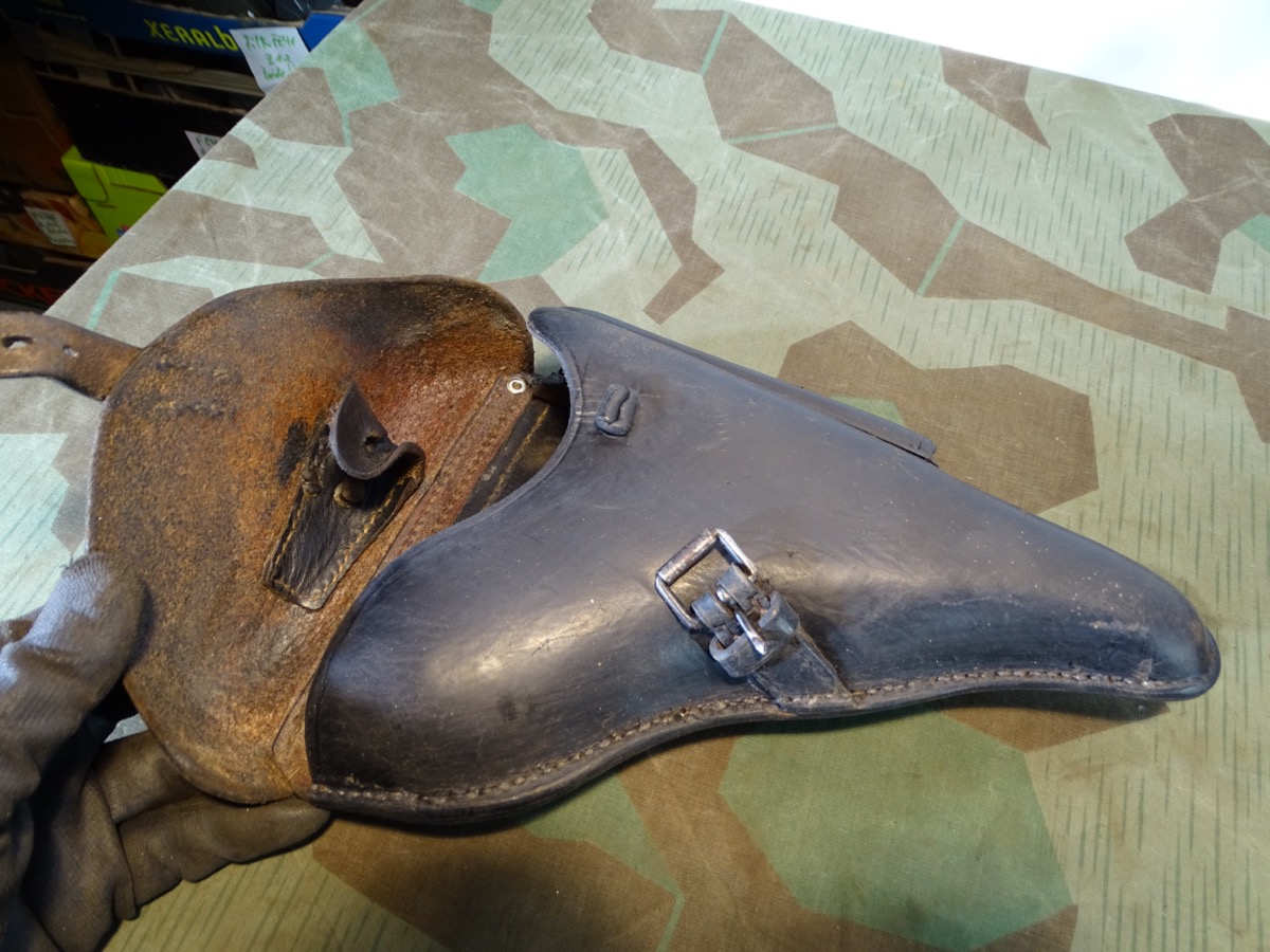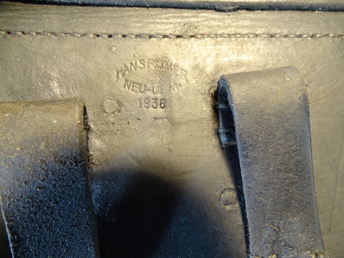 Lederteile noch gut erhalten und gut beweglich. Wehrmacht / Waffen SS, P 08 Koffertasche, gestempelt mit Hst Hans Römer neu Ulm 1936, früher WaA Adler Auf der Rückseite 2 Löcher im Leder fachmännsich verschlossen.