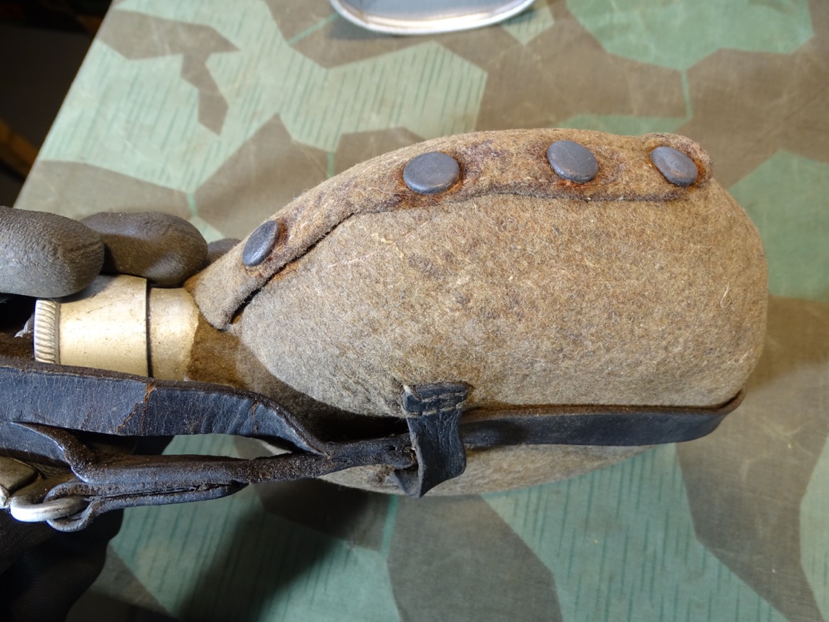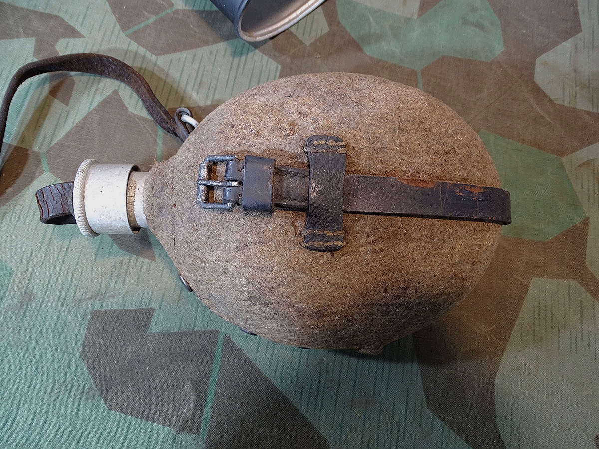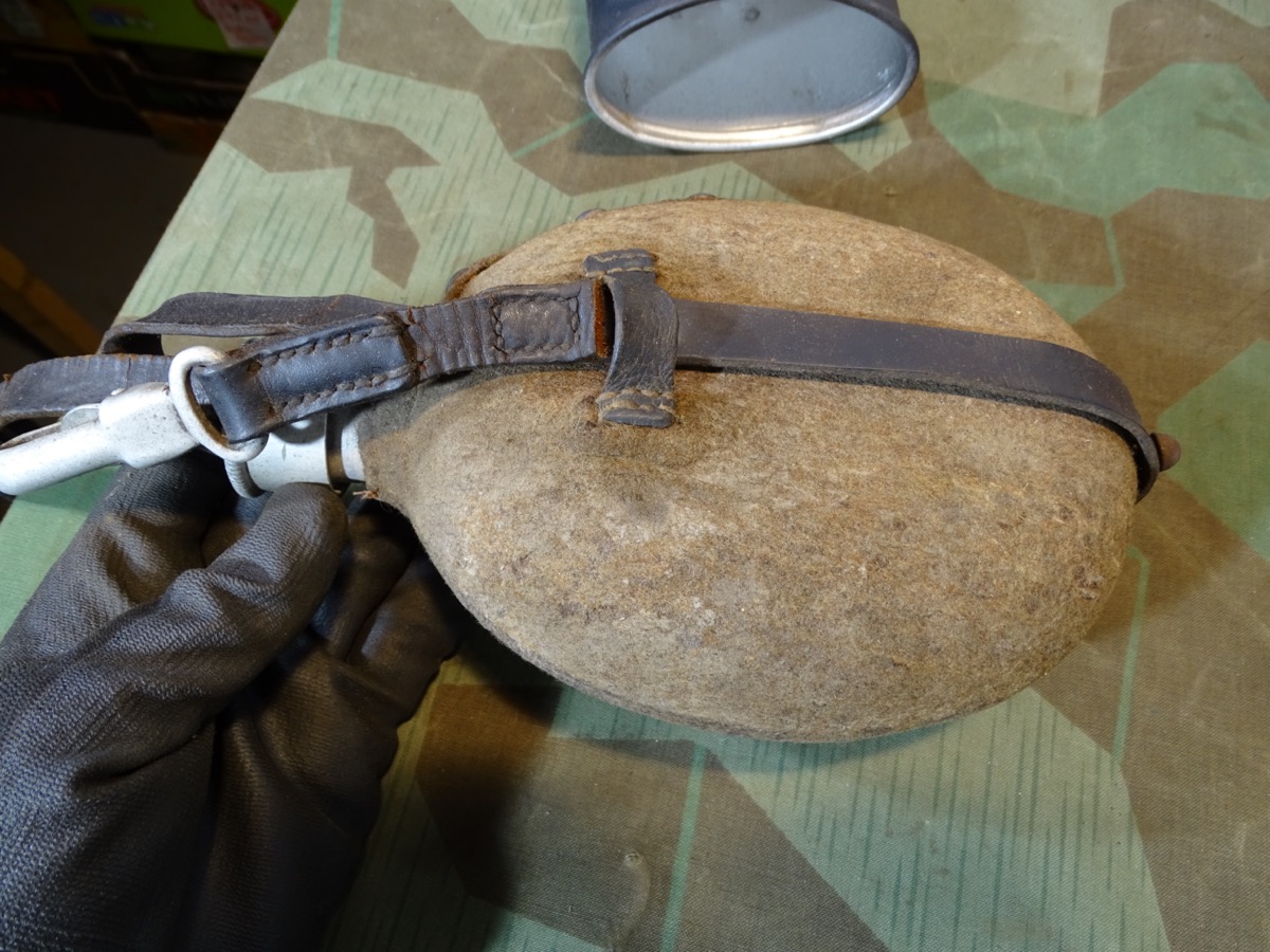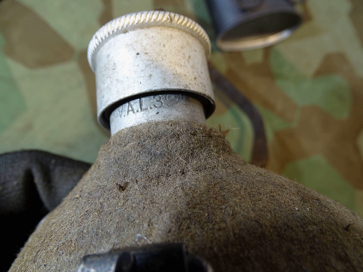 Flasche auf Deckel gestempelt L& SL 40 und auf Hals gestempelt : WAL 1939. Beriemung relativ trocken. Alu Koppelhaken. Später Bezug mit glatten Druckknöpfen, Filz mit Alters - u. Nutzungsspuren. Becher mit schwach erkennbarer Hersteller Marke. Becher wohl mal überlackiert.