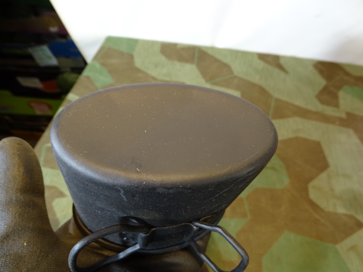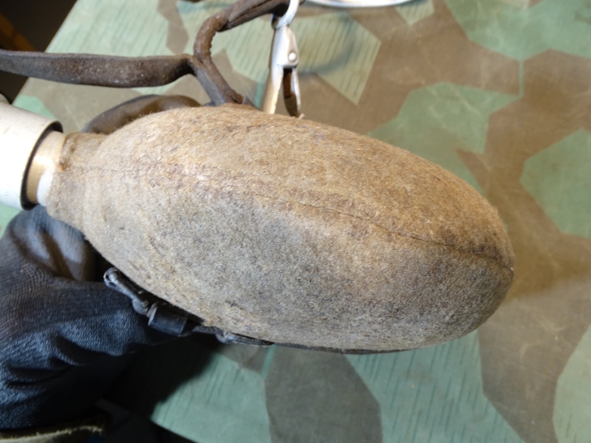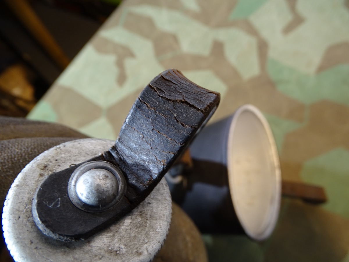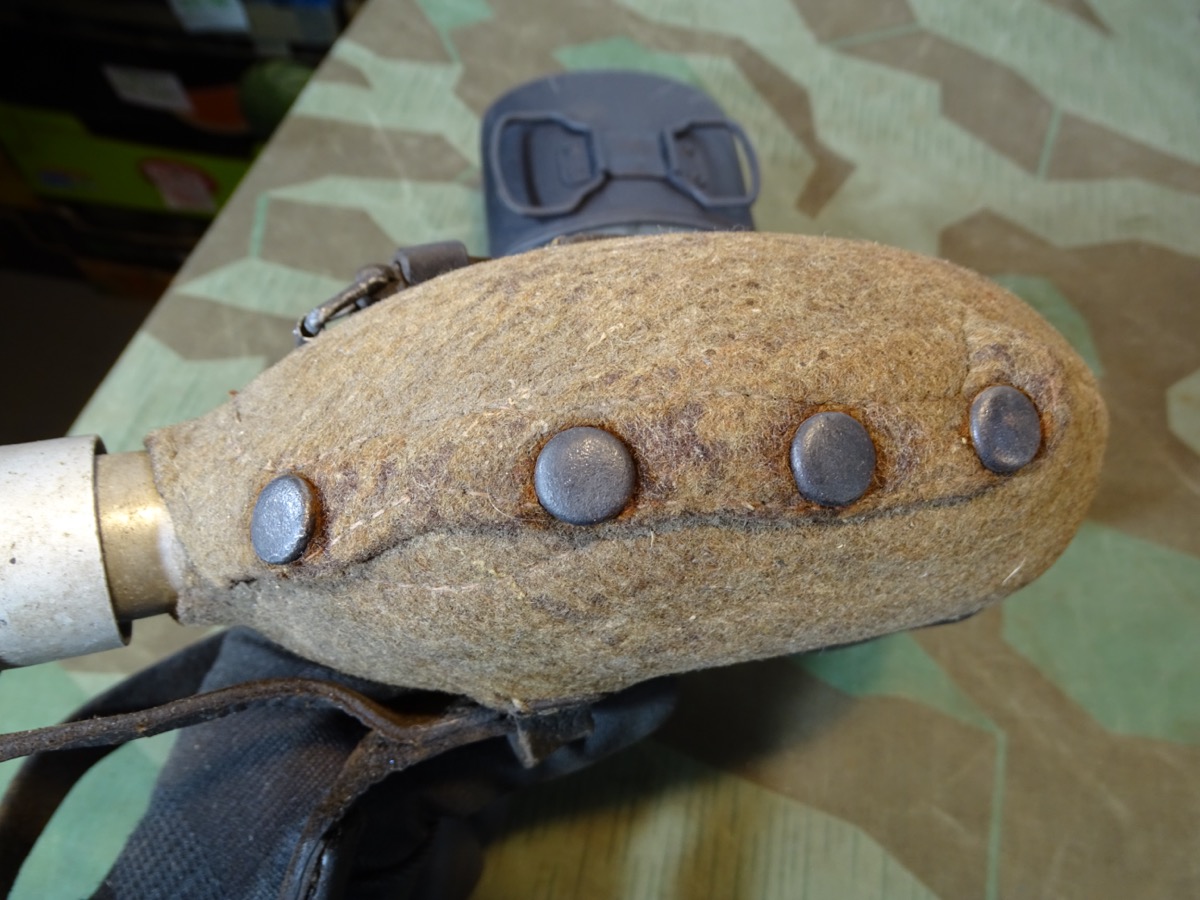 Flasche auf Deckel gestempelt L& SL 40 und auf Hals gestempelt : WAL 1939. Beriemung relativ trocken. Alu Koppelhaken. Später Bezug mit glatten Druckknöpfen, Filz mit Alters - u. Nutzungsspuren. Becher mit schwach erkennbarer Hersteller Marke. Becher wohl mal überlackiert.