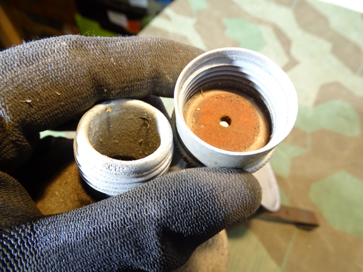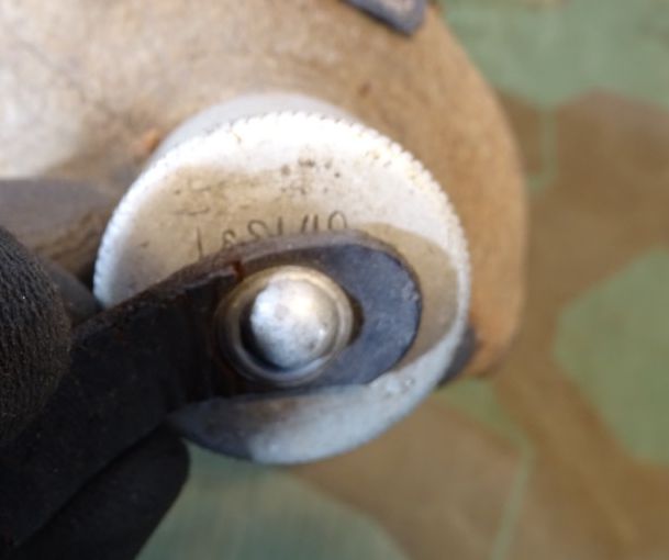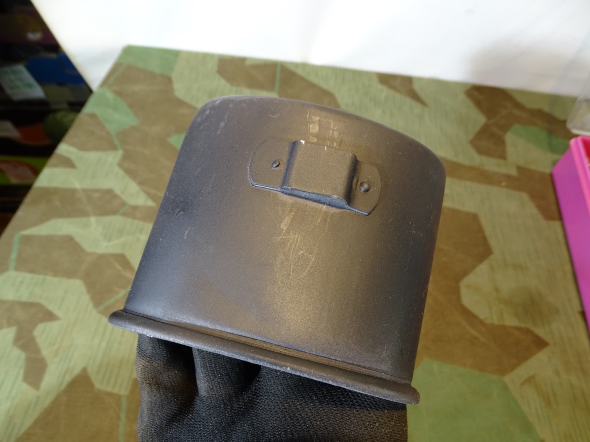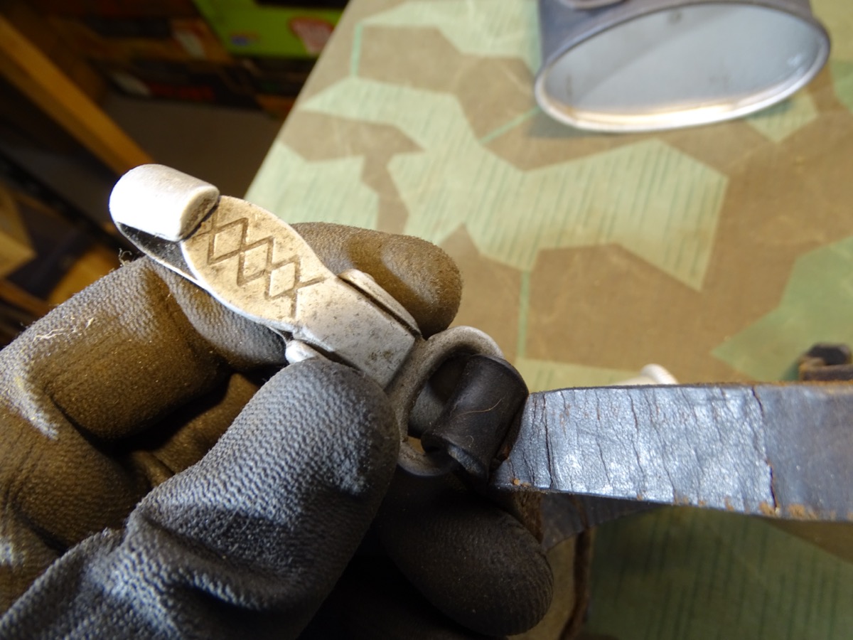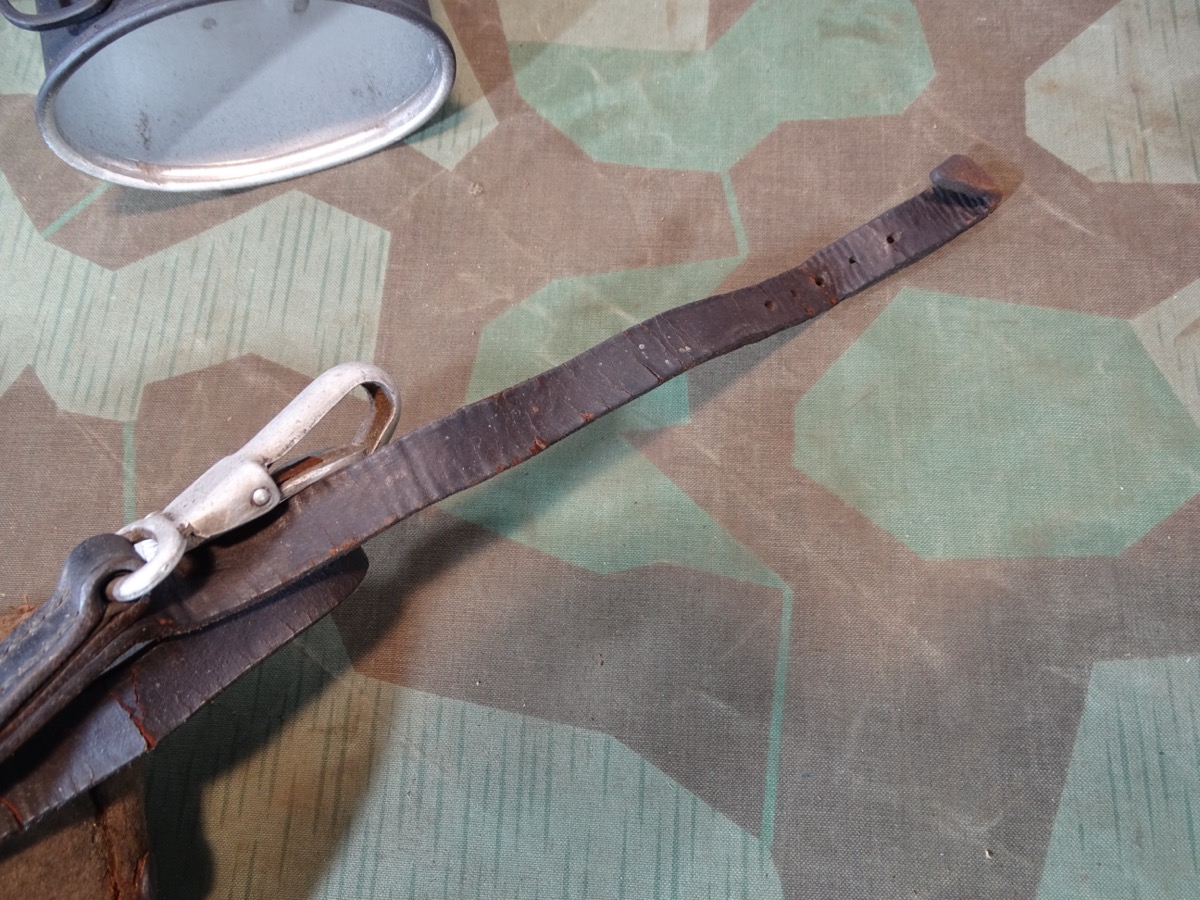 Flasche auf Deckel gestempelt L& SL 40 und auf Hals gestempelt : WAL 1939. Beriemung relativ trocken. Alu Koppelhaken. Später Bezug mit glatten Druckknöpfen, Filz mit Alters - u. Nutzungsspuren. Becher mit schwach erkennbarer Hersteller Marke. Becher wohl mal überlackiert.