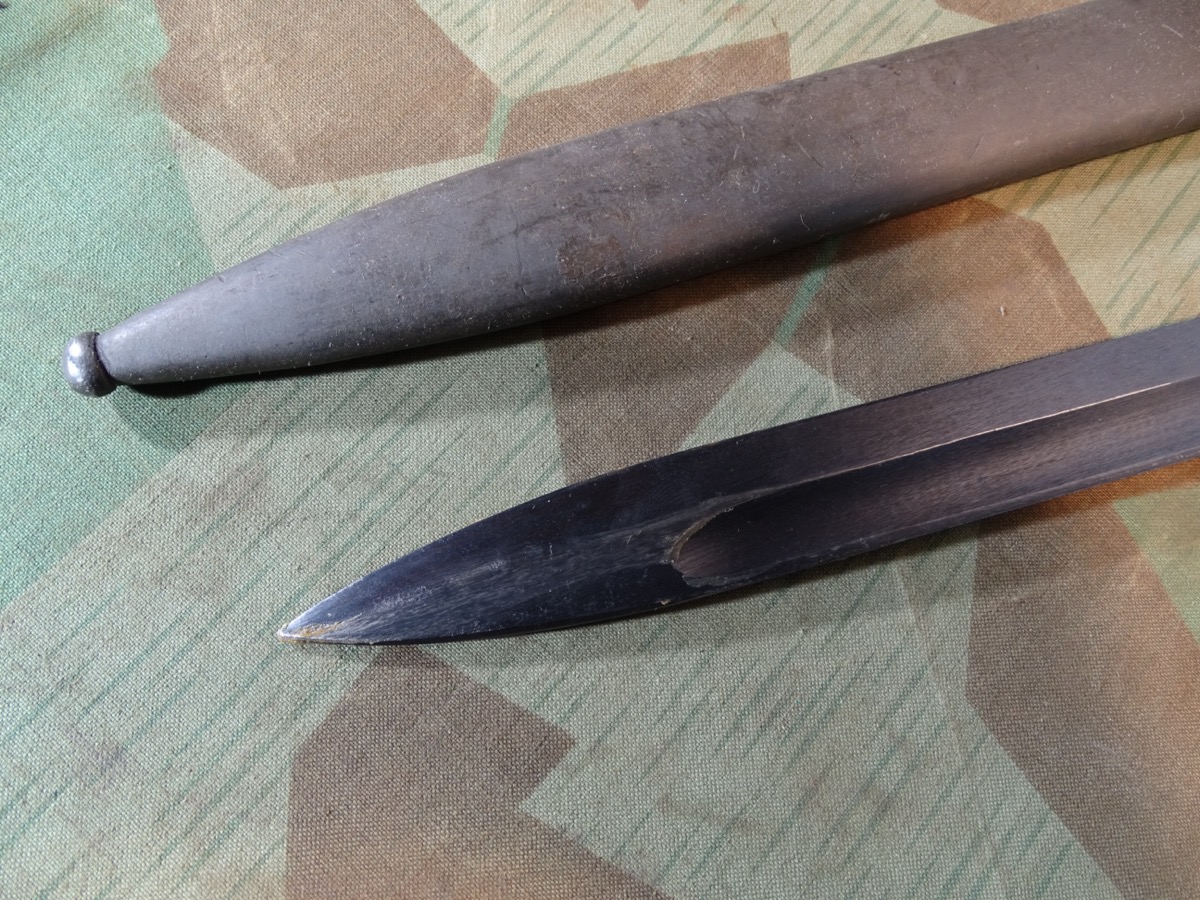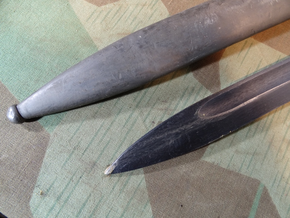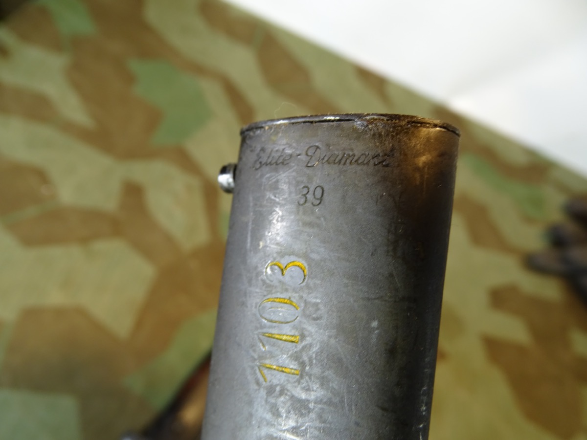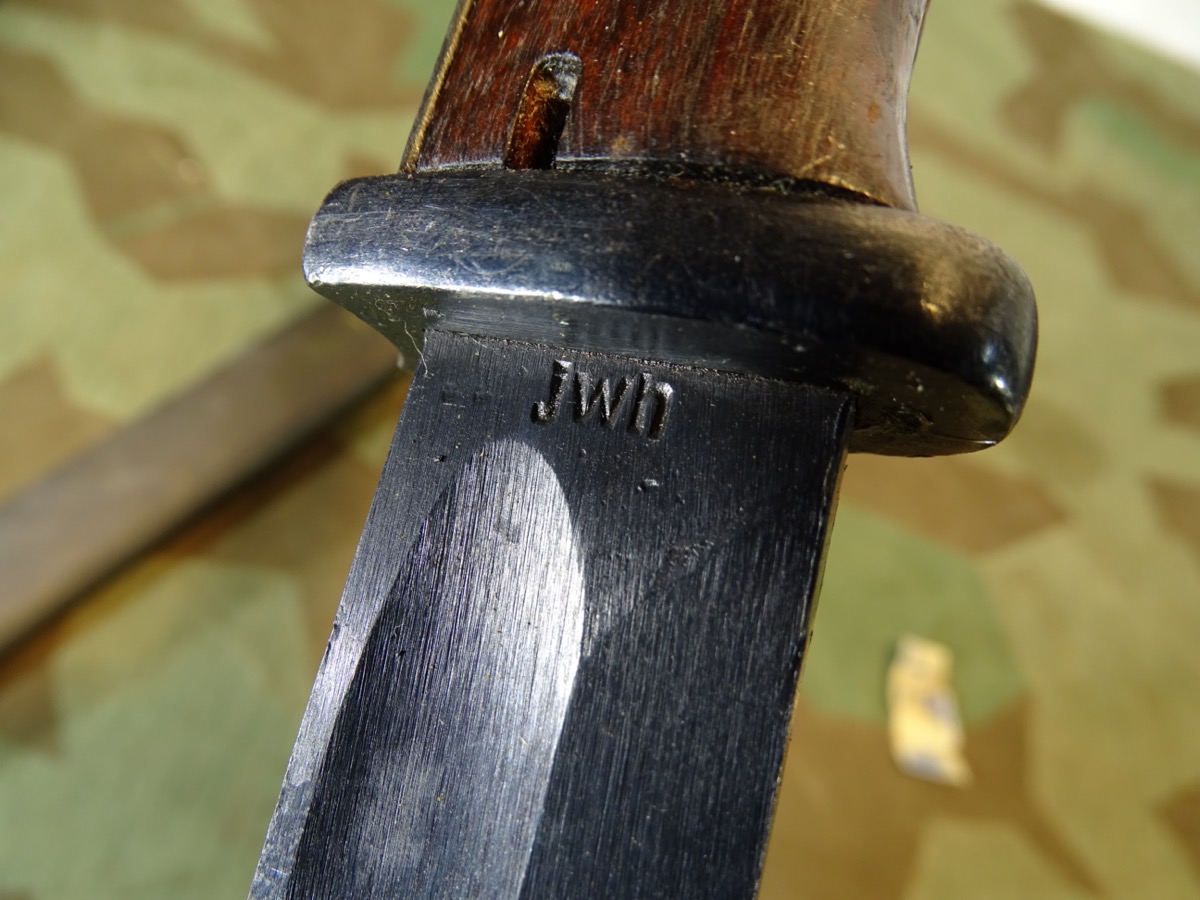 Seltener Hersteller, Staatliche Waffenfabrik Chatellerault Frankreich. Produktionszeit von diesem Hersteller waren nur die Jahre 1941-44. Bajonettdrücker klappt einwandfrei. Klinge mit schönem, klaren Herstellerstempel jwh, Klingenrücken mit 43 für 1943. Klinge noch fast komplett dunkel originalbrünniert, Griff und Scheide auch noch schön brüniert. Scheide mit Herstellermarke Elite Diamant 39 . Guter, leicht getragener Zustand, siehe Fotos. Bei Bestellung bitte Altersnachweis schicken oder mailen ( Kopie vom gültigen Personalausweis)