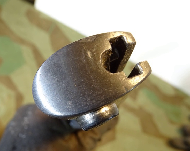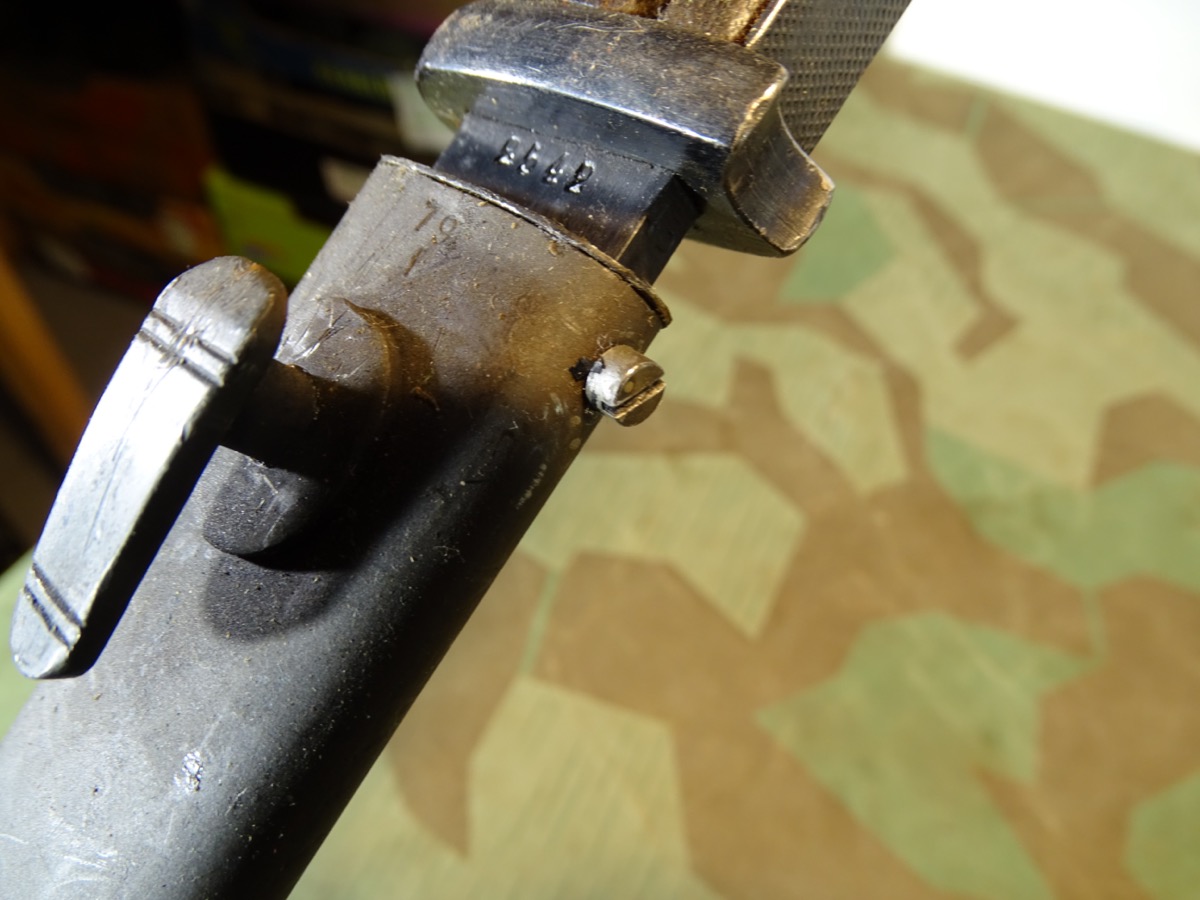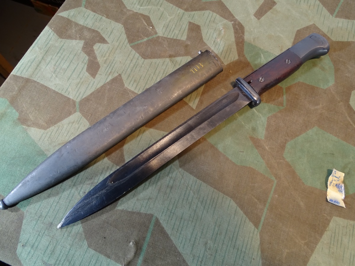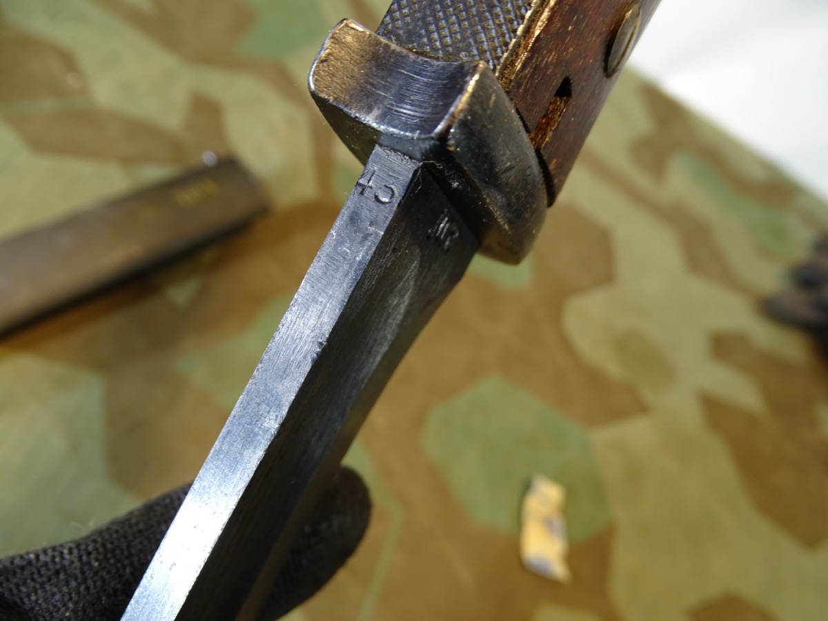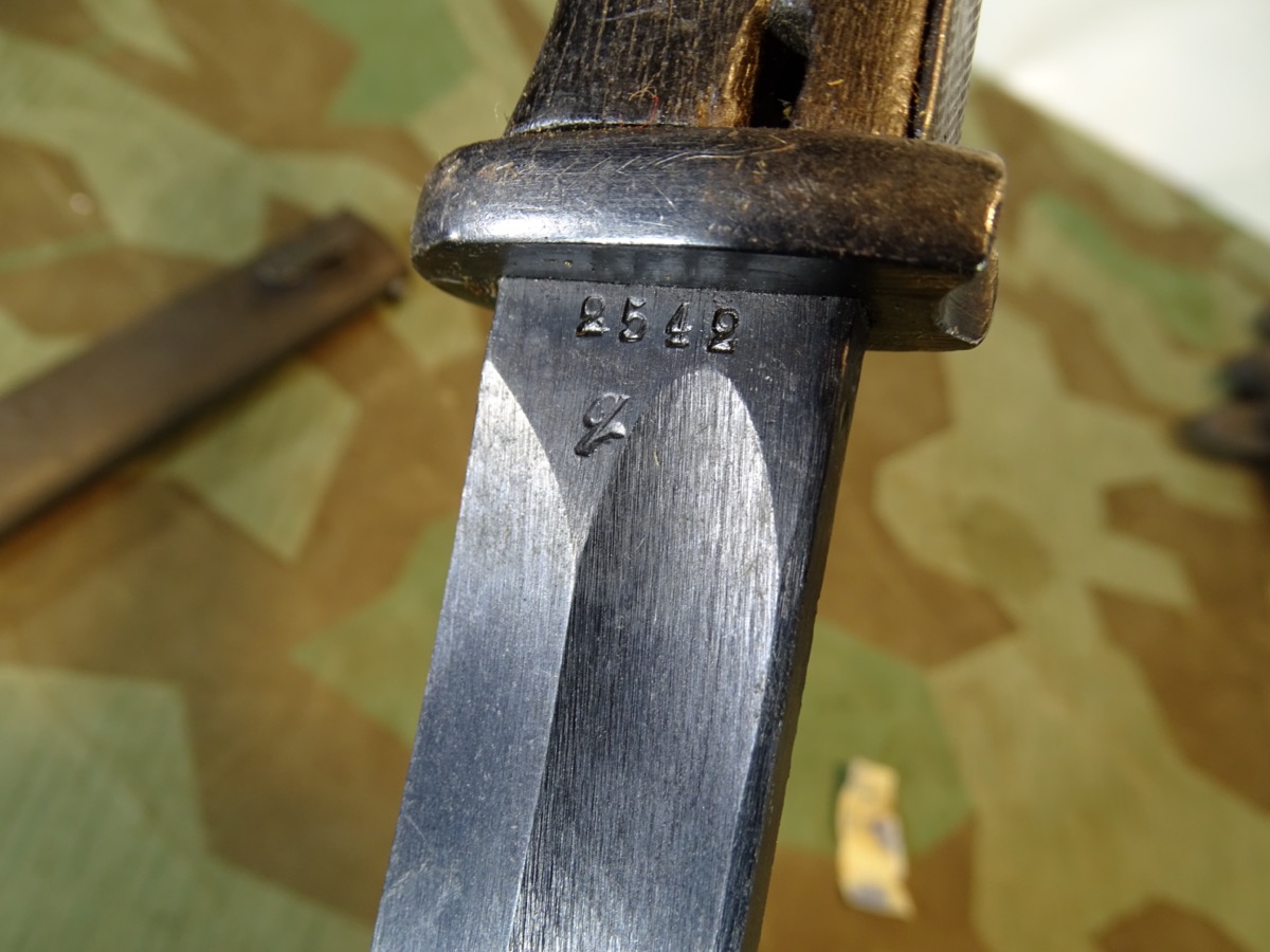 Seltener Hersteller, Staatliche Waffenfabrik Chatellerault Frankreich. Produktionszeit von diesem Hersteller waren nur die Jahre 1941-44. Bajonettdrücker klappt einwandfrei. Klinge mit schönem, klaren Herstellerstempel jwh, Klingenrücken mit 43 für 1943. Klinge noch fast komplett dunkel originalbrünniert, Griff und Scheide auch noch schön brüniert. Scheide mit Herstellermarke Elite Diamant 39 . Guter, leicht getragener Zustand, siehe Fotos. Bei Bestellung bitte Altersnachweis schicken oder mailen ( Kopie vom gültigen Personalausweis)
